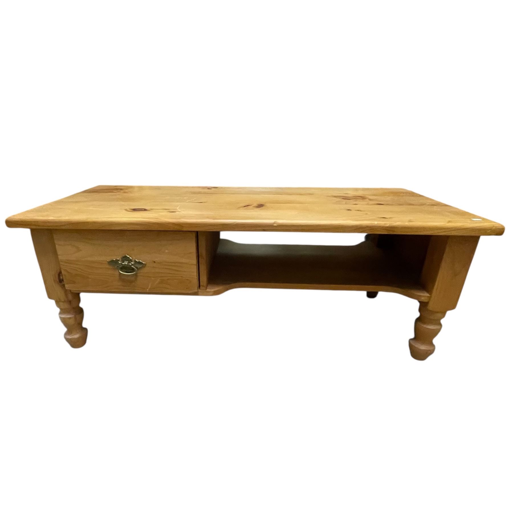 Rustic country coffee table crafted from pine, featuring turned legs and storage drawers. Design is similar to styles known for farmhouse-inspired aesthetics and functionality. Item is as pictured.