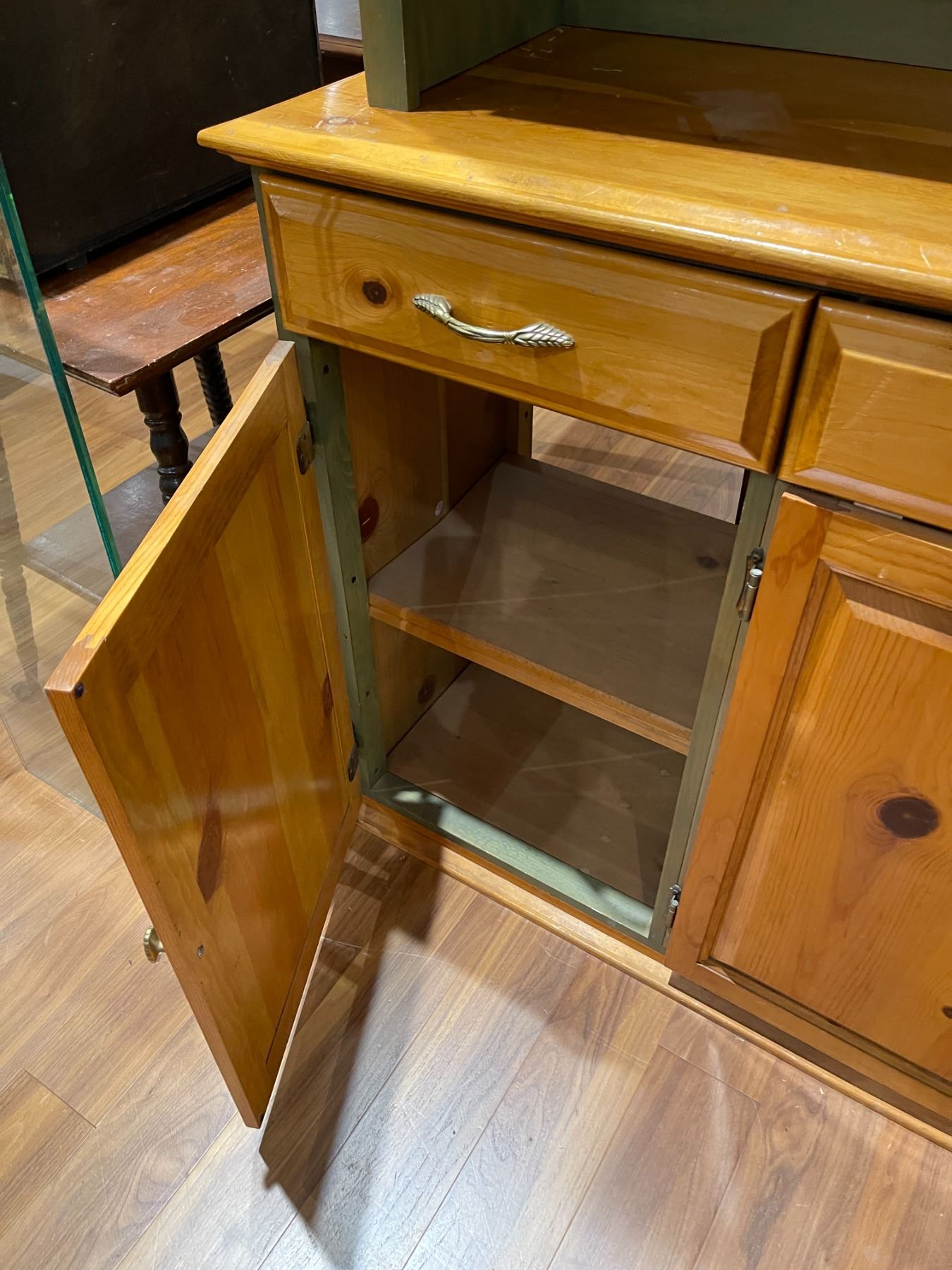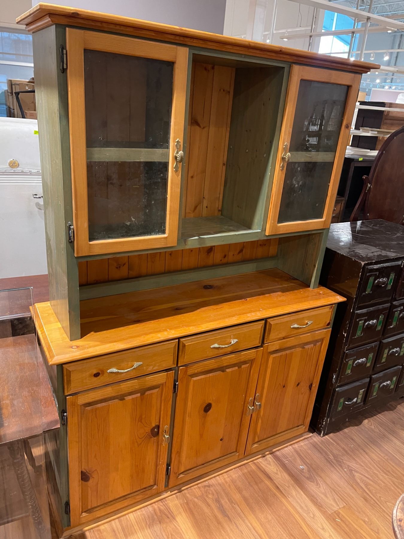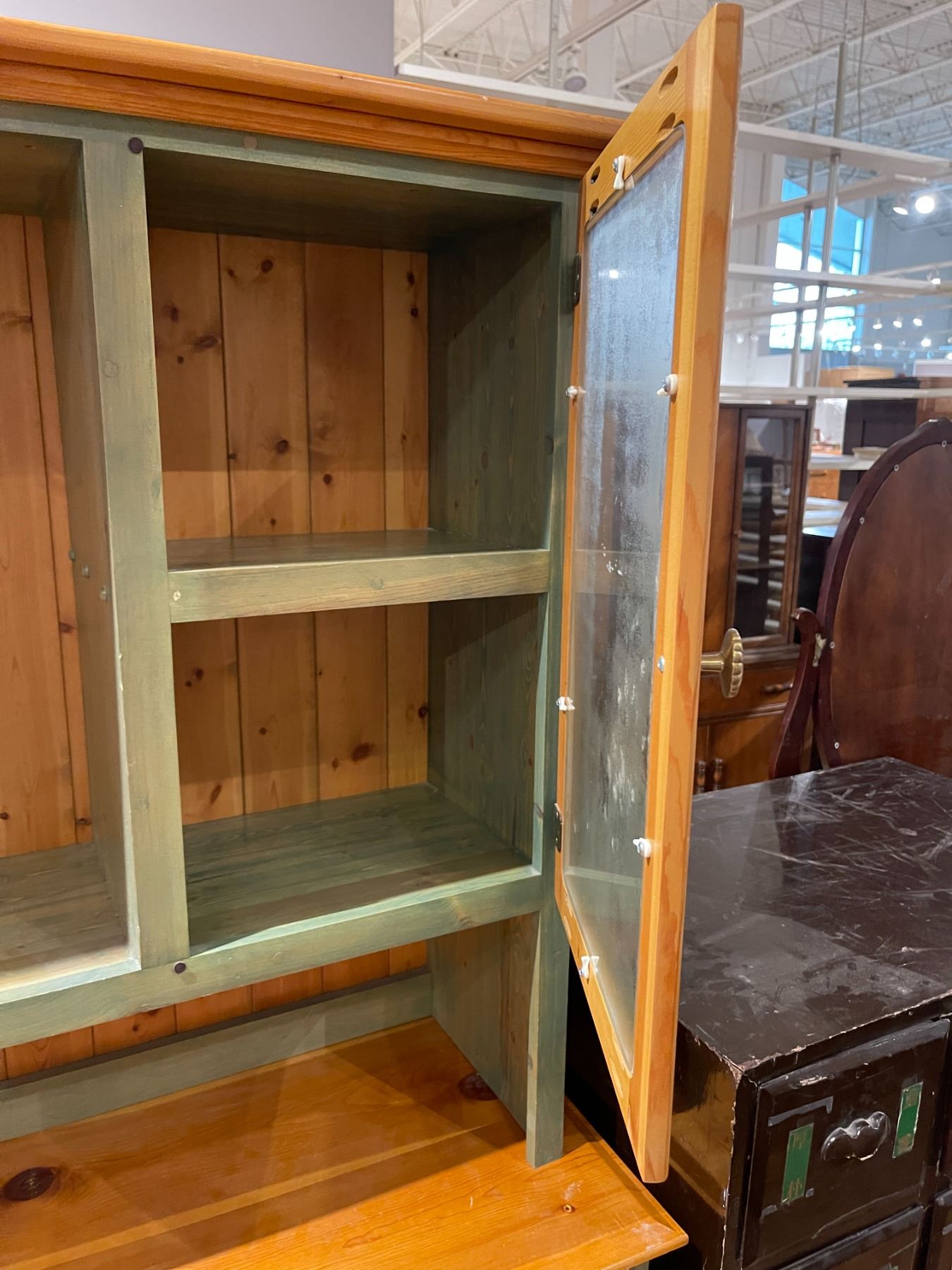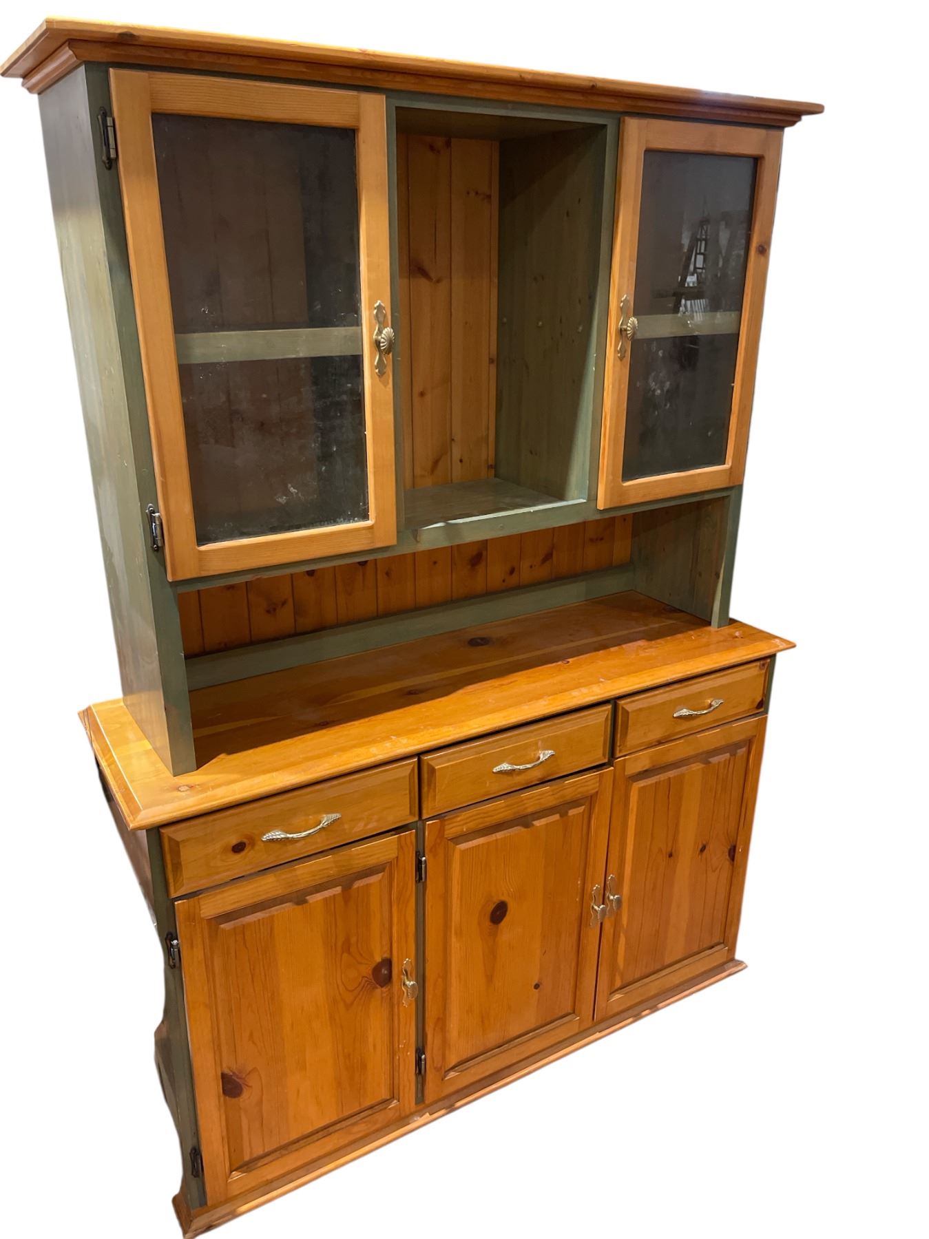 Rustic pint kitchen hutch cabinet in a two-piece design with a green wash colour applied to the sides. The unit measures 53.5 in length, 17 in width, and 73.5 in height. Features a functional and stylish design suitable for kitchen storage or display. Item is as pictured.