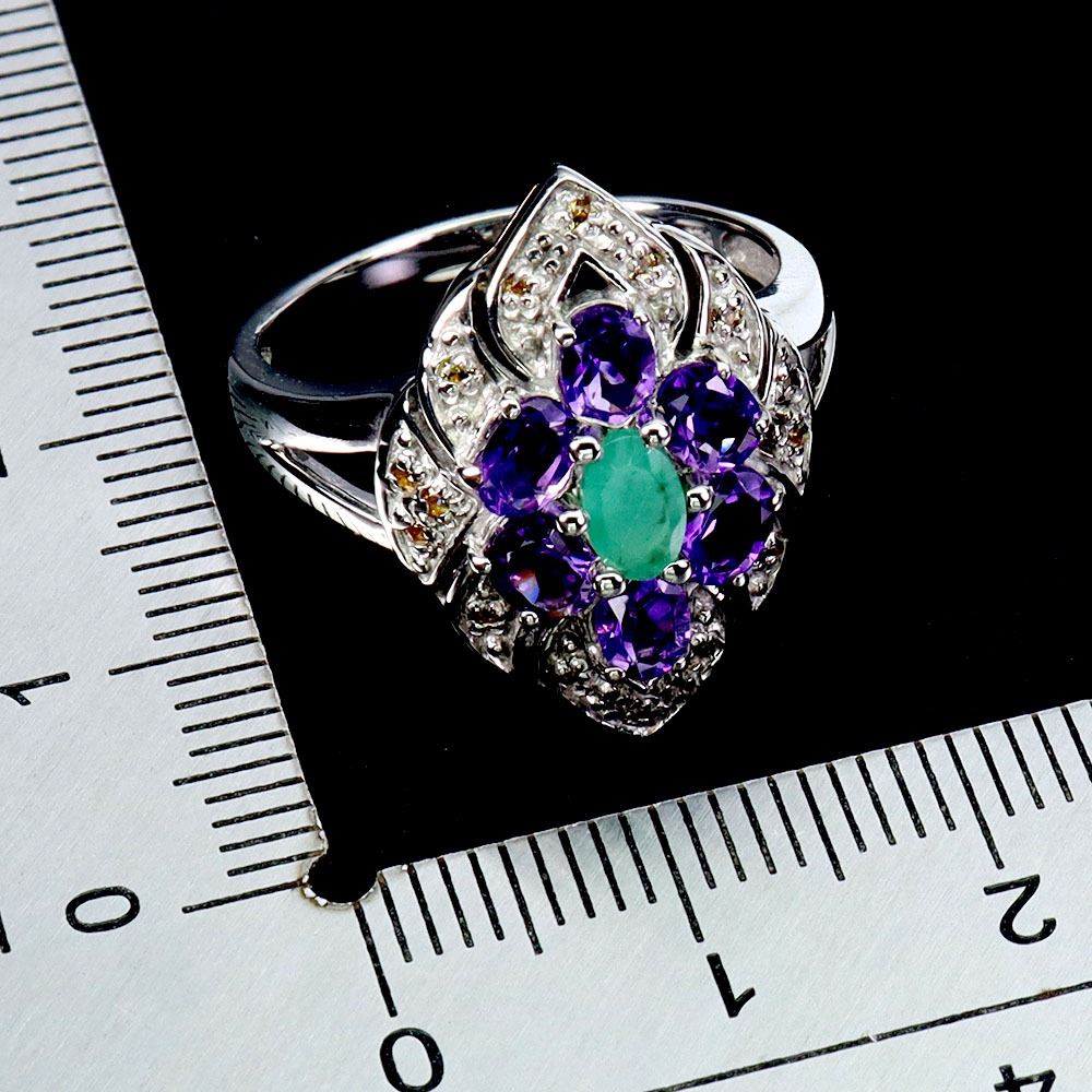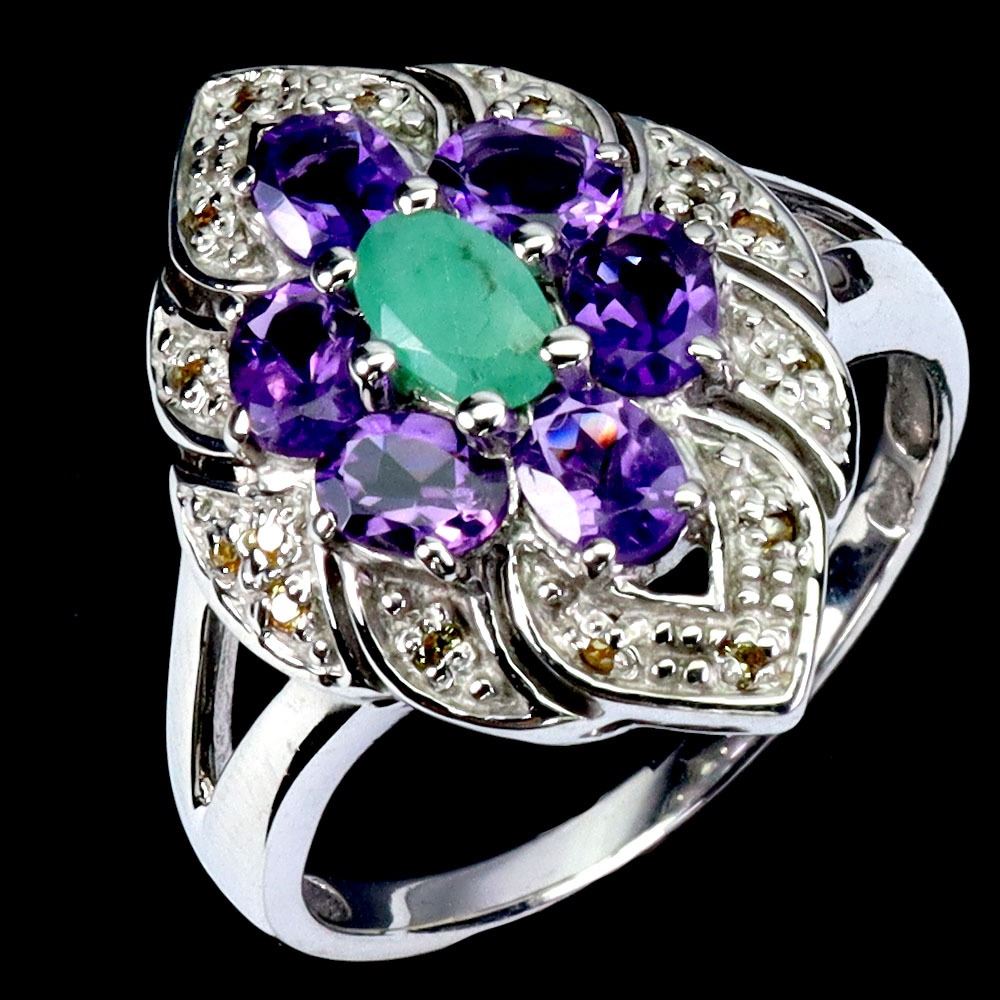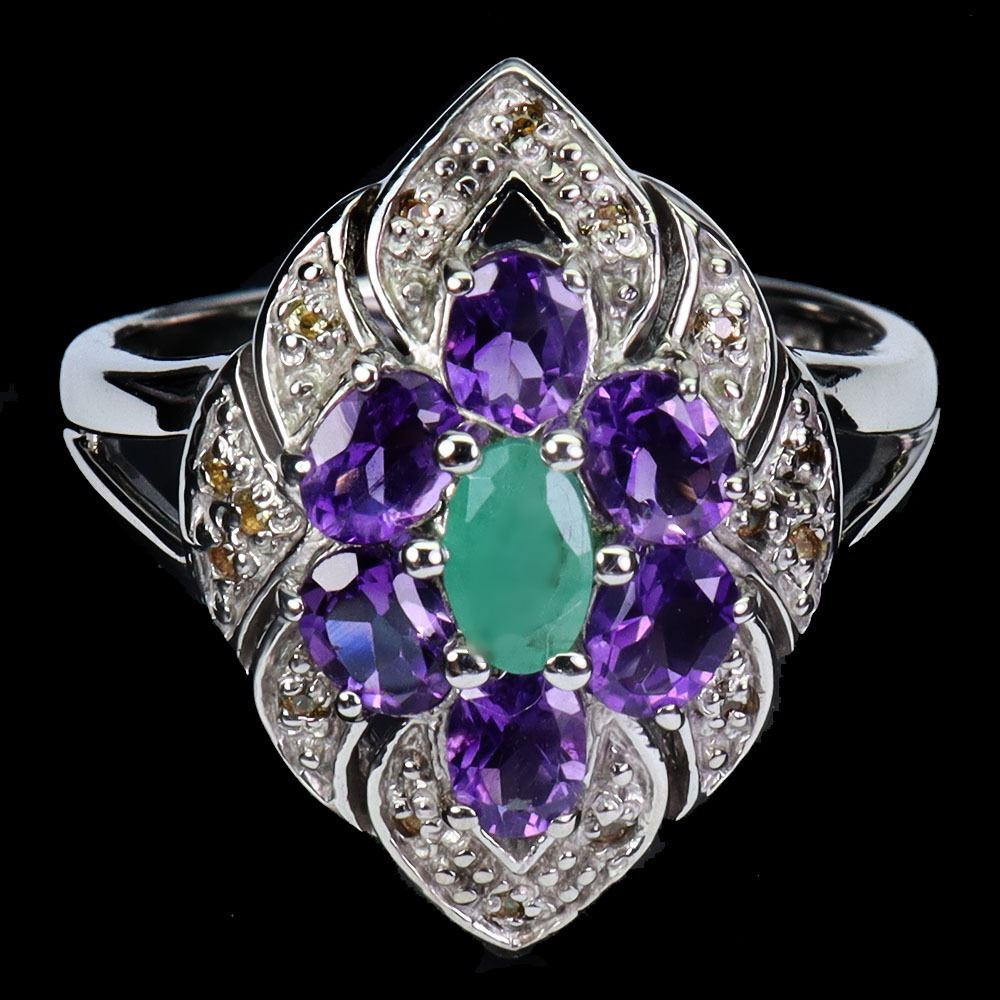 SOPHISTICATED EMERALD, AMETHYST AND SAPPHIRES RING IN 14K WHITE PLATED GOLD OVER 925 STERLING SILVER - SIZE 7 - APPRAISED REPLACEMENT VALUE CAD 810