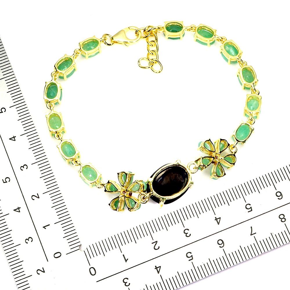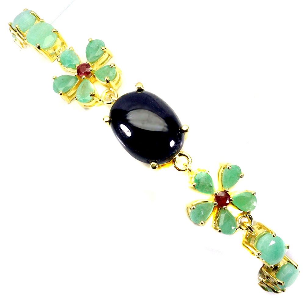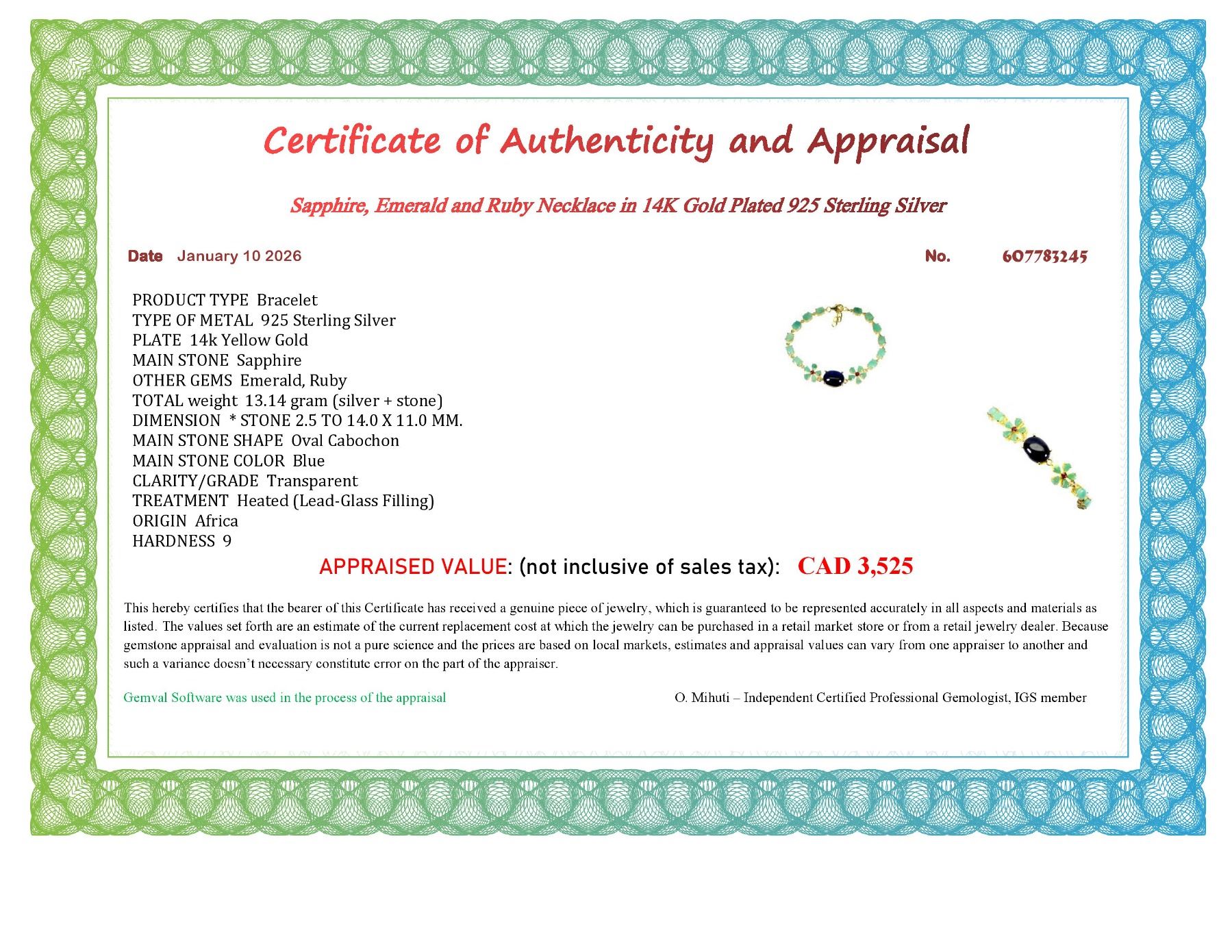 STUNNING BIG 14X11 mm BLUE SAPPHIRE, EMERALD AND RUBY BRACELET IN 14K YELLOW PLATED GOLD OVER 925 STERLING SILVER - 8 INCHES - APPRAISED REPLACEMENT VALUE CAD 3,525