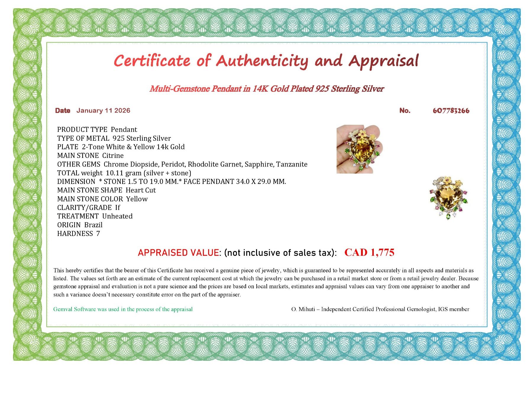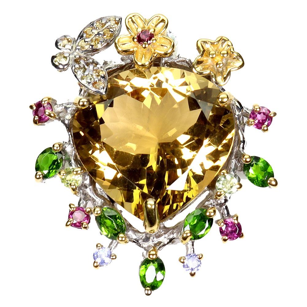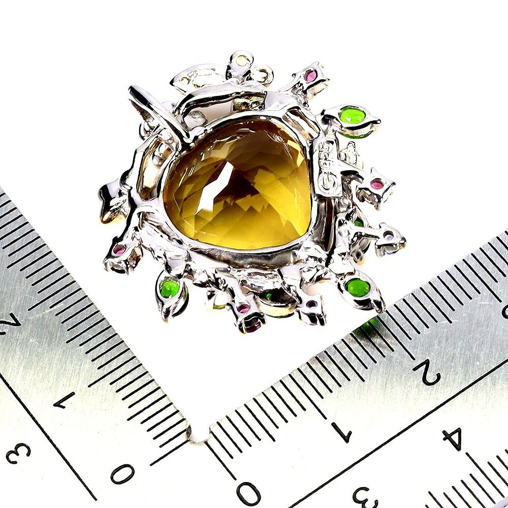 STUNNING BIG 25 CARATS HEART CUT CITRINE, CHROME DIOPSIDE, PERIDOT, RHODOLITE GARNET, SAPPHIE AND TANZANITE PENDANT IN 14K WHITE PLATED GOLD OVER 925 STERLING SILVER - APPRAISED REPLACEMENT VALUE CAD 1,775