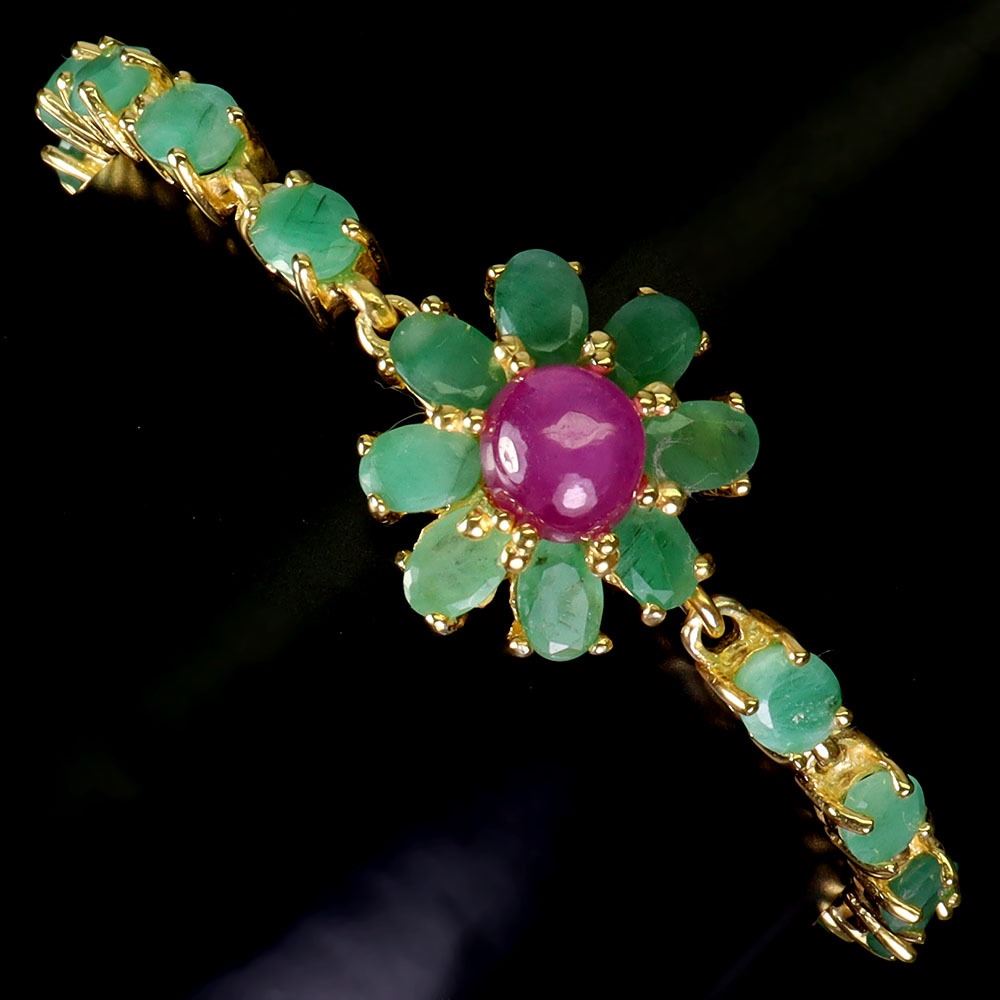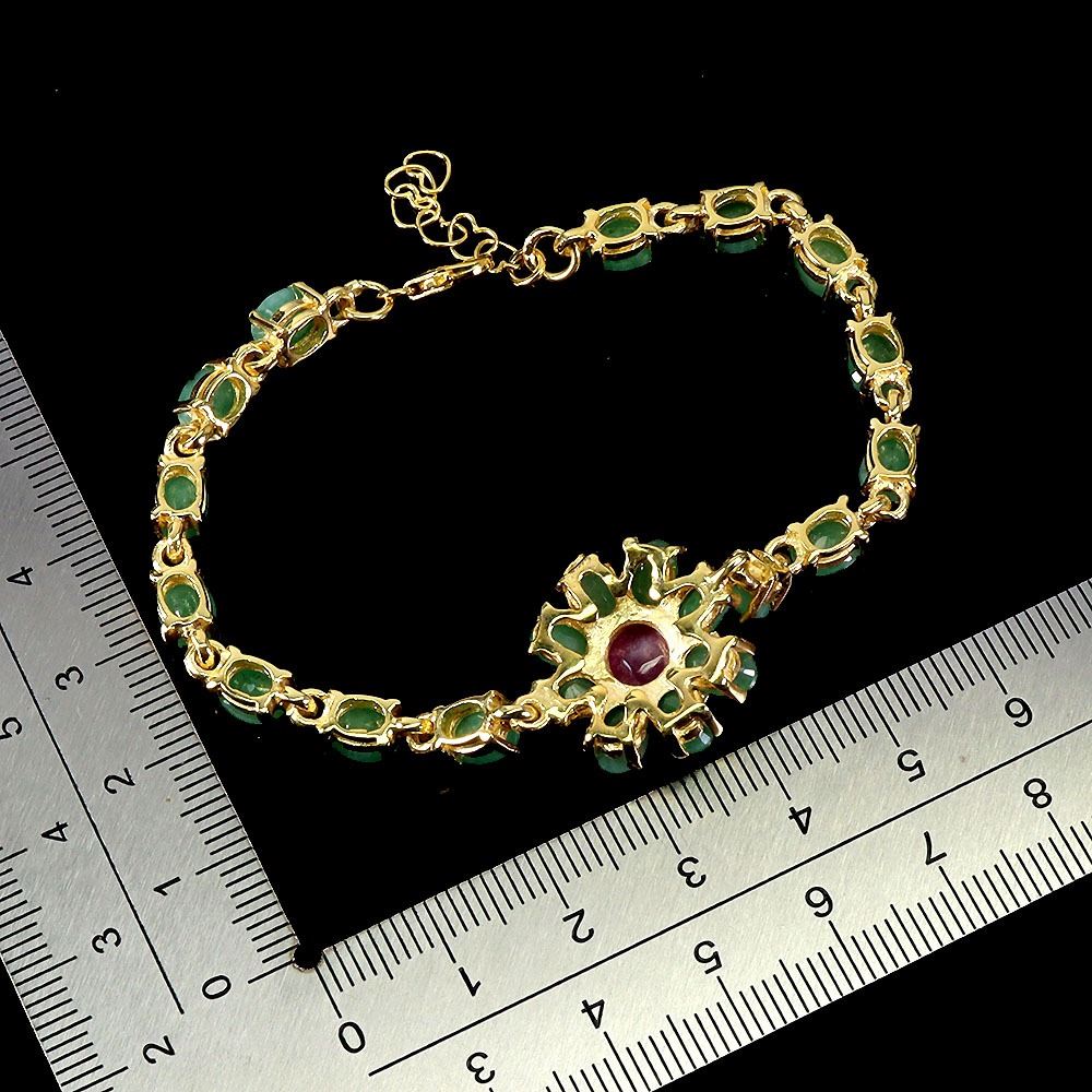 SUPERB 8 mm OVAL CUT EMERALD AND BIG ROUND RUBY BRACELET IN 14K YELLOW GOLD PLATED OVER 925 STERLING SILVER - APPRAISED REPLACEMENT VALUE CAD 3,300