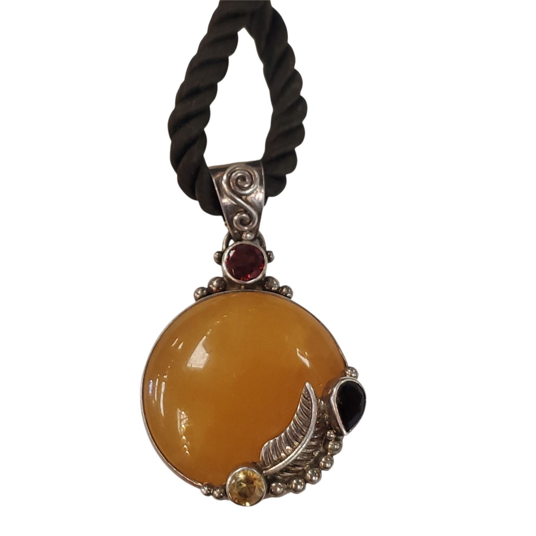 Sajen Sterling Silver Honey Agate Pendant with Accent Stones on Cord * 1" diameter pendant