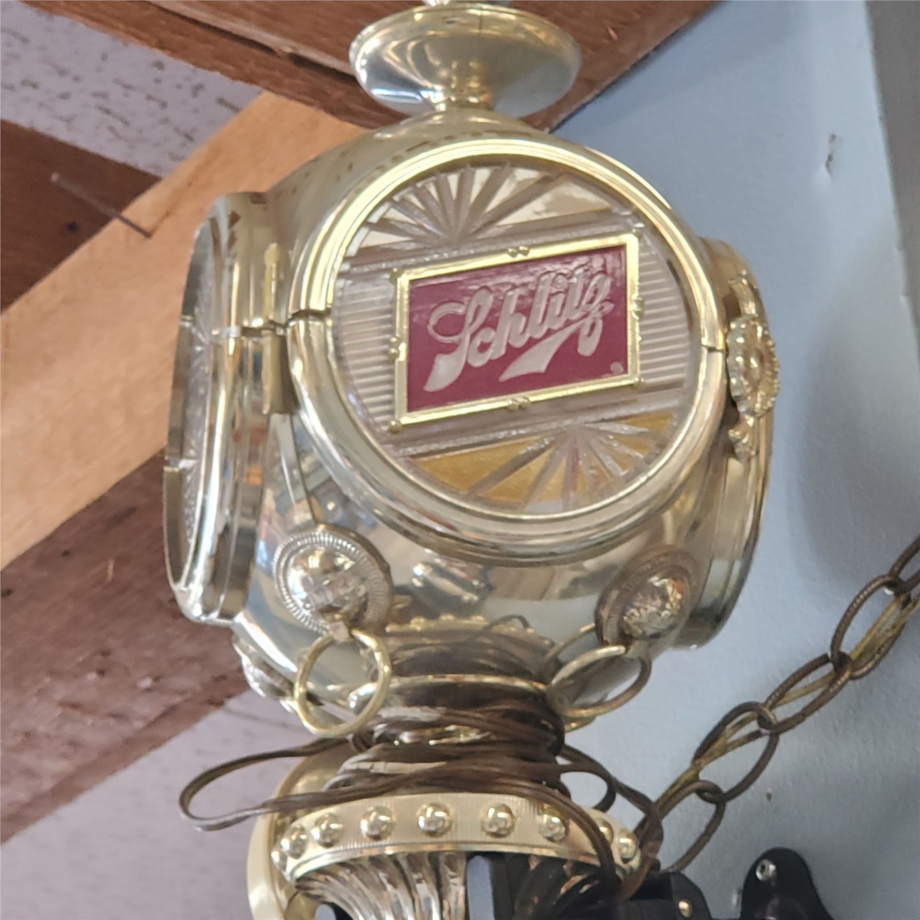 Schlitz bar advertising lantern measuring 21-Inch tall. Features Schlitz branding and complete components. Authentic vintage bar advertising display. Item is as pictured.