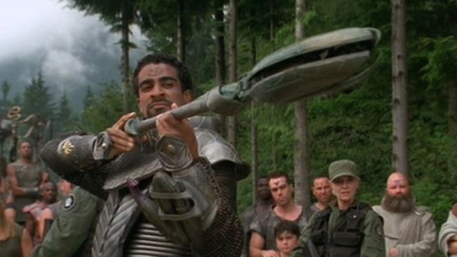 The ma'tok staff weaponis the primary energy weapon of the Goa'uld and Jaffa in Stargate SG-1, designed as a "weapon of terror" to intimidate enemies with powerful plasma blasts. It is a long, 7–8 foot, staff powered by liquid naquadah, featuring a head that opens to fire and a paddle for melee combat.