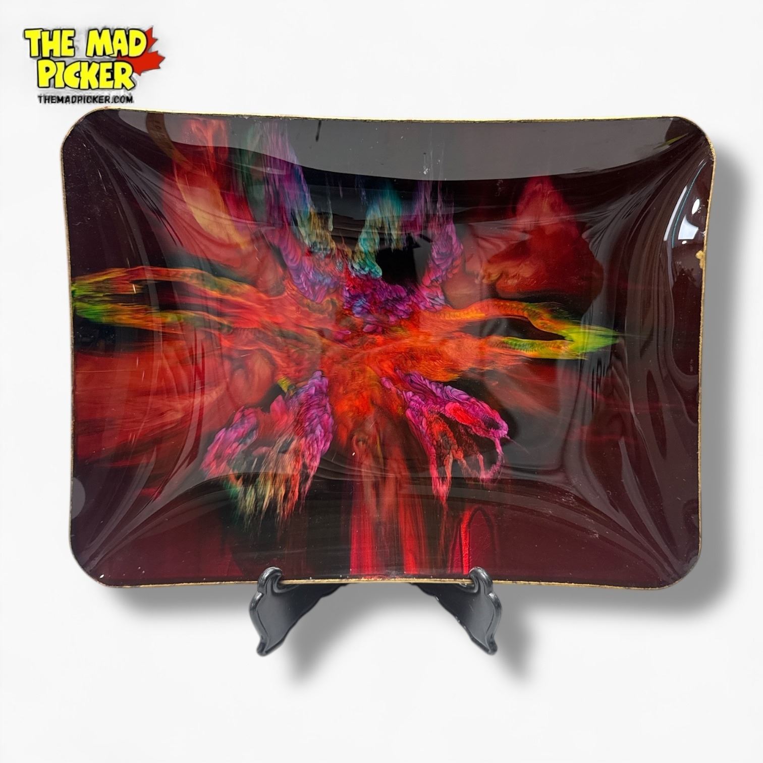 Vintage Seetusee art glass tray by Mayfair Glassware, Canada, circa 1960-1975. Mid-Century Modern hand-painted piece showcasing unique design details. Measures approximately 15.5 x 11.5 inches. Known for its craftsmanship during the era, this tray highlights Mayfair's signature artistry.
