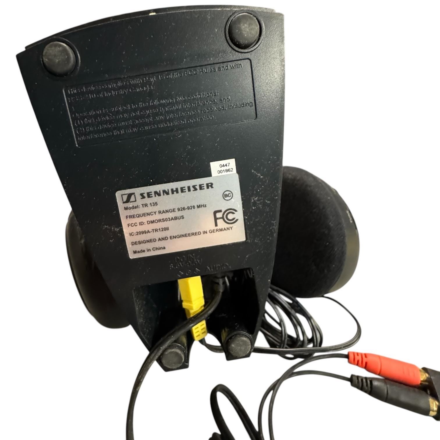 Sennheiser TR135 wireless headphones designed for TV or audio listening. Includes a transmitter that doubles as a charging dock. Features adjustable volume, balance control, and interference-free reception via infrared technology. Compatible with a variety of audio devices. Item is as pictured.
