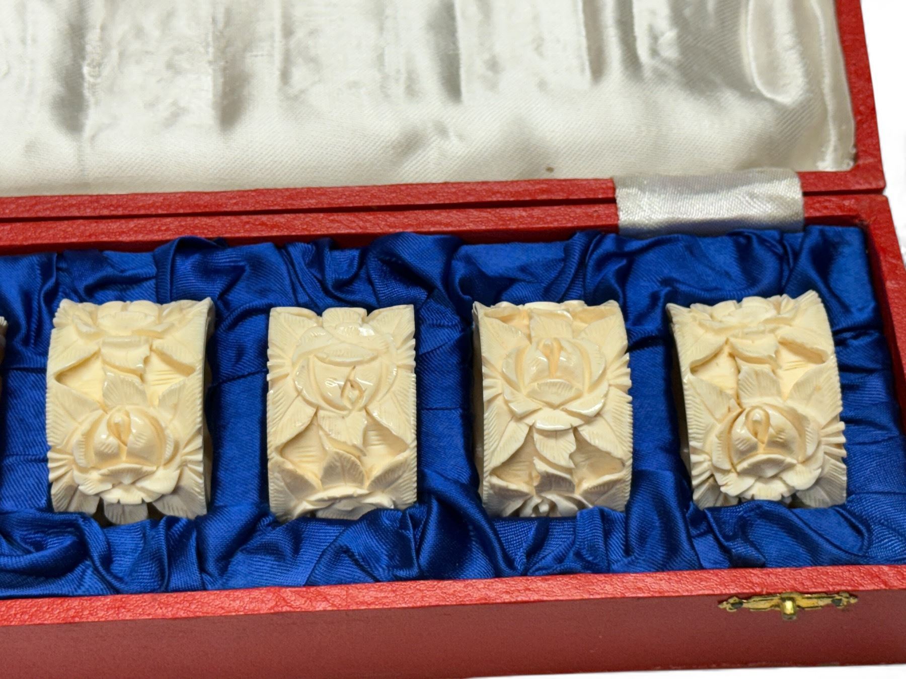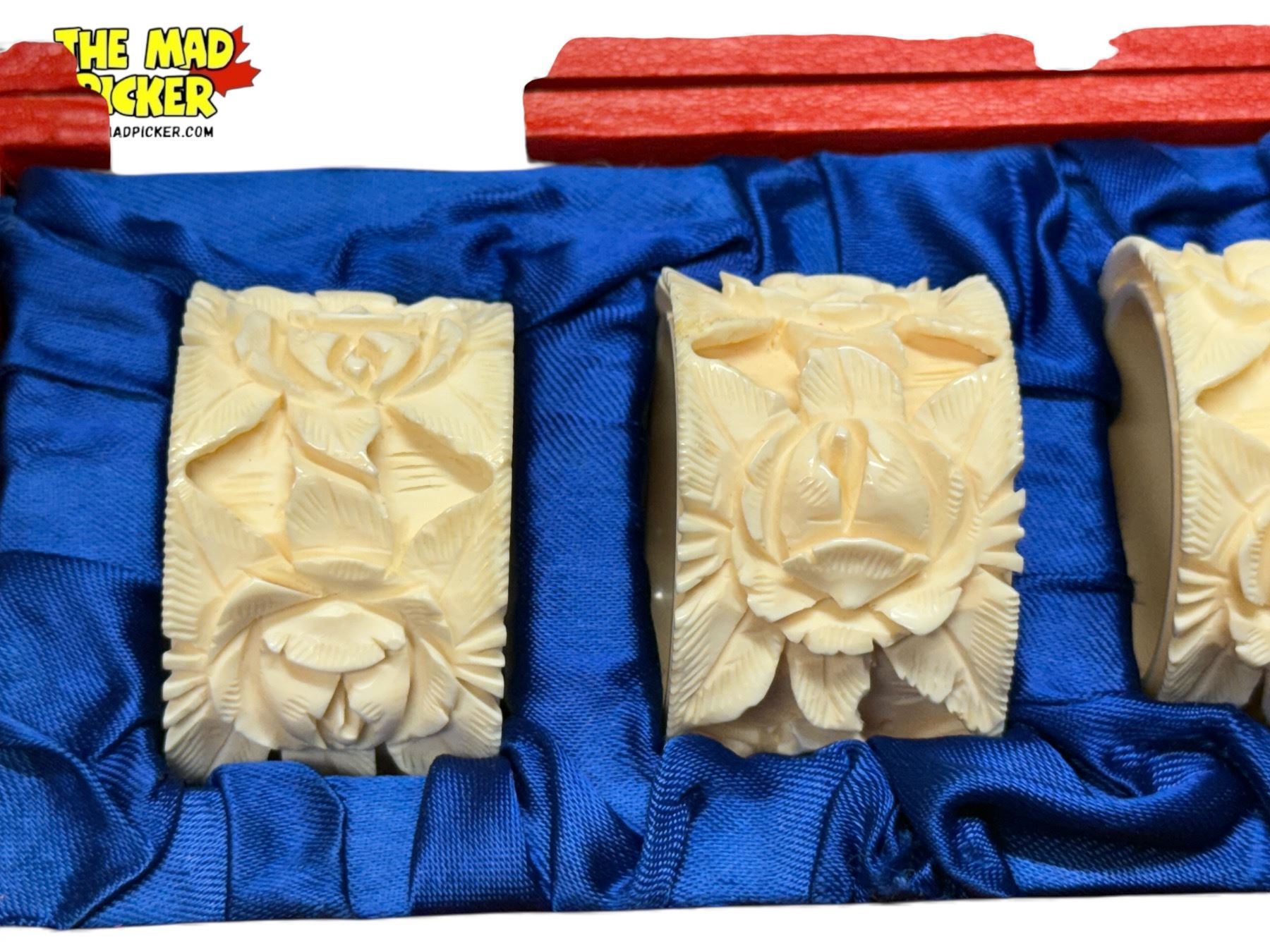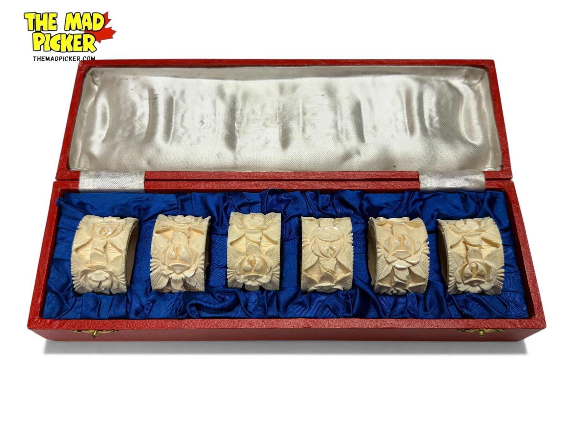Set Of 6x Antique Carved Ivory Napkin rings With Original Box