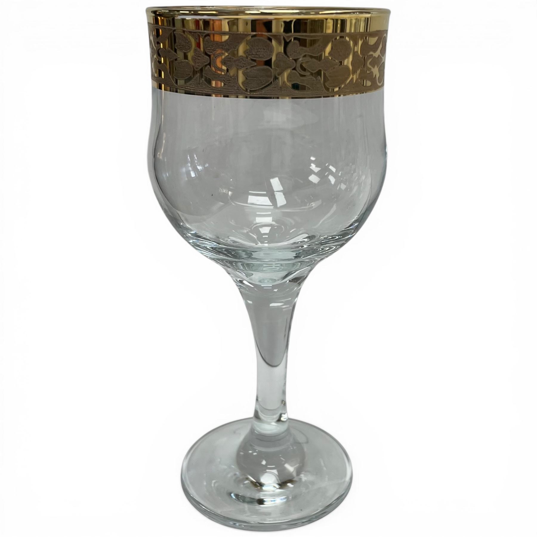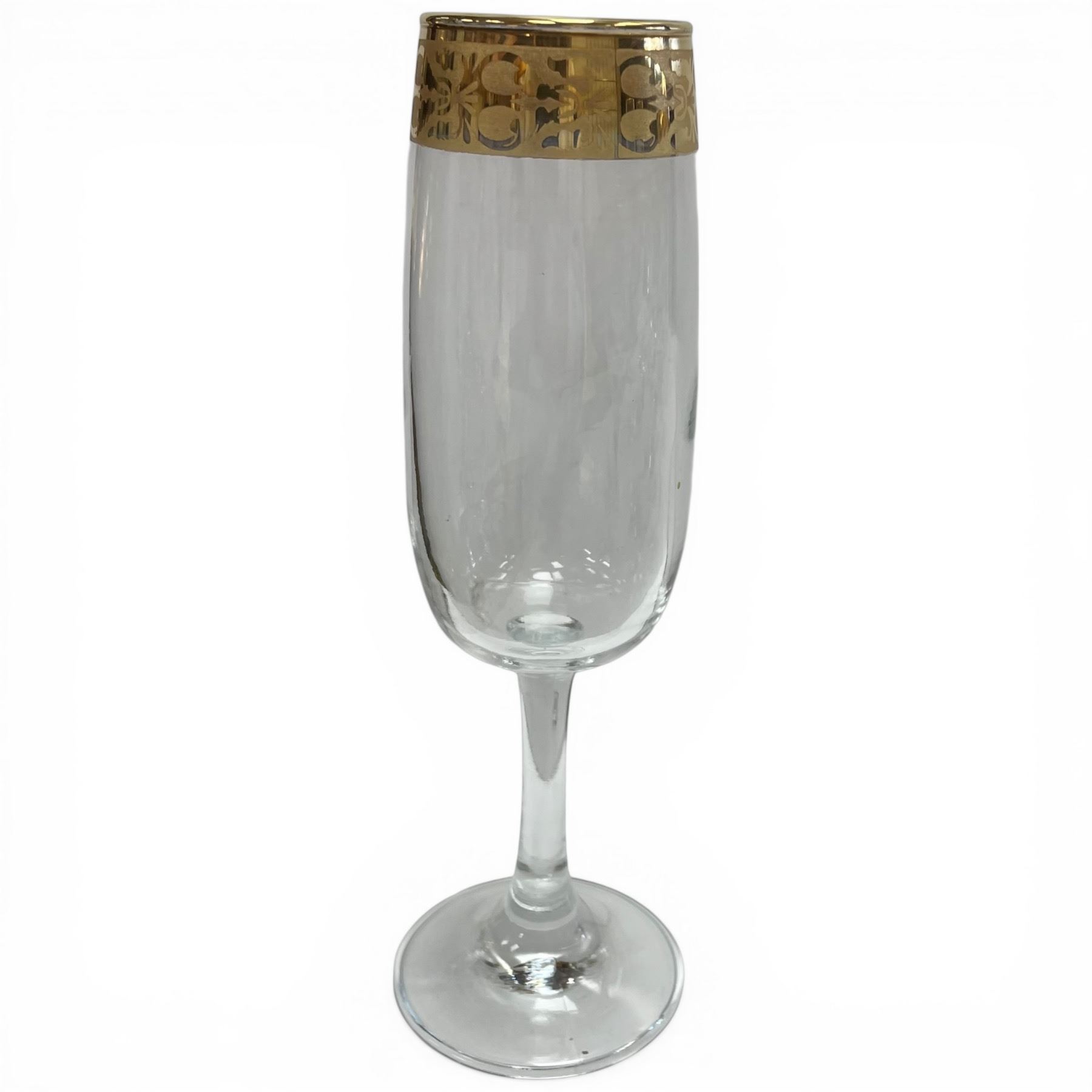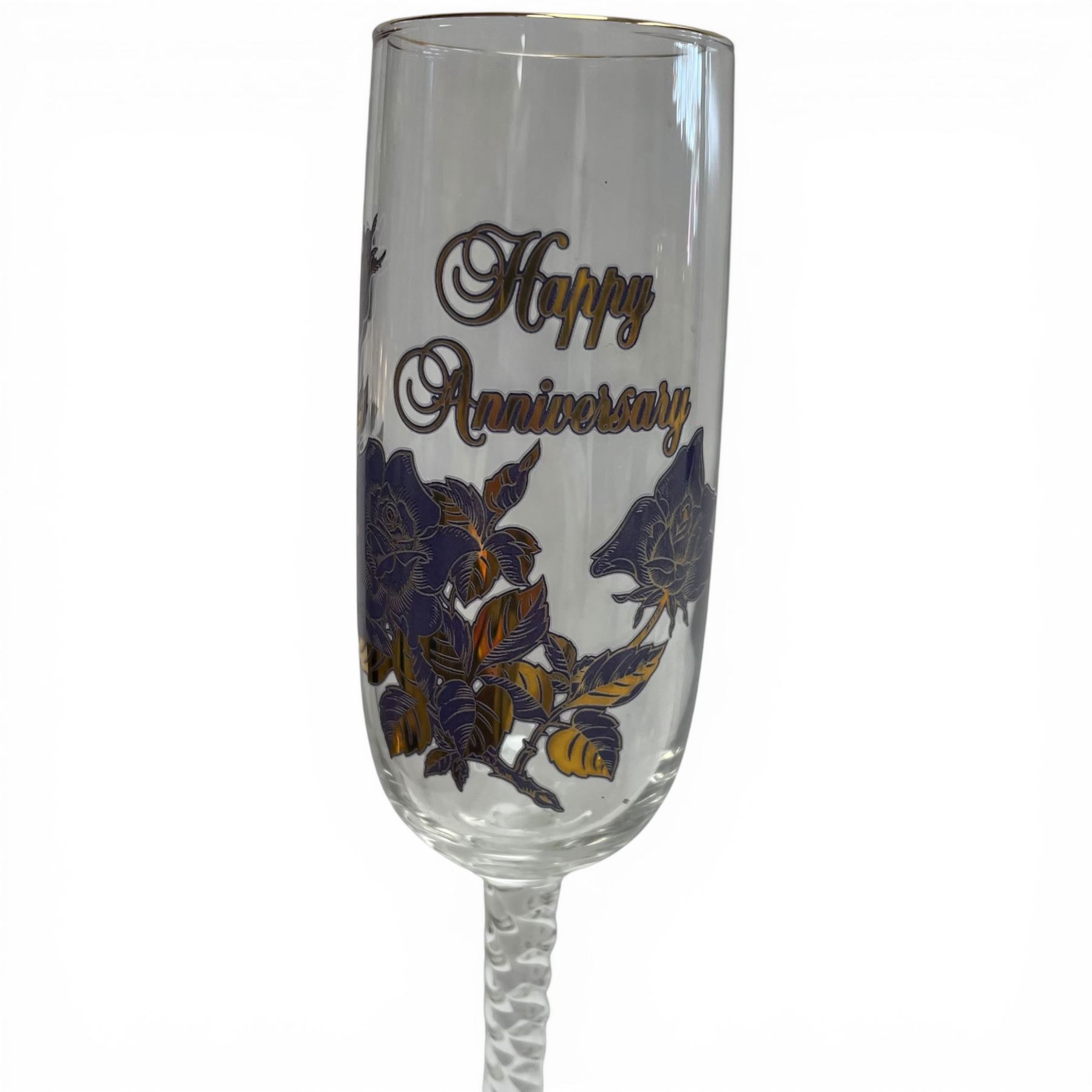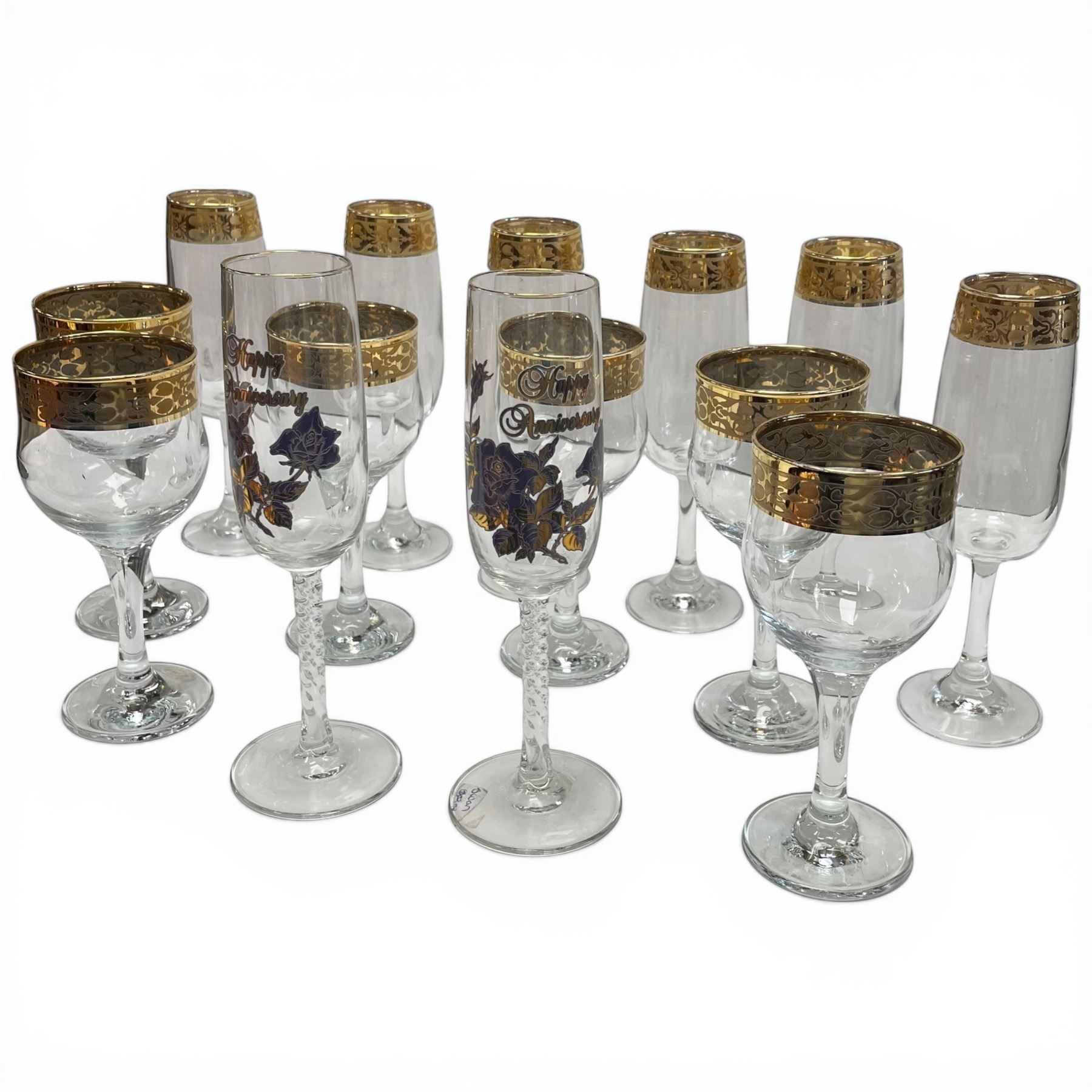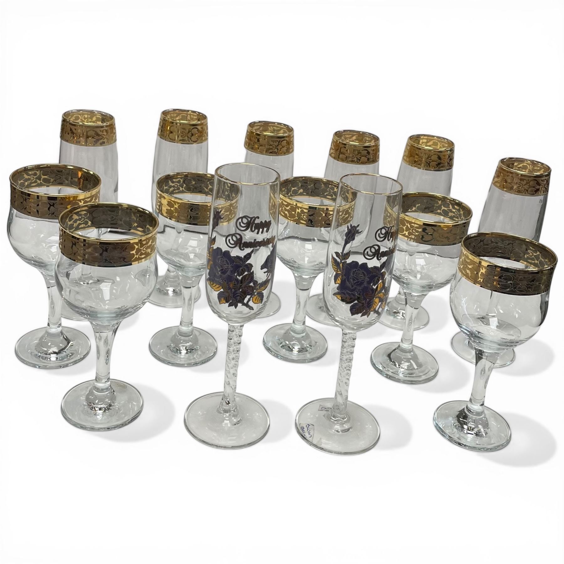 Set of 12 Gold Rimmed Crystal Wine Glasses & Flutes, Believed to be Pasabahce, Turkey (Includes a pair of Happy Anniversary flutes)