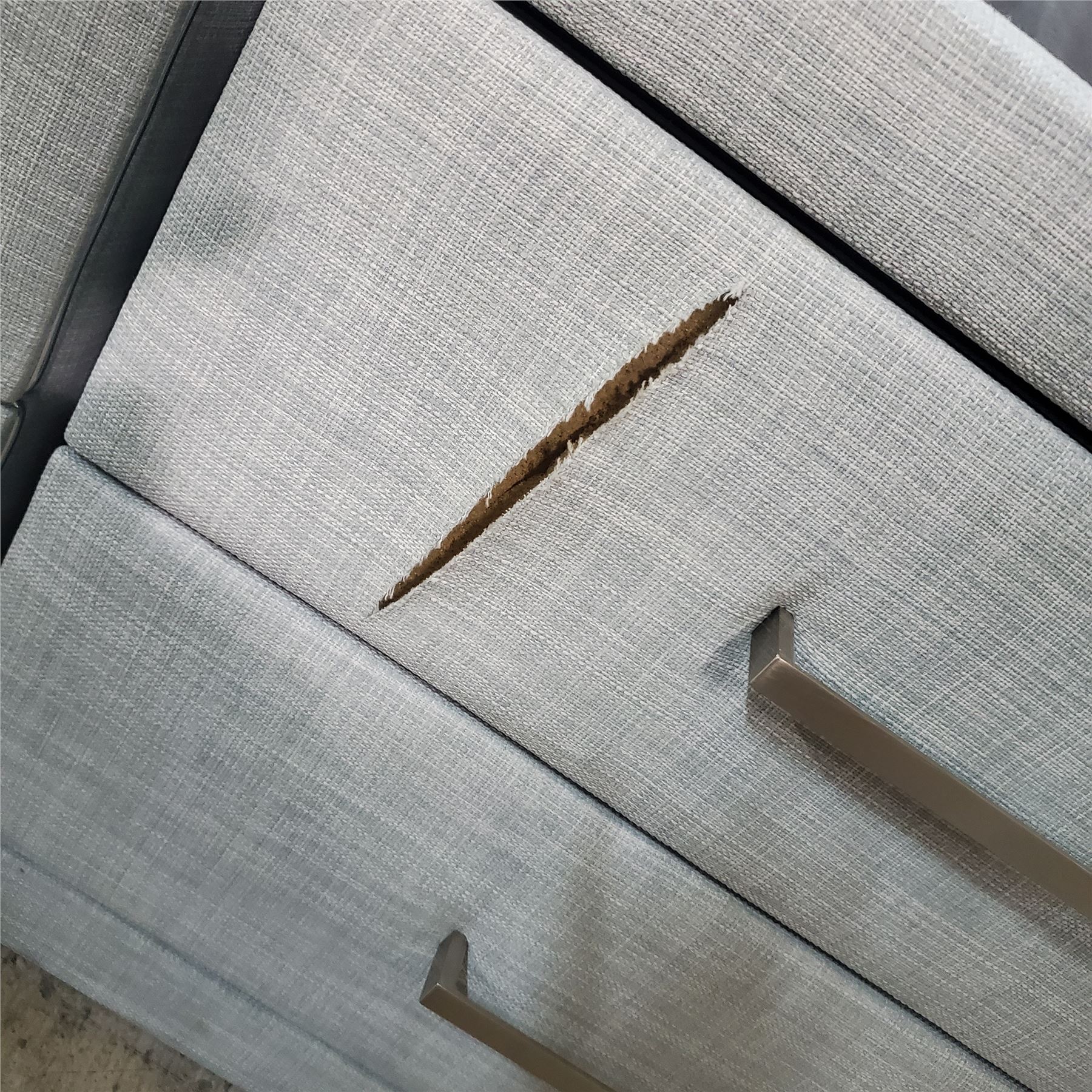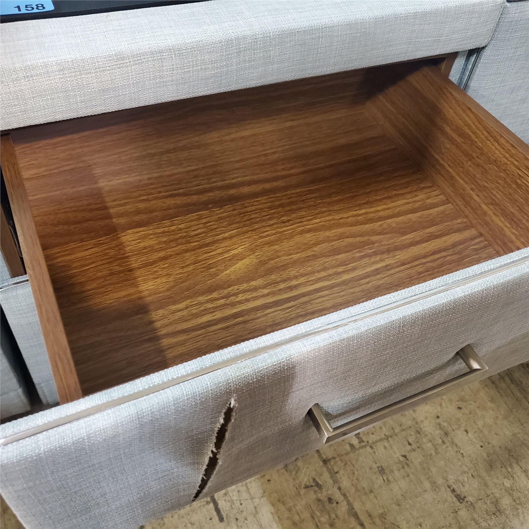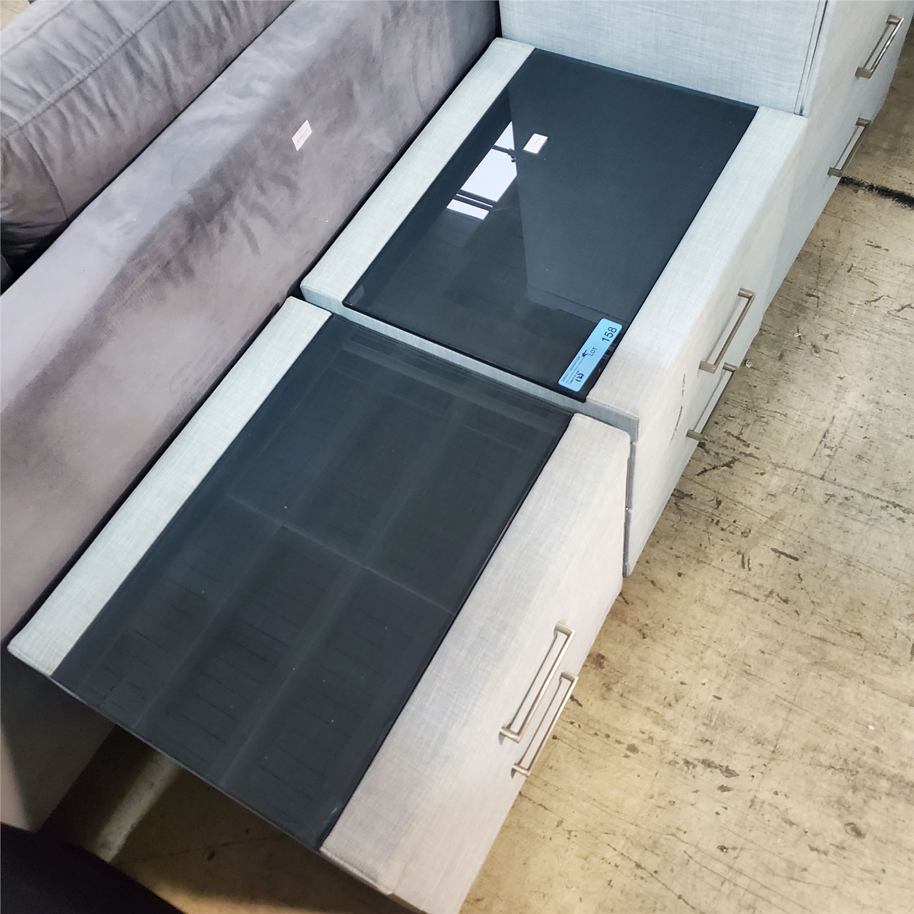 Set of 2 Light Grey Textured Fabric Nightstands with Glass Top, Approx. H18.5" x W19.5" x D18" Each (Condition: 1 tear on the front)