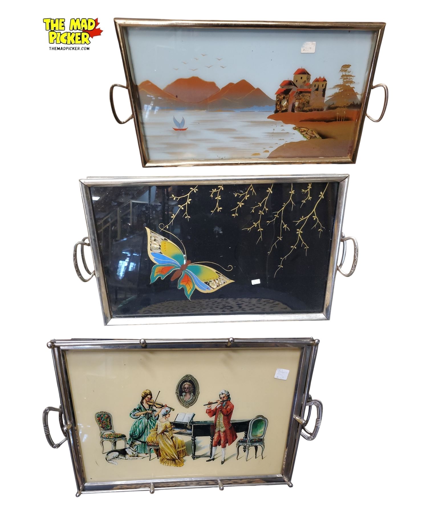 Set of 3 vintage reverse painted glass trays from the Art Deco to mid-20th century period. Features metal frames and handles. Designs include a scenic landscape, butterfly motif possibly incorporating real butterfly wings (a technique linked to Brazilian art), and musicians playing instruments. Unique depth given by glass painting on reverse.