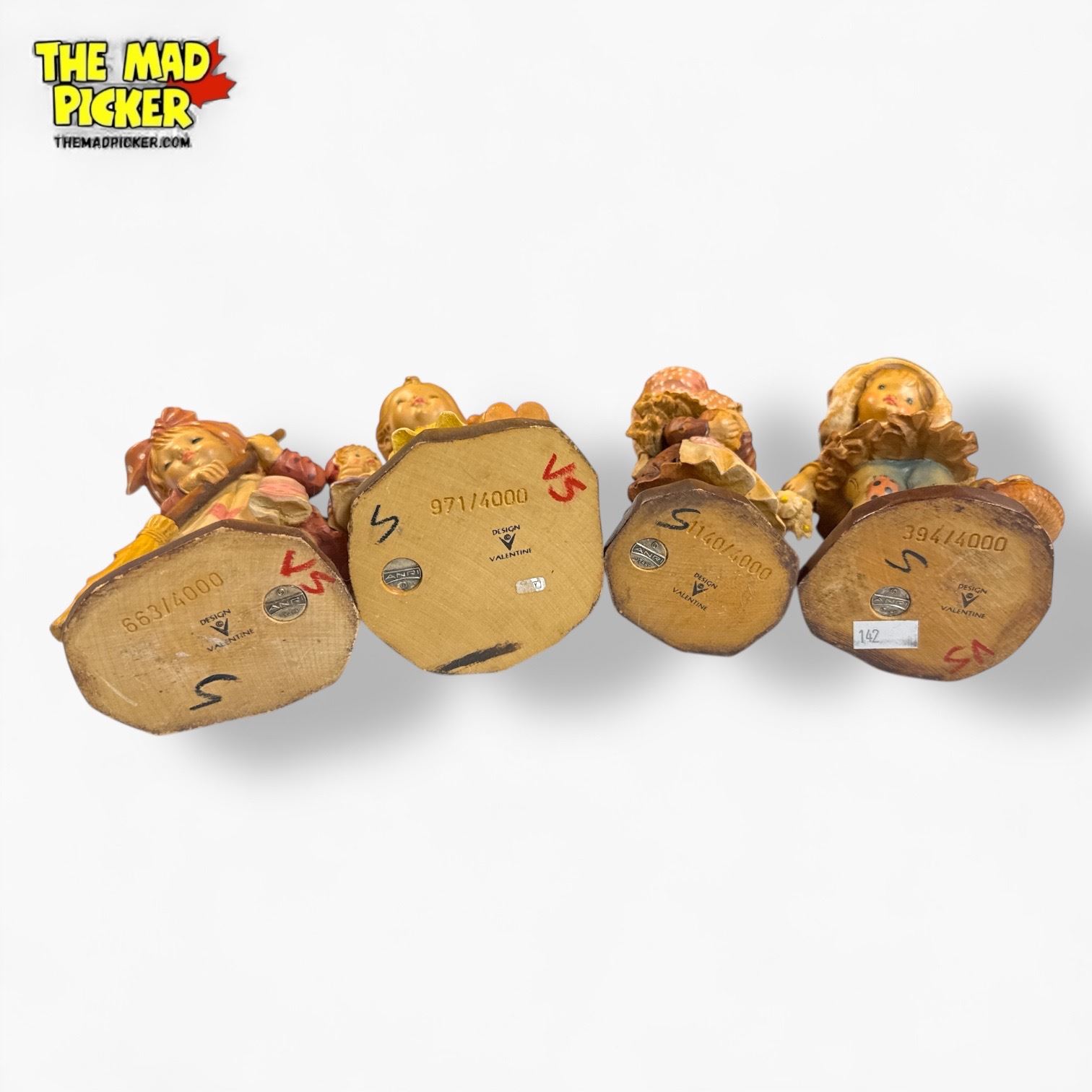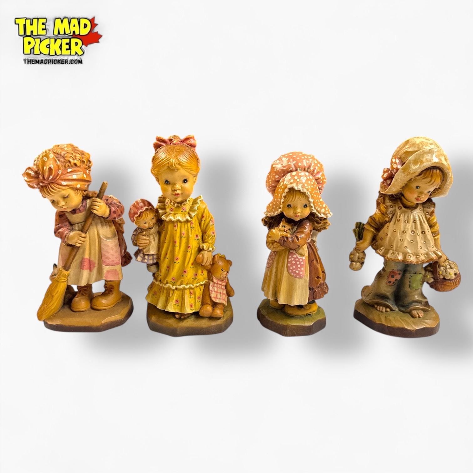 Set of 4 vintage Anri Sarah Kay wood-carved figurines from Italy. Designed by Australian artist Sarah Kay, these hand-carved, hand-painted figures depict nostalgic childhood scenes. Each piece often includes the Anri metal logo emblem on the base. Part of a discontinued 20th-century collectible series.