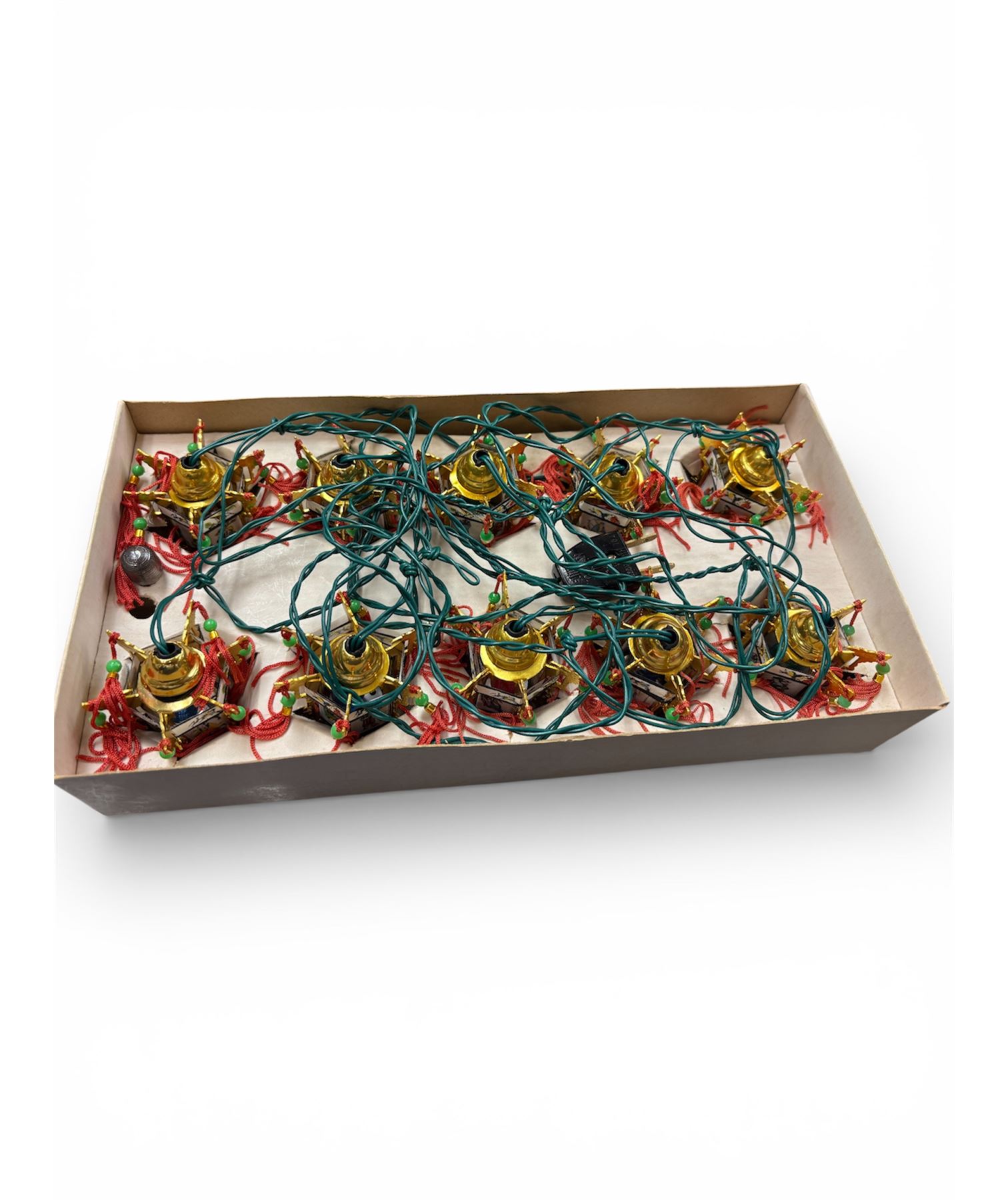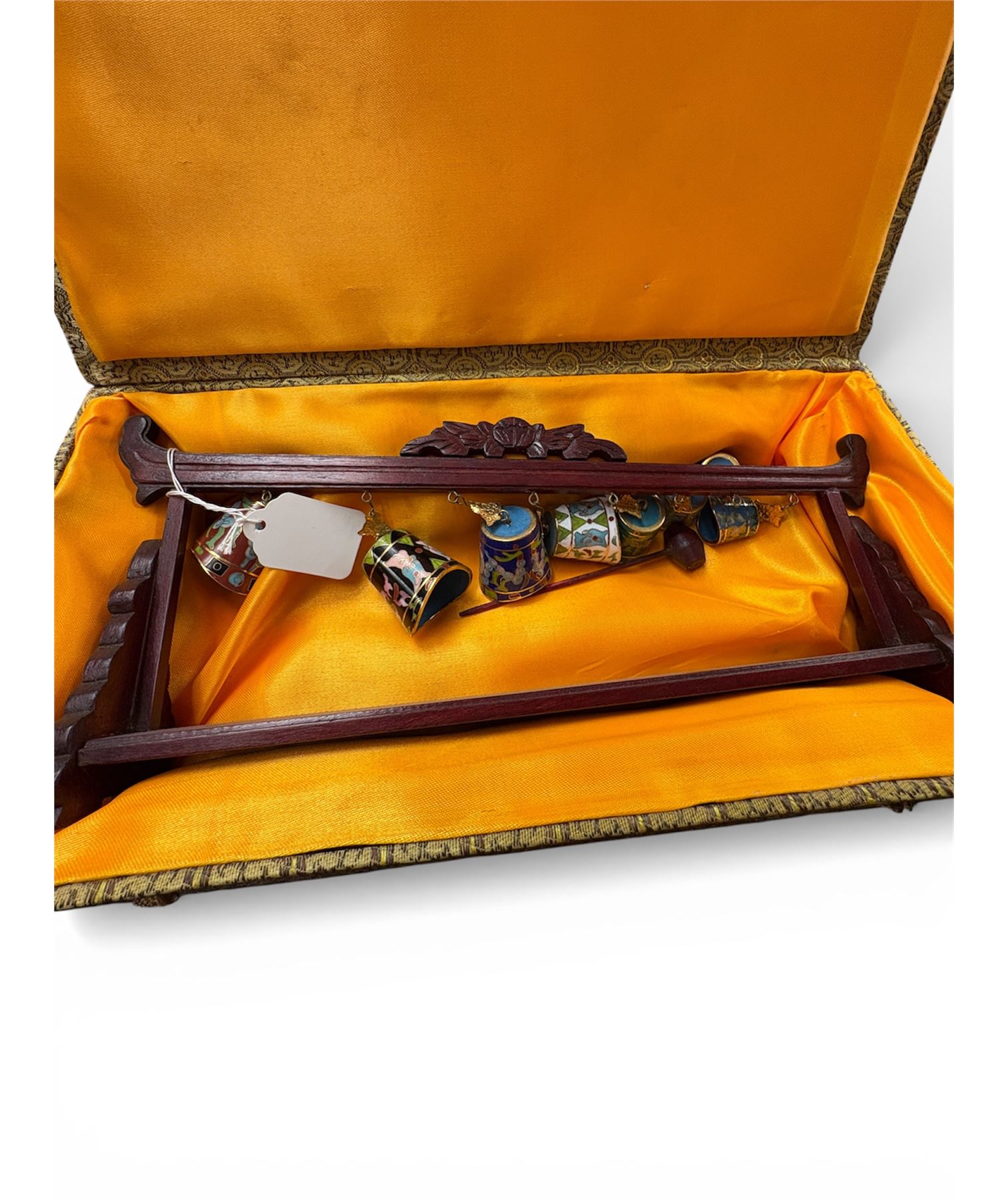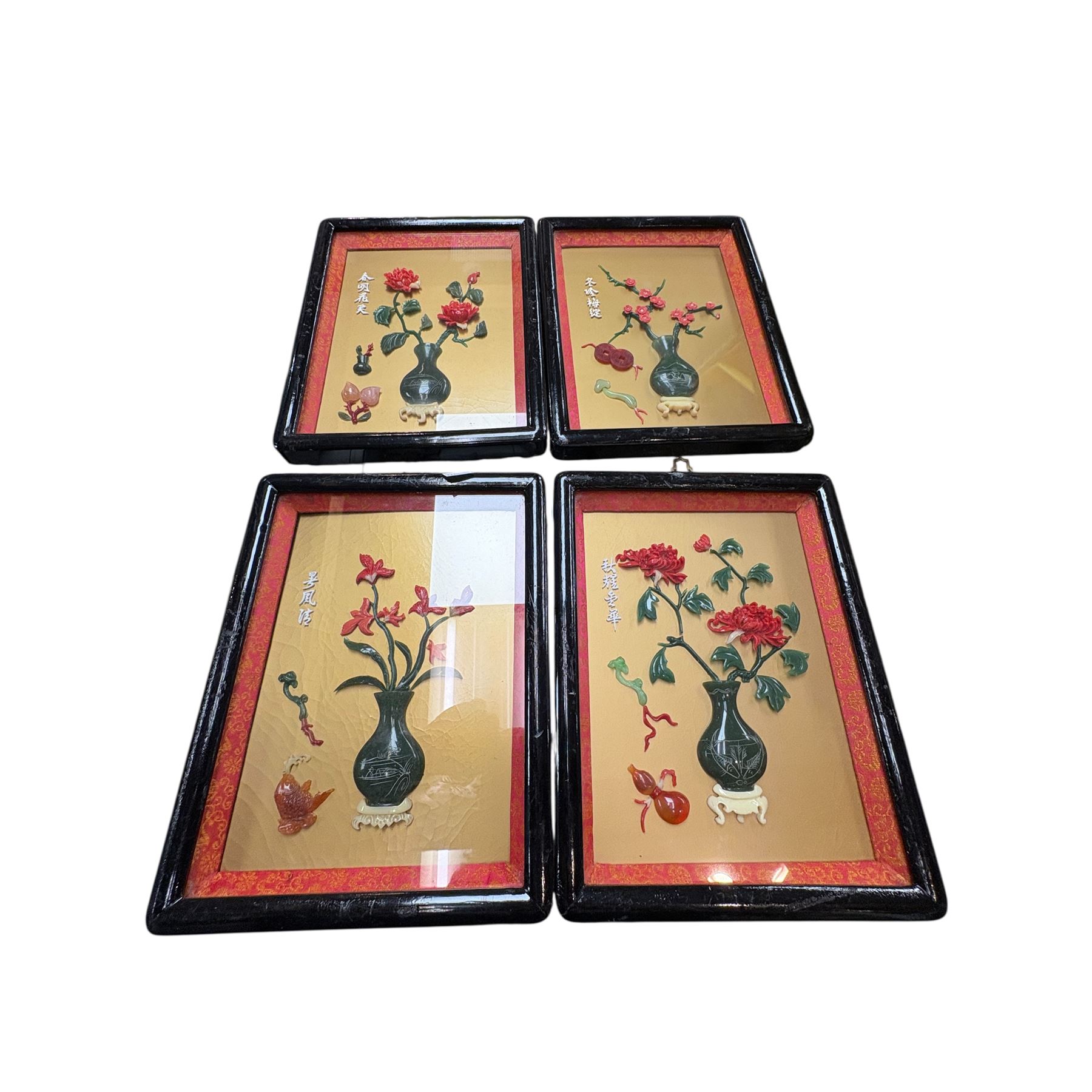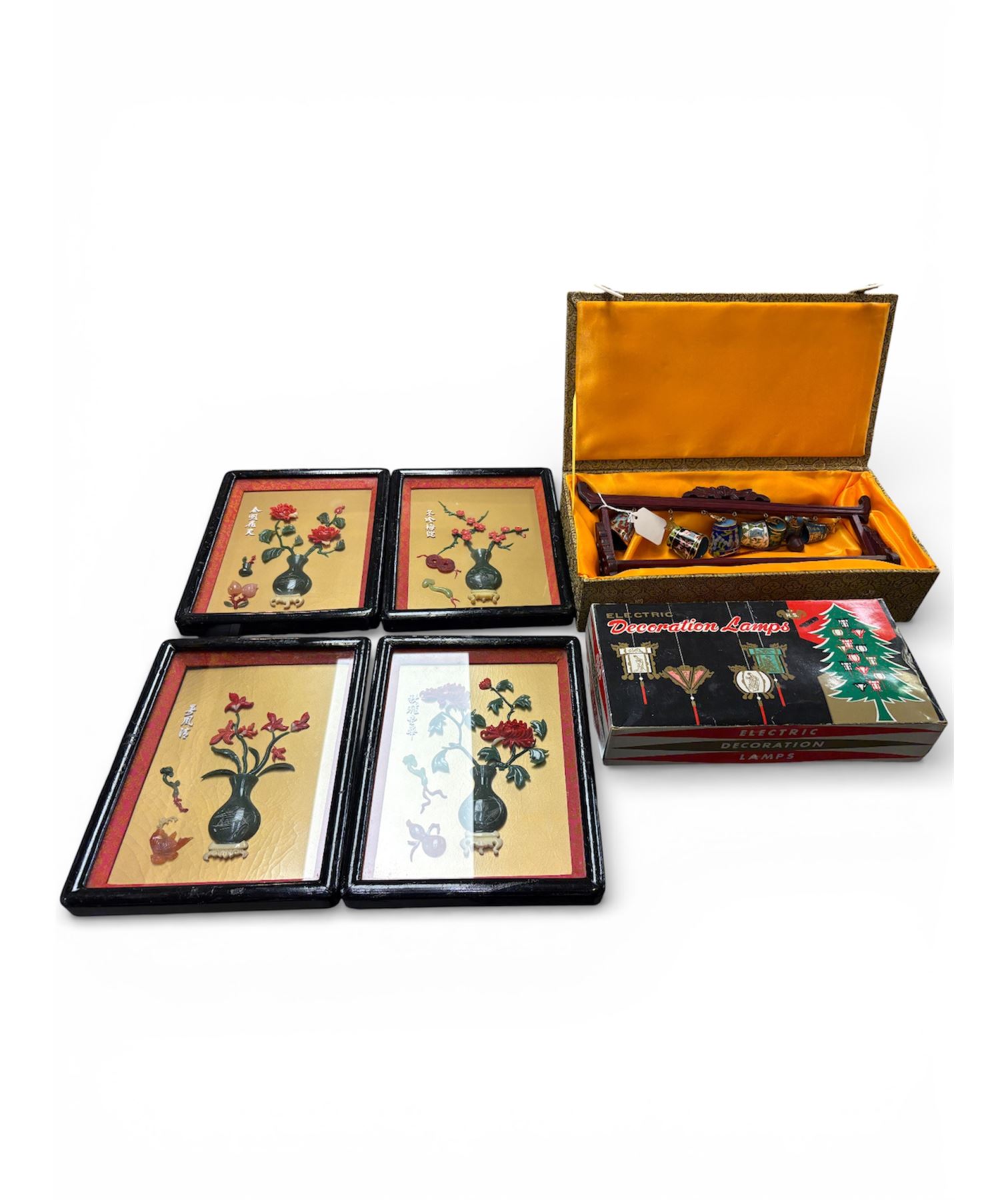 Set of 4 Chinoiserie artwork panels featuring inlaid semi-precious stones in Asian design motifs. Includes two sets of vintage decorative string lights with Chinese lantern-style electric lamps. Also features a cloisonne bell set mounted within a wooden frame. Origin and era unspecified.