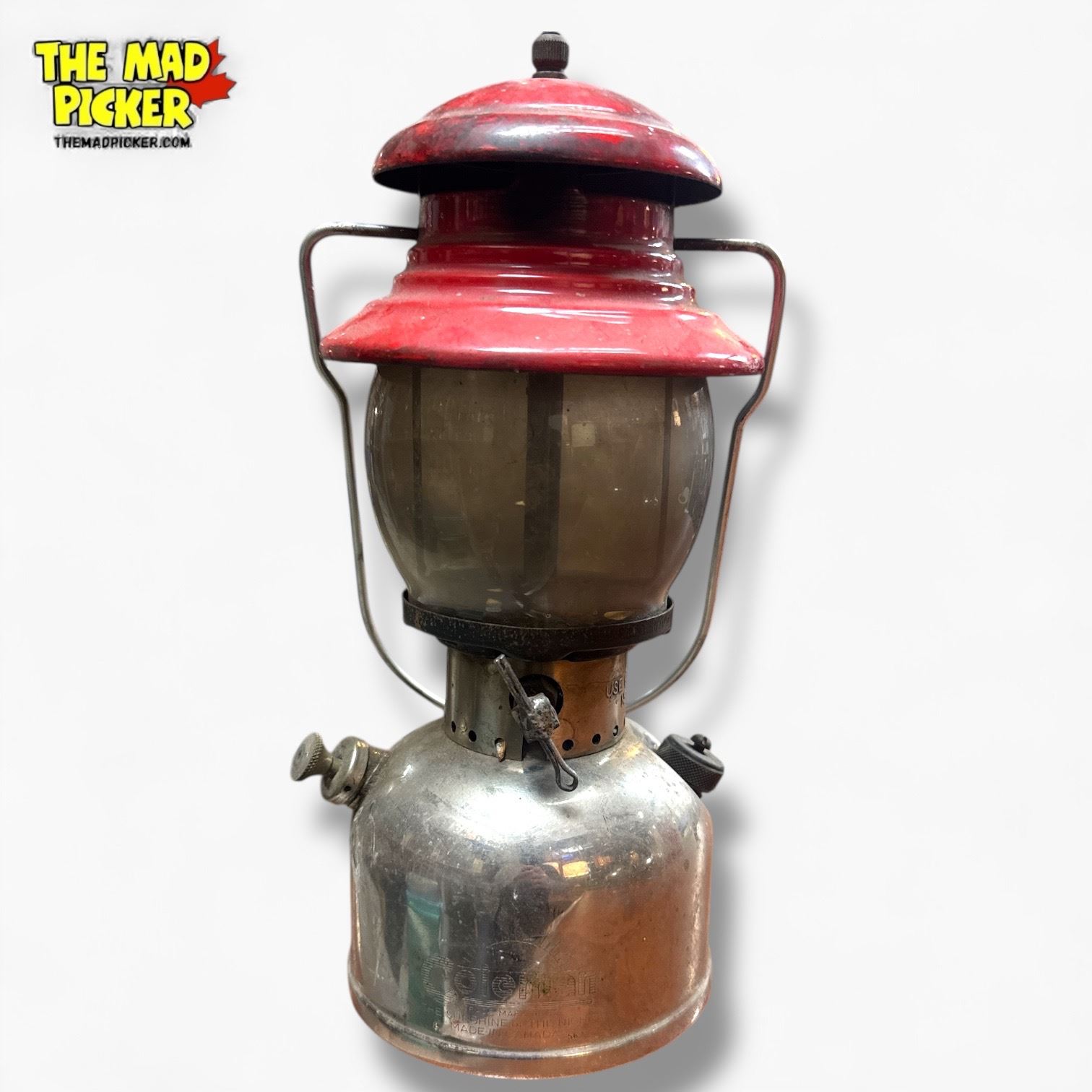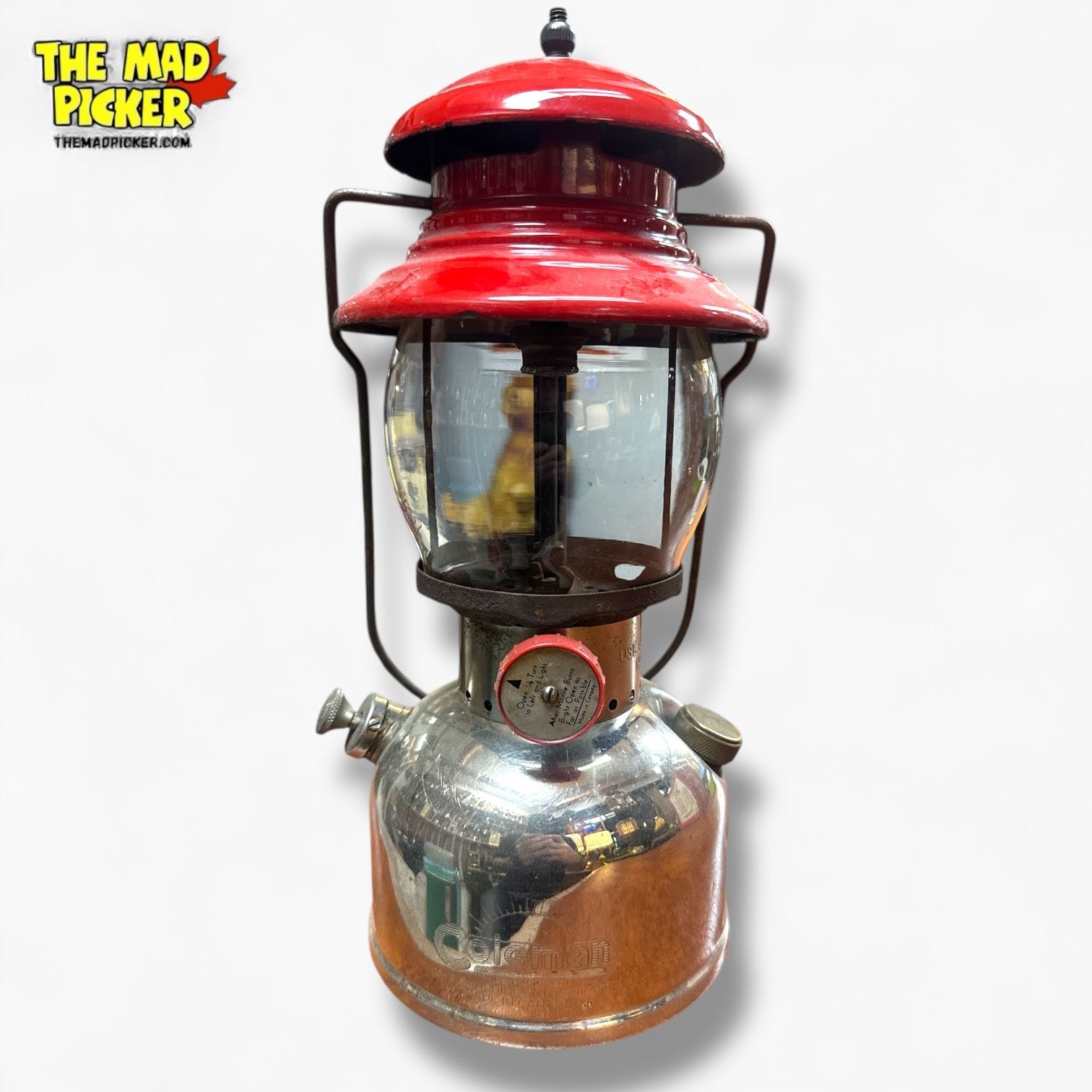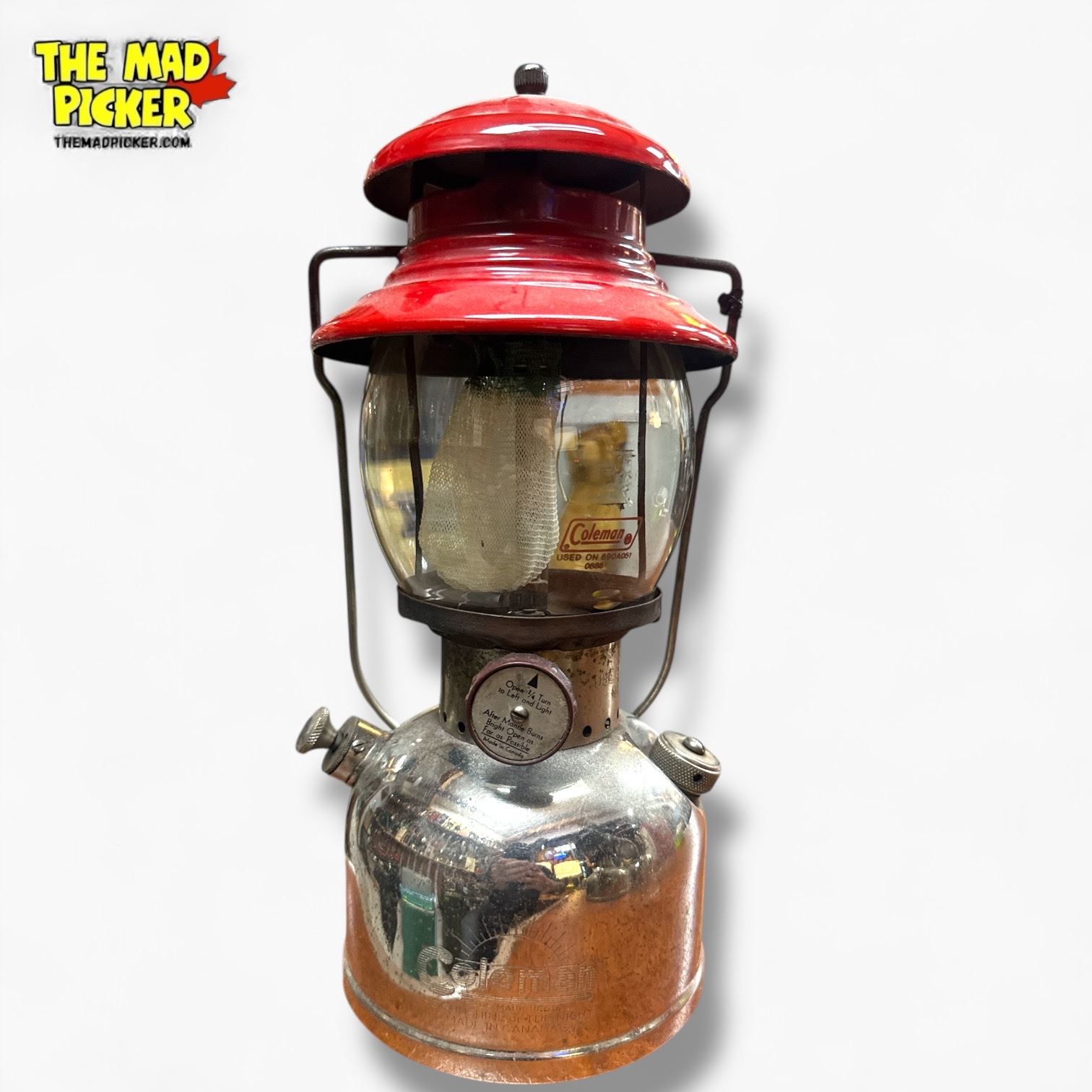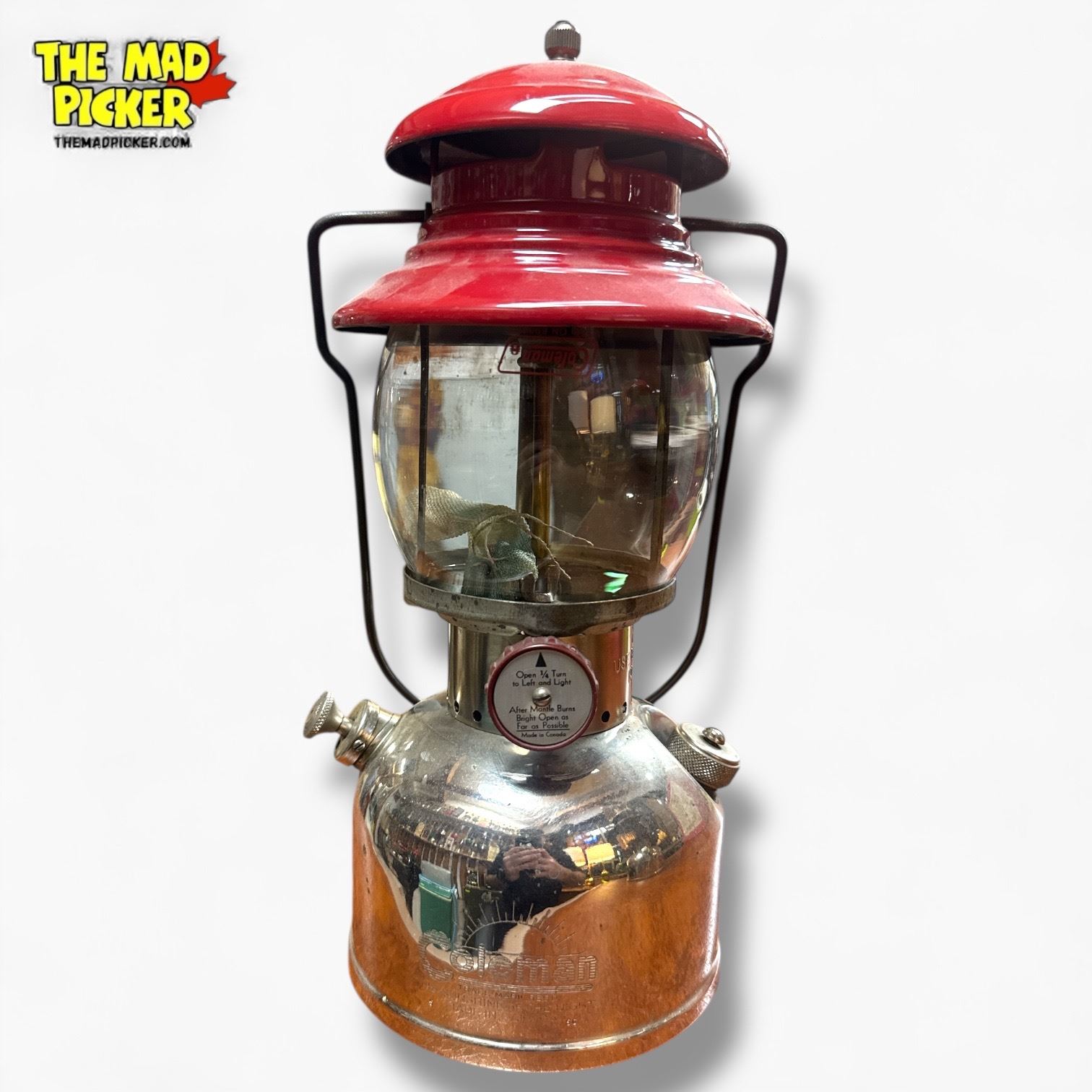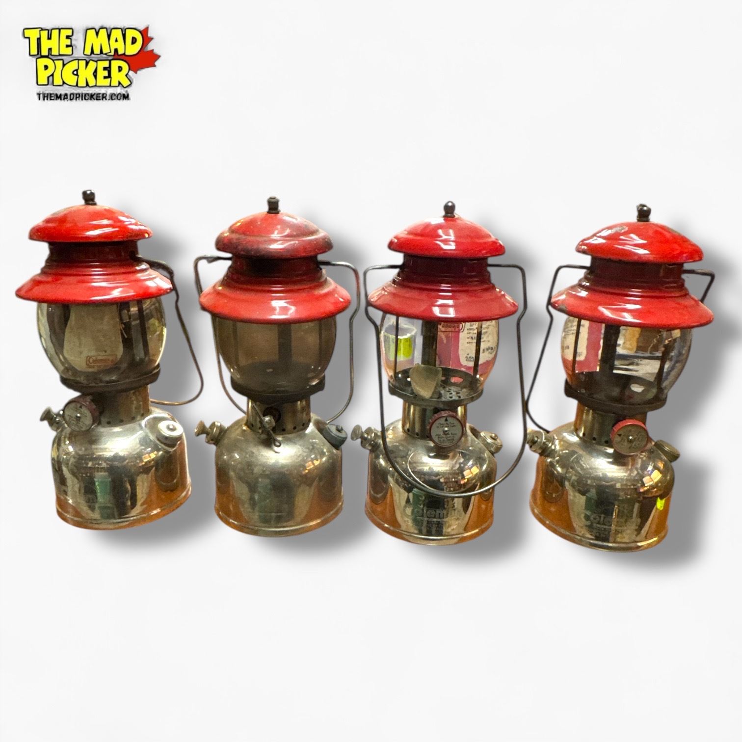 Collection of 4 Coleman Model 200 lanterns featuring nickel finish. Includes models from 1954, 1956 (2 units), and 1958. Single mantle design with classic globe shape. Manufactured in the USA. Known for durable construction and functional outdoor lighting.