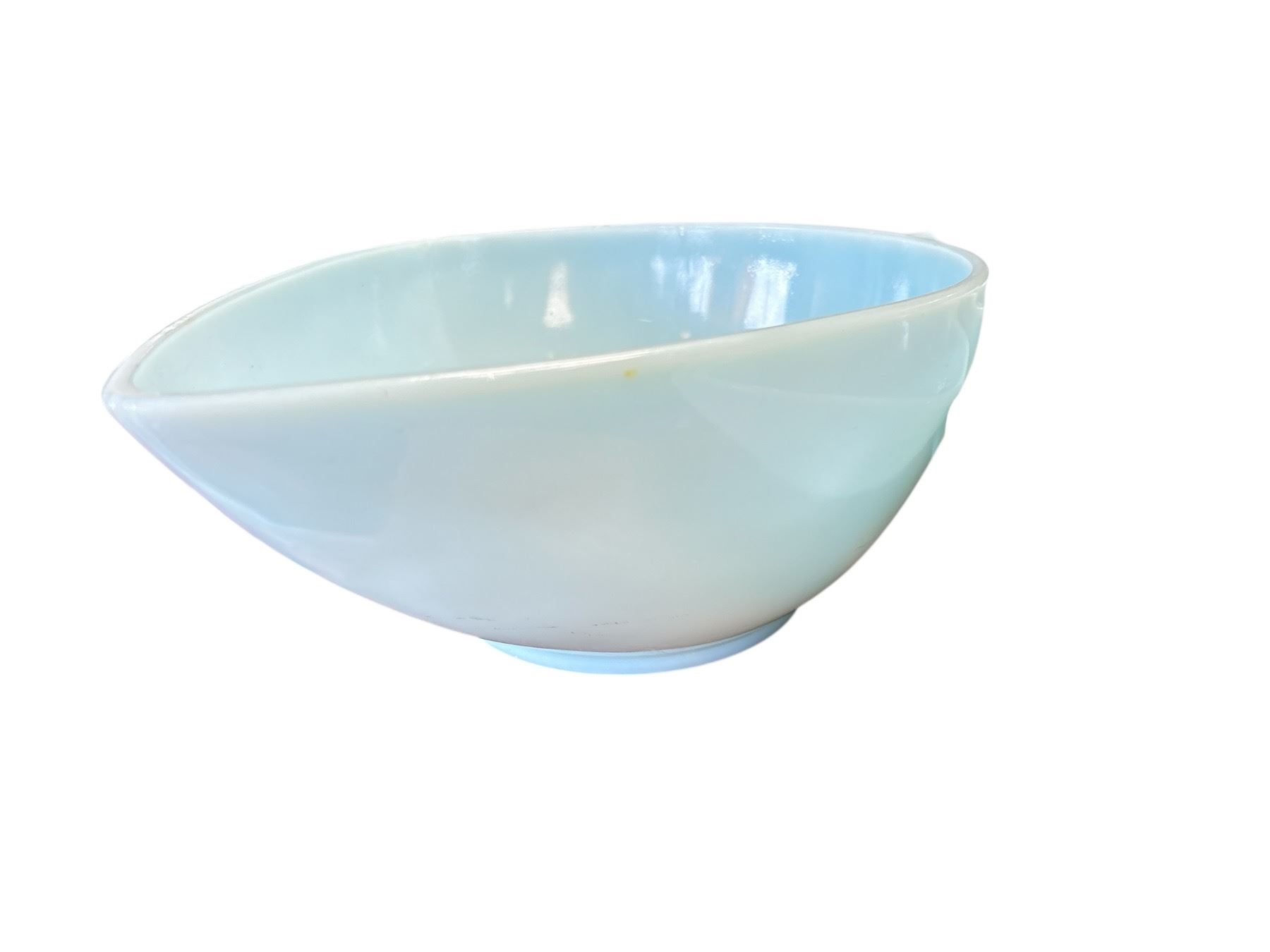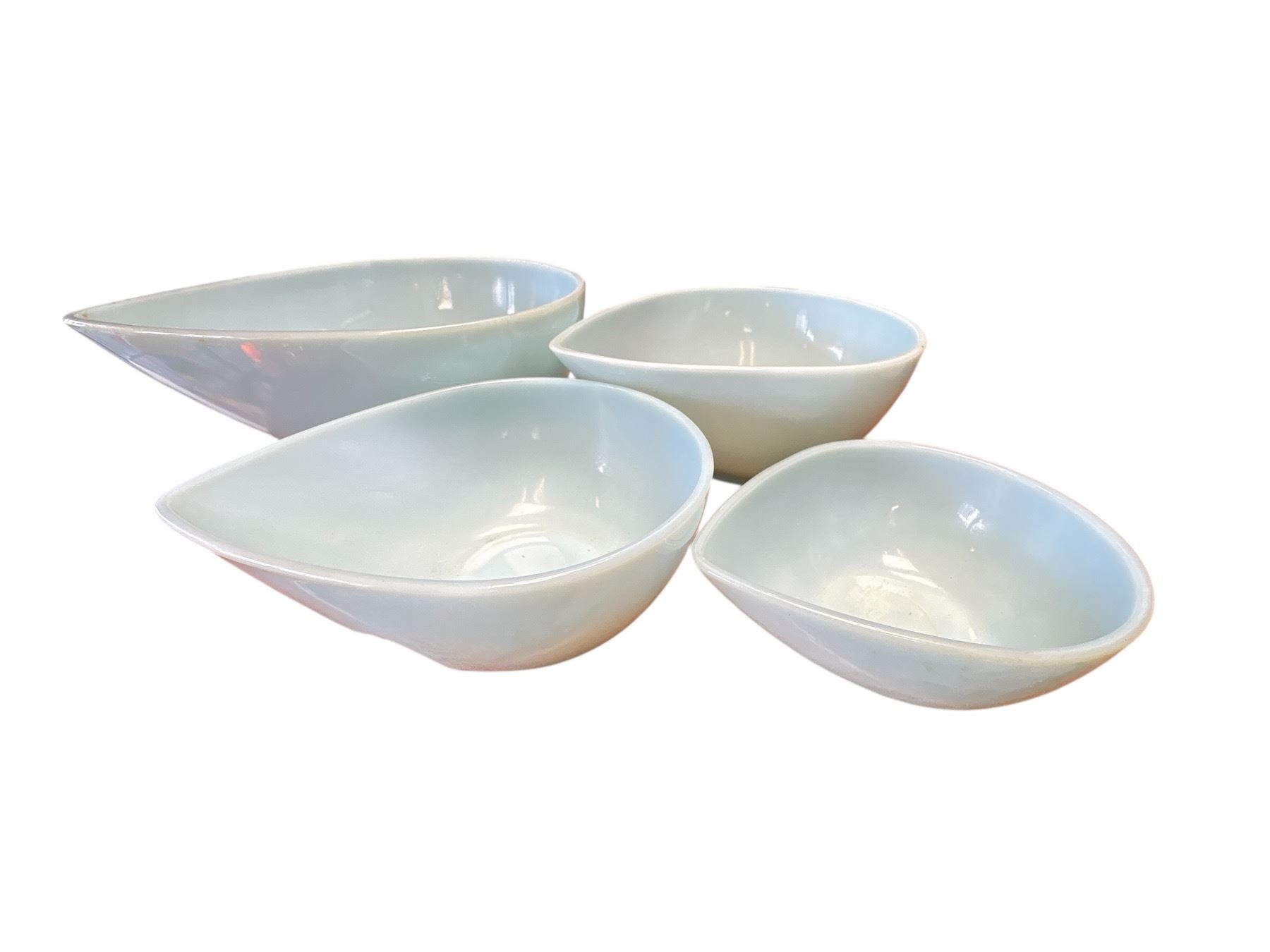 Set of four Fire King Swedish Modern Teardrop bowls in turquoise blue manufactured by Anchor Hocking during the 1950s. Made of ovenproof glass, these bowls feature a sleek and modern teardrop design. Part of the Swedish Modern line, known for its clean and minimalist aesthetic. Item is as pictured.