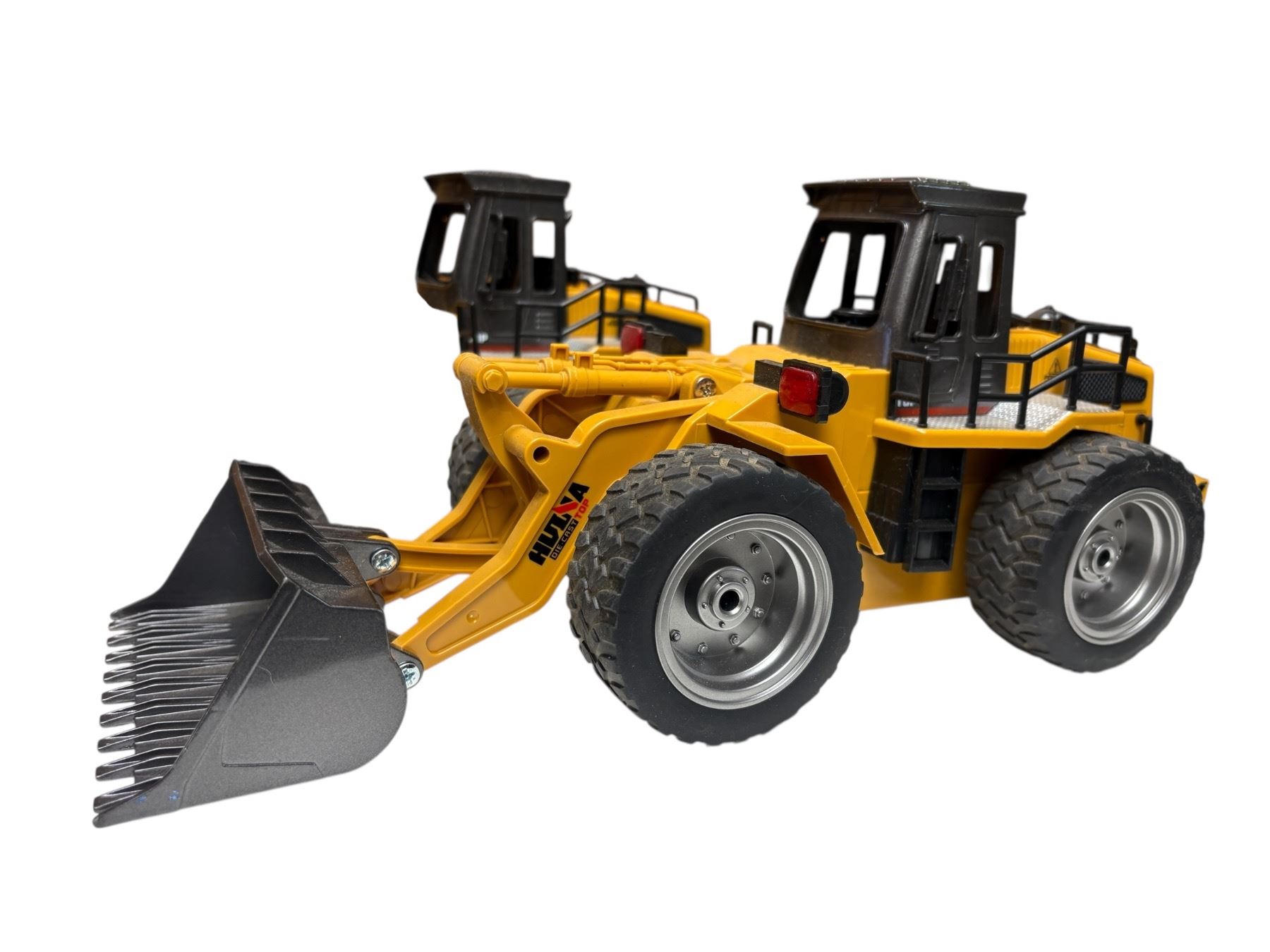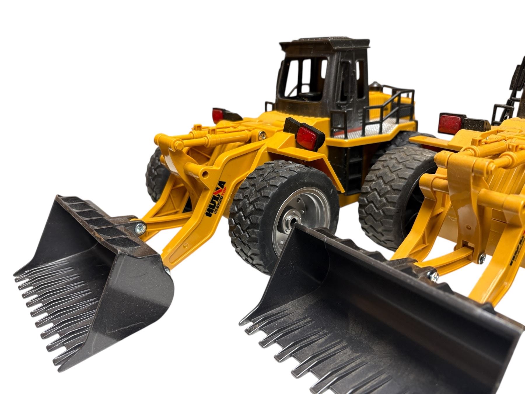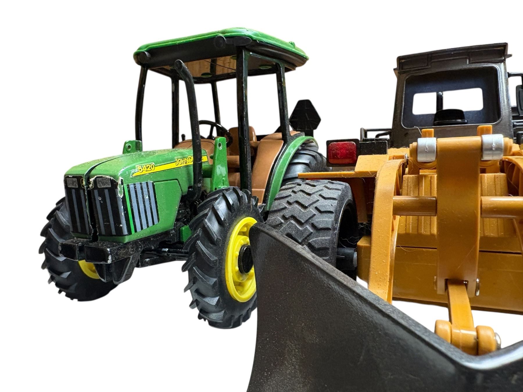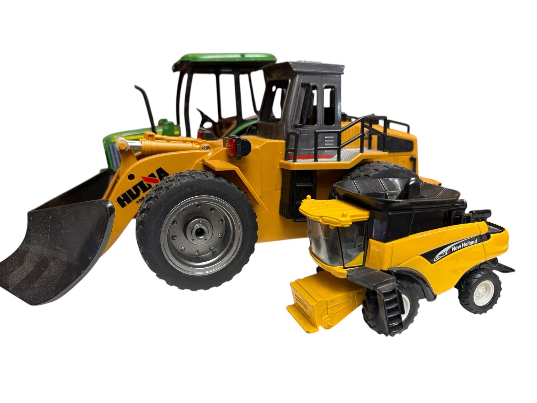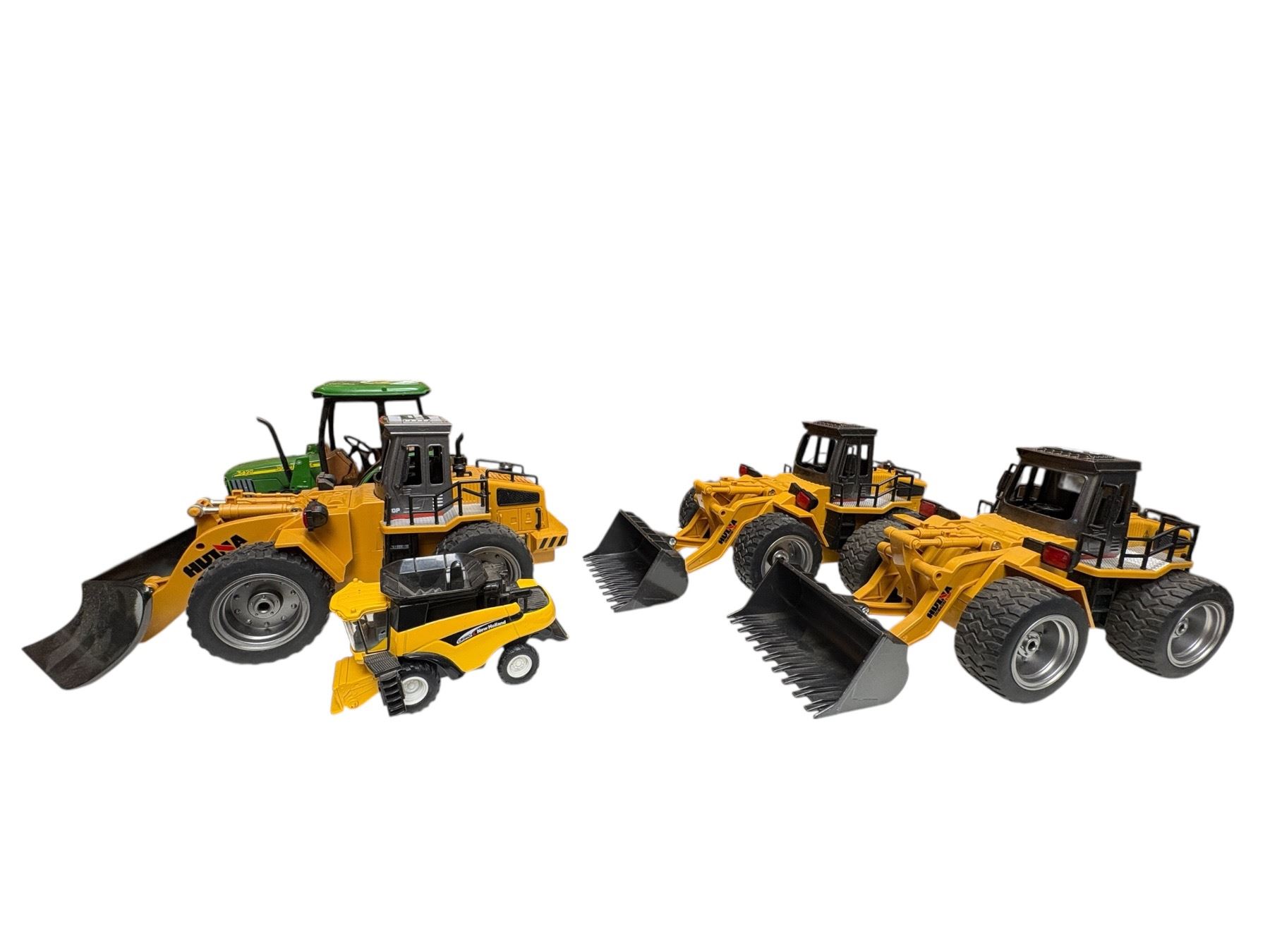 Set of 5 construction equipment toys featuring models from John Deere, New Holland, and Huina. Includes various types like excavators, loaders, and cranes. Made from mixed materials, including plastic and diecast. Suitable for display or play; exact scale and model. Item is as pictured.