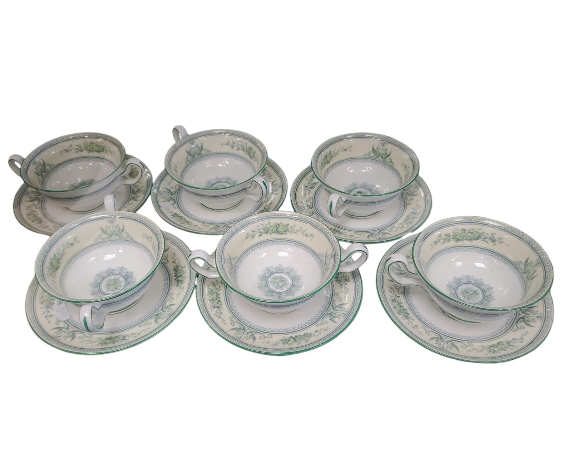 Set includes 6 Wedgewood Petersham bone china soup bowls with matching saucers. Crafted from fine bone china, the Petersham pattern features a classic design. Each bowl and saucer is part of a coordinated set. Item is as pictured.