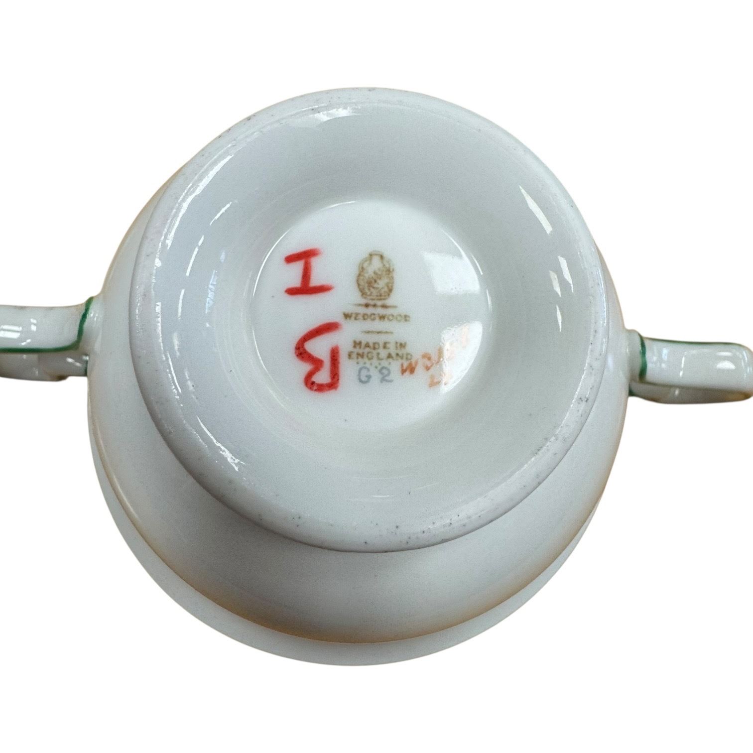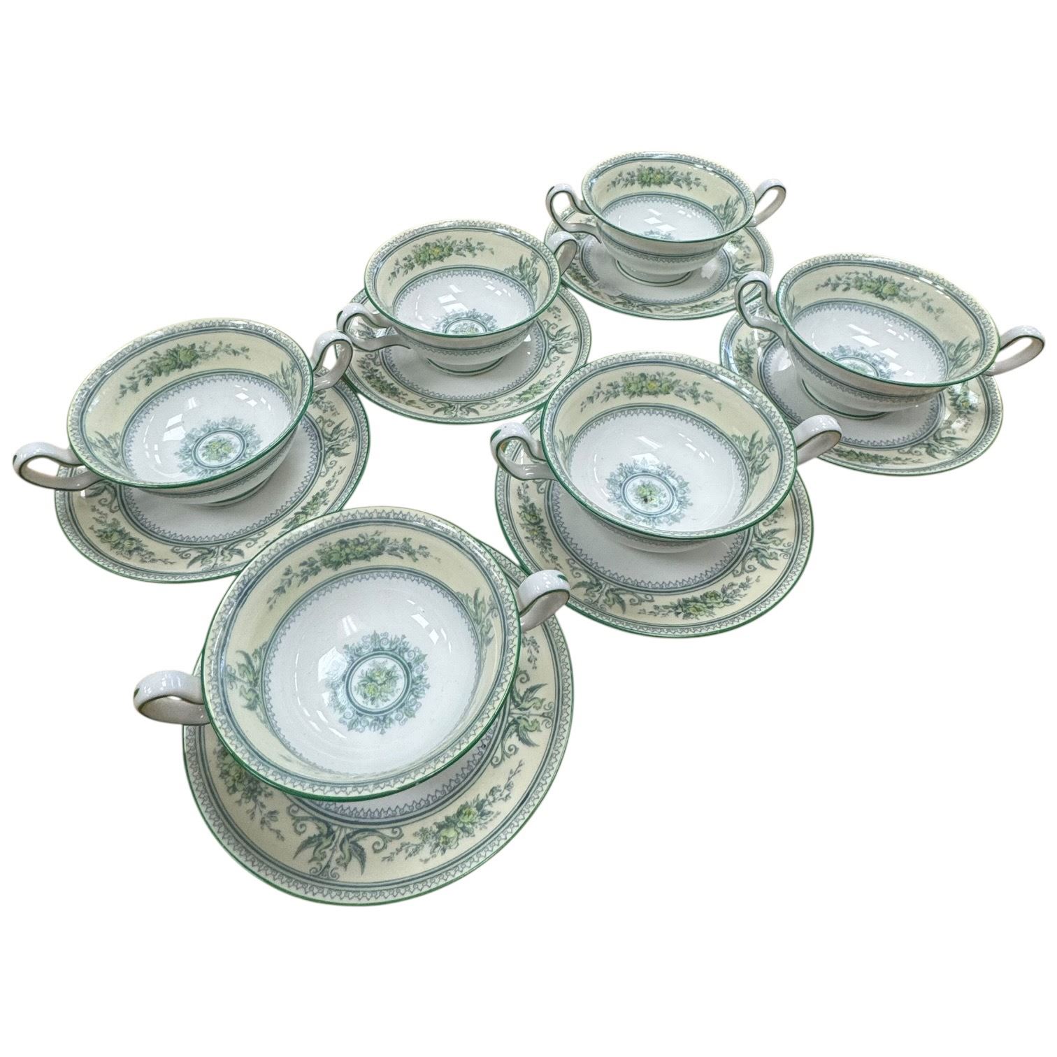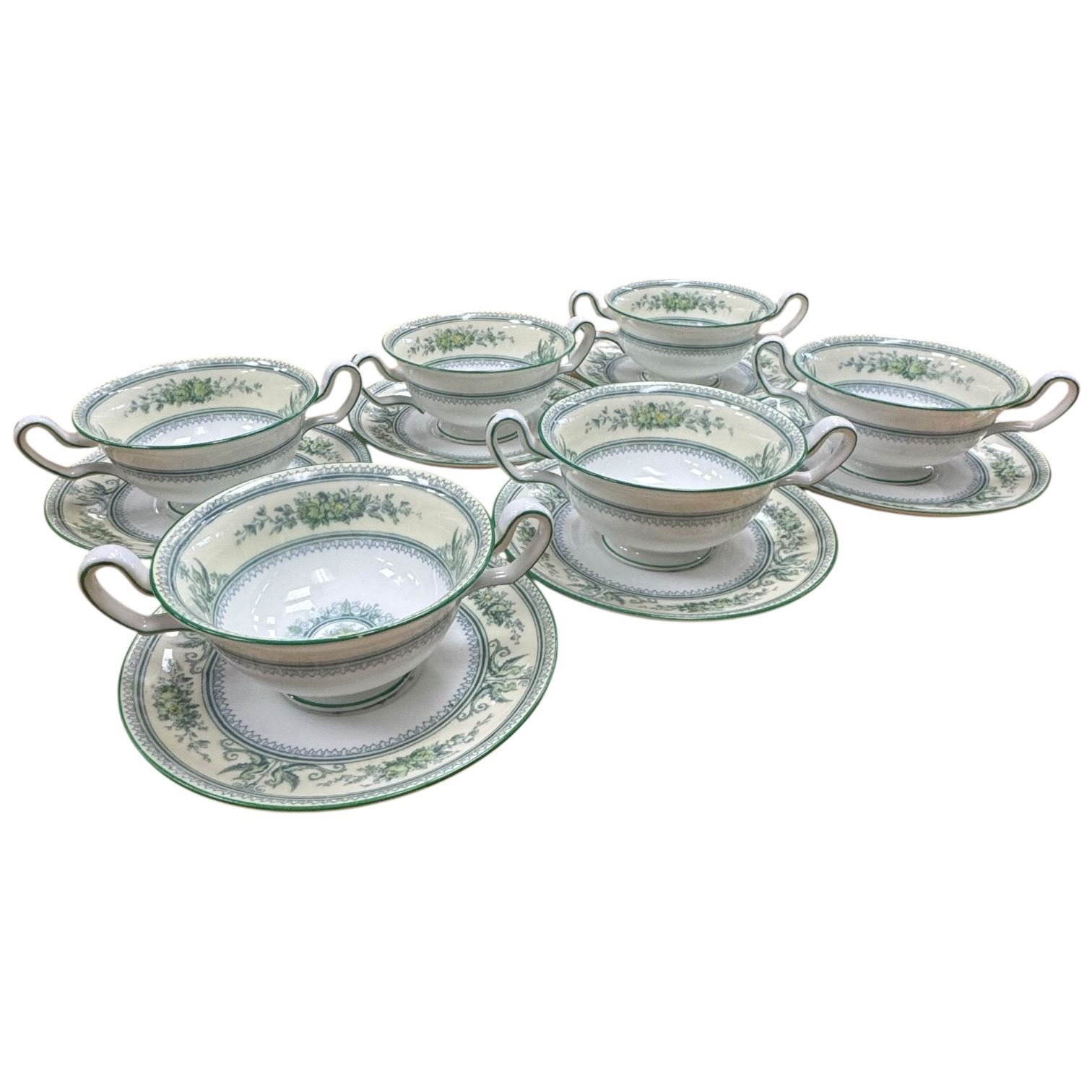 Set of 6 Wedgwood Petersham bone china soup bowls with matching saucers. Petersham pattern features delicate floral design in bone china. Each bowl and saucer pair is crafted with high-quality materials characteristic of Wedgwood's production. Item is as pictured.