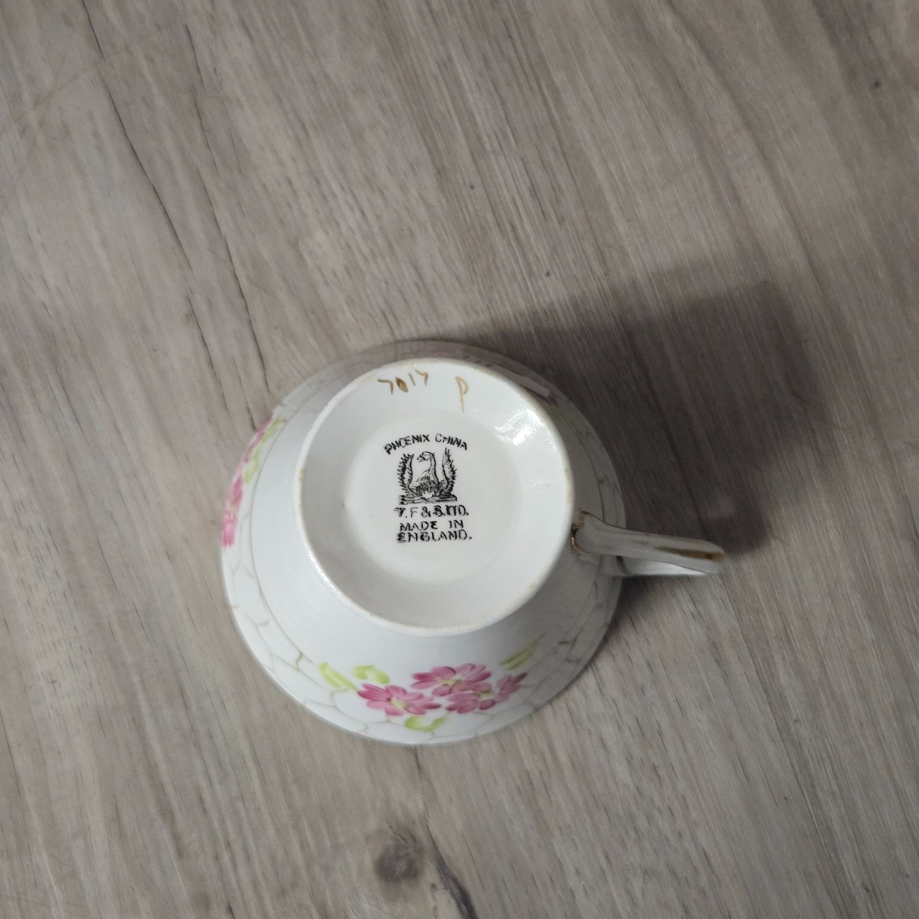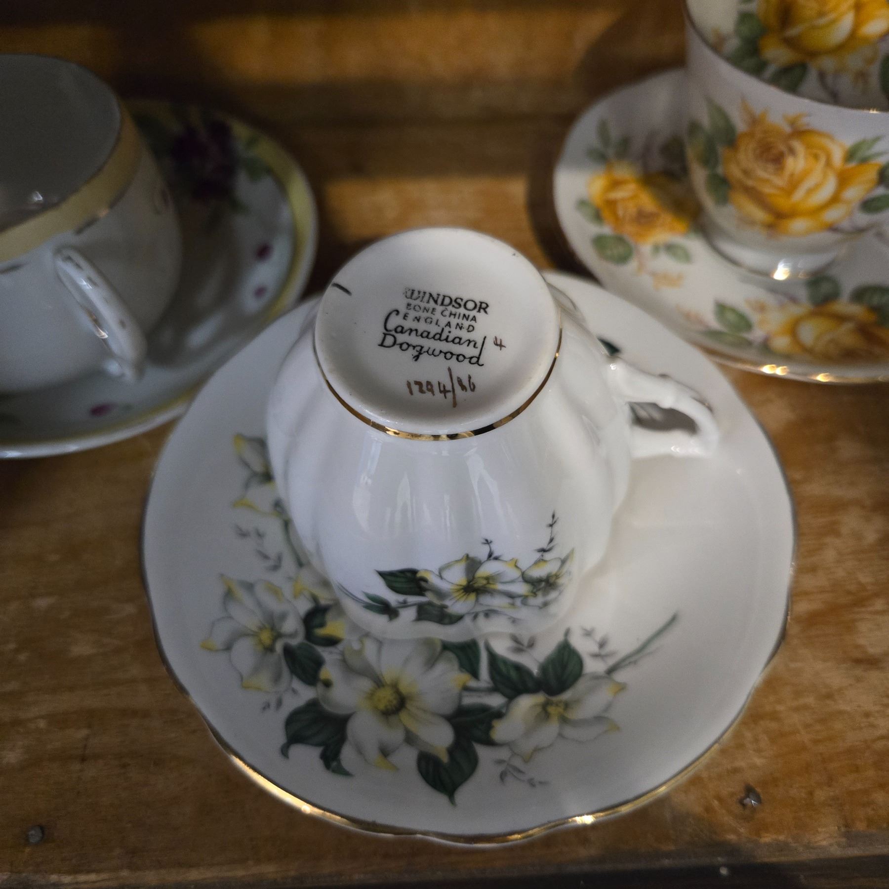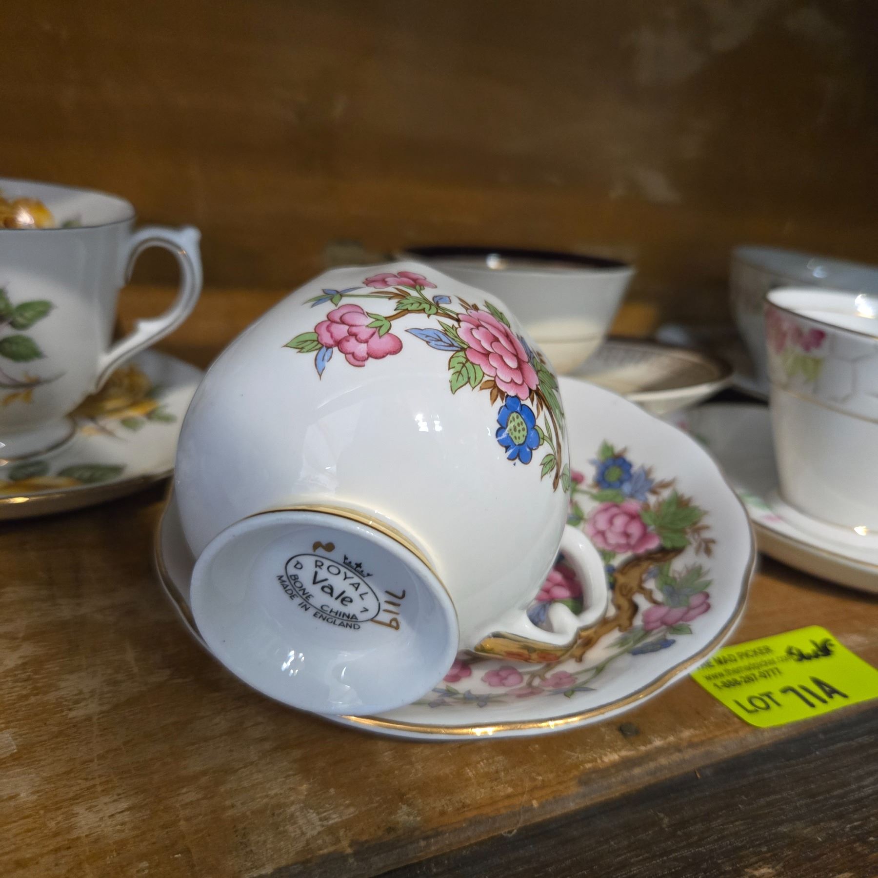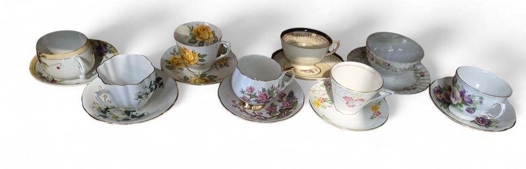 Collection of 8 tea cups with matching saucers featuring various chinaware brands including Royal Vale and Windsor. Multi-pattern design with varying floral and decorative motifs. Each cup and saucer set appears distinct in design. Item is as pictured.