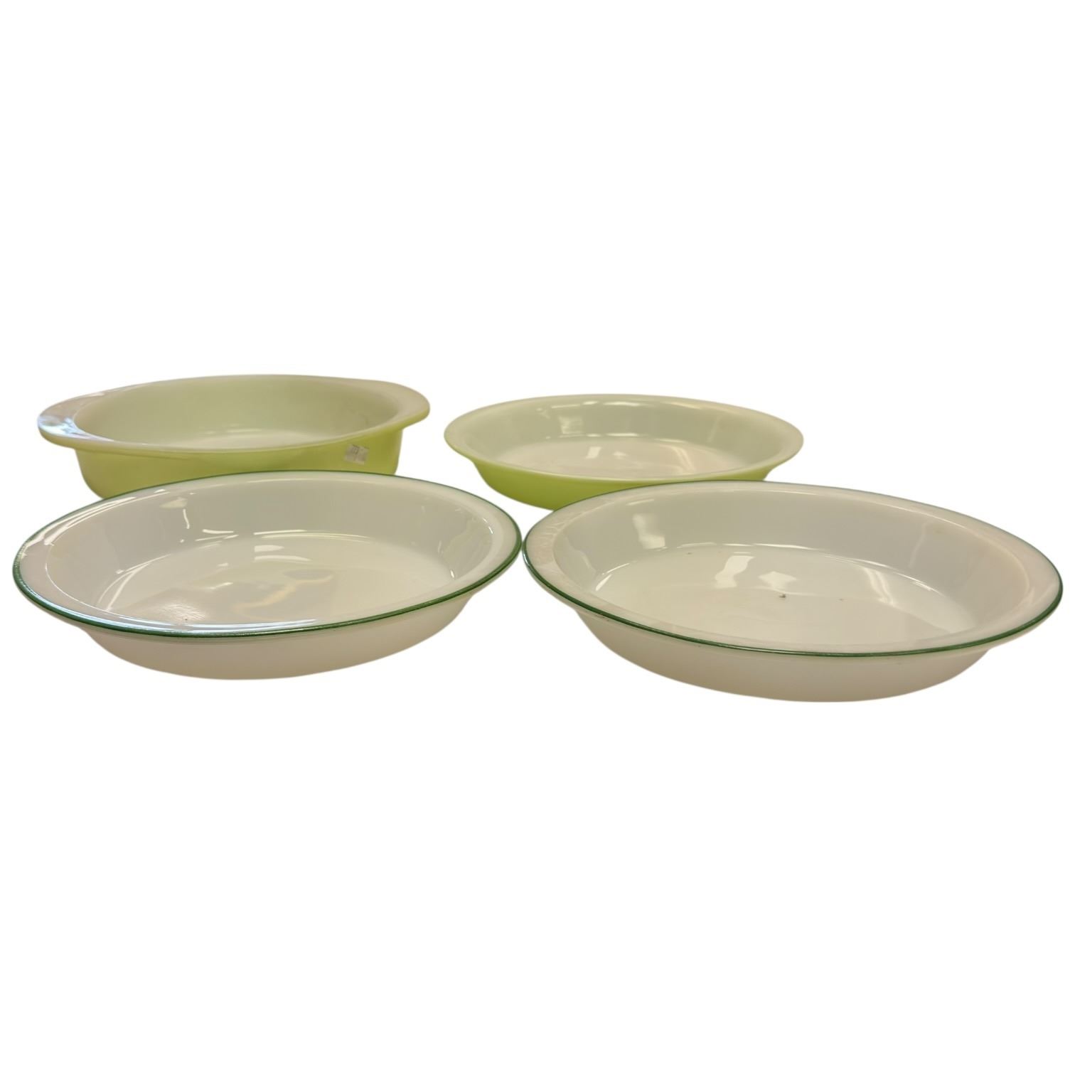 A mixed set of vintage Pyrex bakeware consisting of three pie plates and one utility baking dish. The group includes one 909 pie plate, two matching 2209 pie plates, and one 221 shallow baking dish. All pieces are made of Pyrex opal glass and represent standard mid‑century Corning bakeware shapes. No chips.