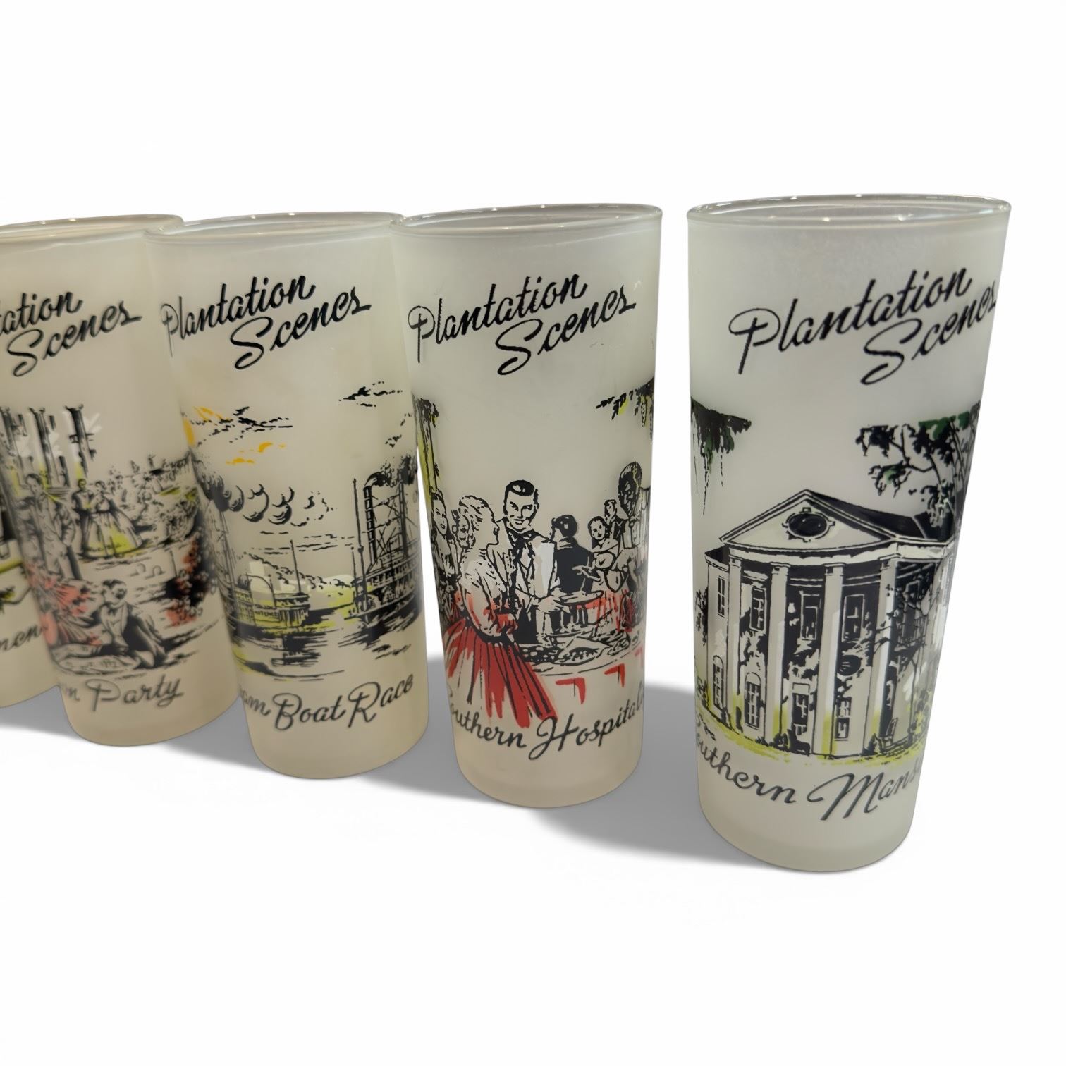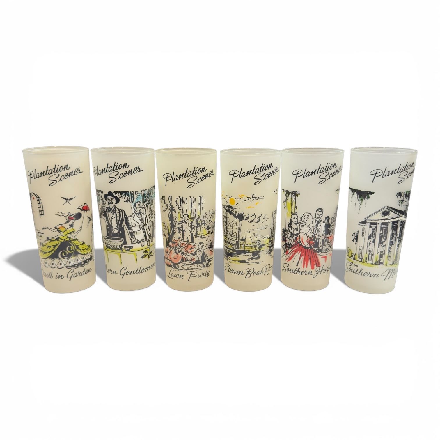 Set of six Libbey Glass highball glasses featuring 'Plantation Scenes' designs. Each glass has a 12-Oz capacity and showcases detailed imagery consistent with the 'Plantation Scenes' collection. Made of clear glass, these tumblers are ideal for beverages. Item is as pictured.