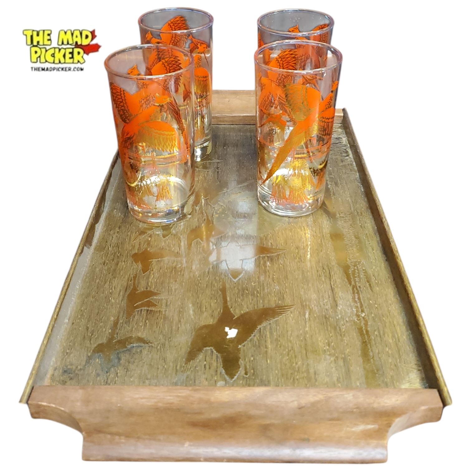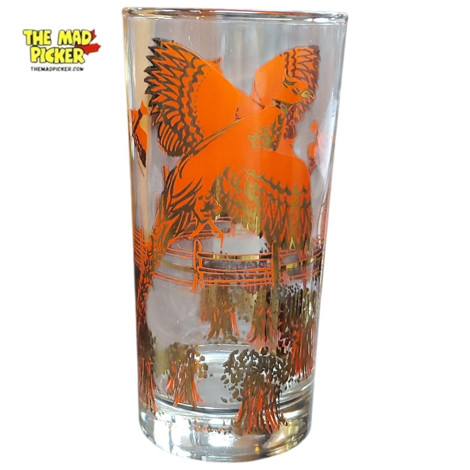 Set of Vintage Vibrant Red & Gold Design Pheasants Highball Glasses with Serving Tray