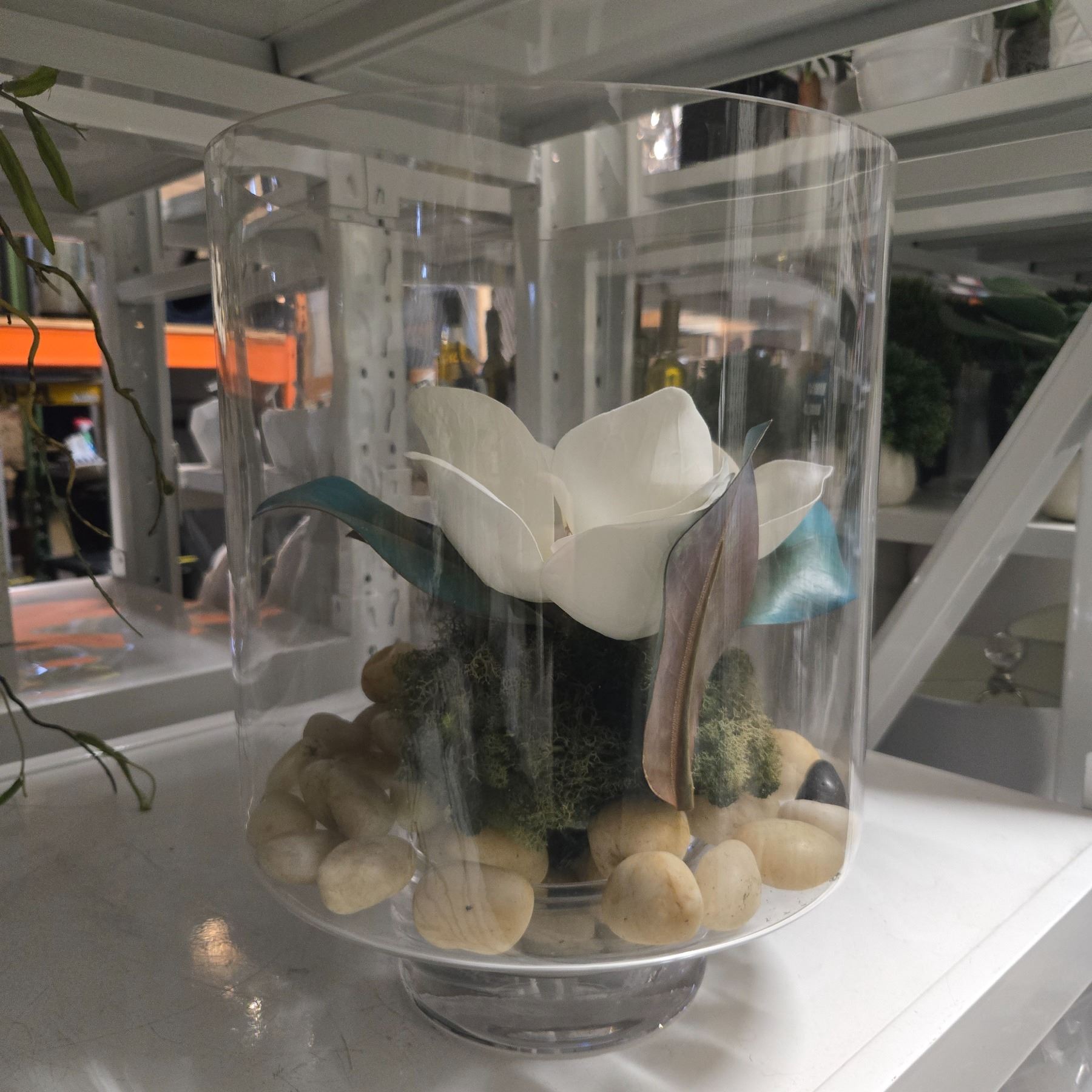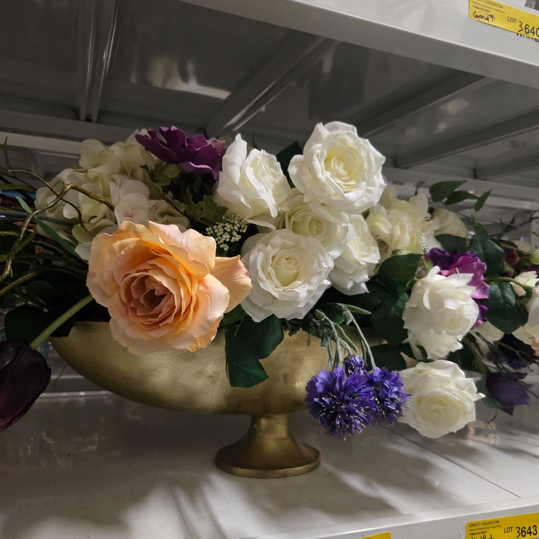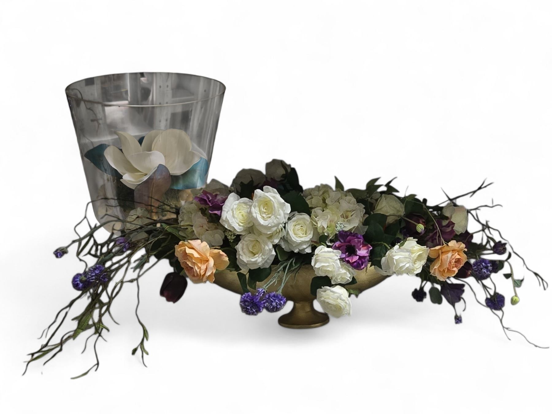 Shelf - Large Bouquet of Faux Flowers in Gold Colored Pot & Glass Display