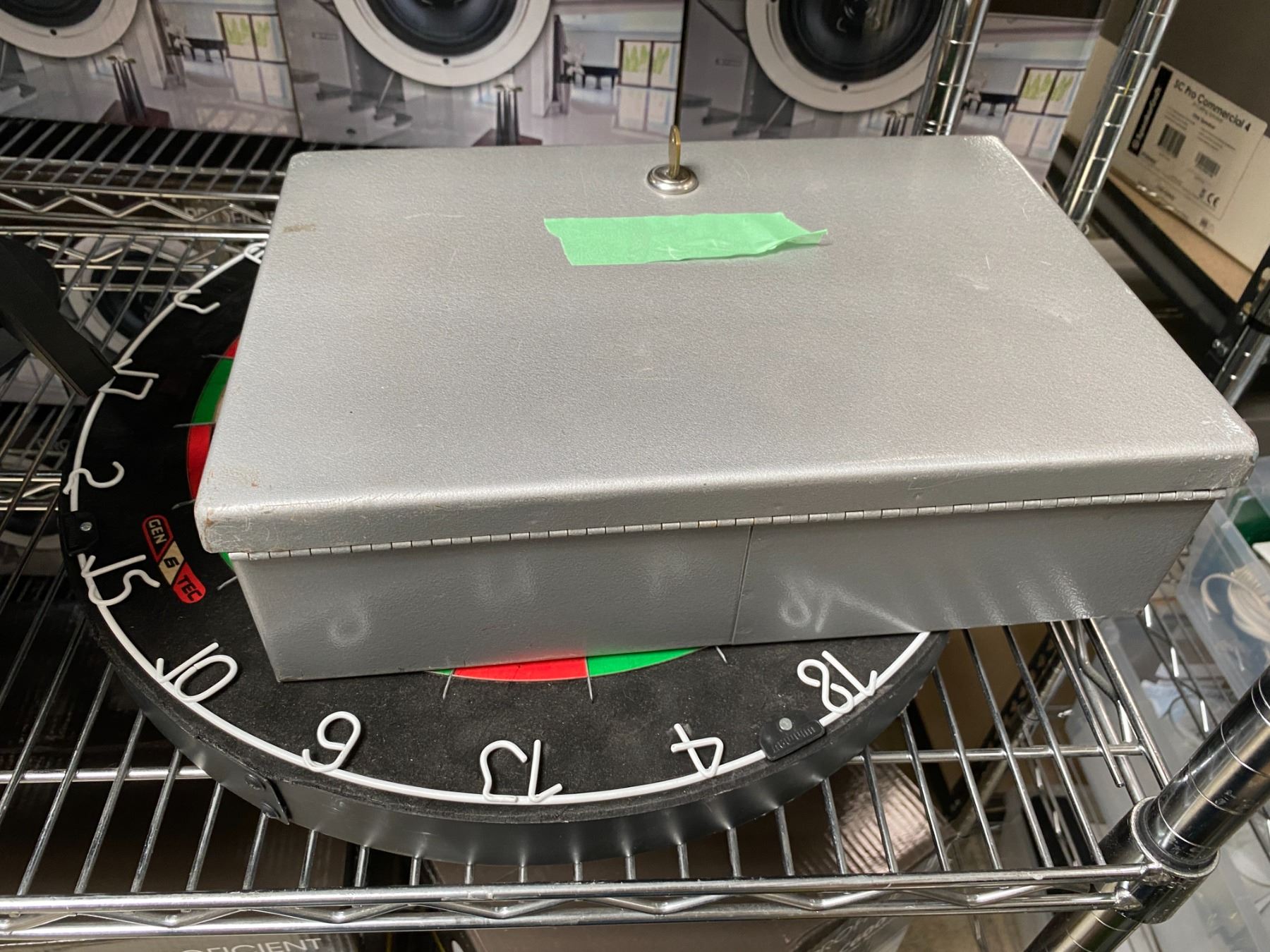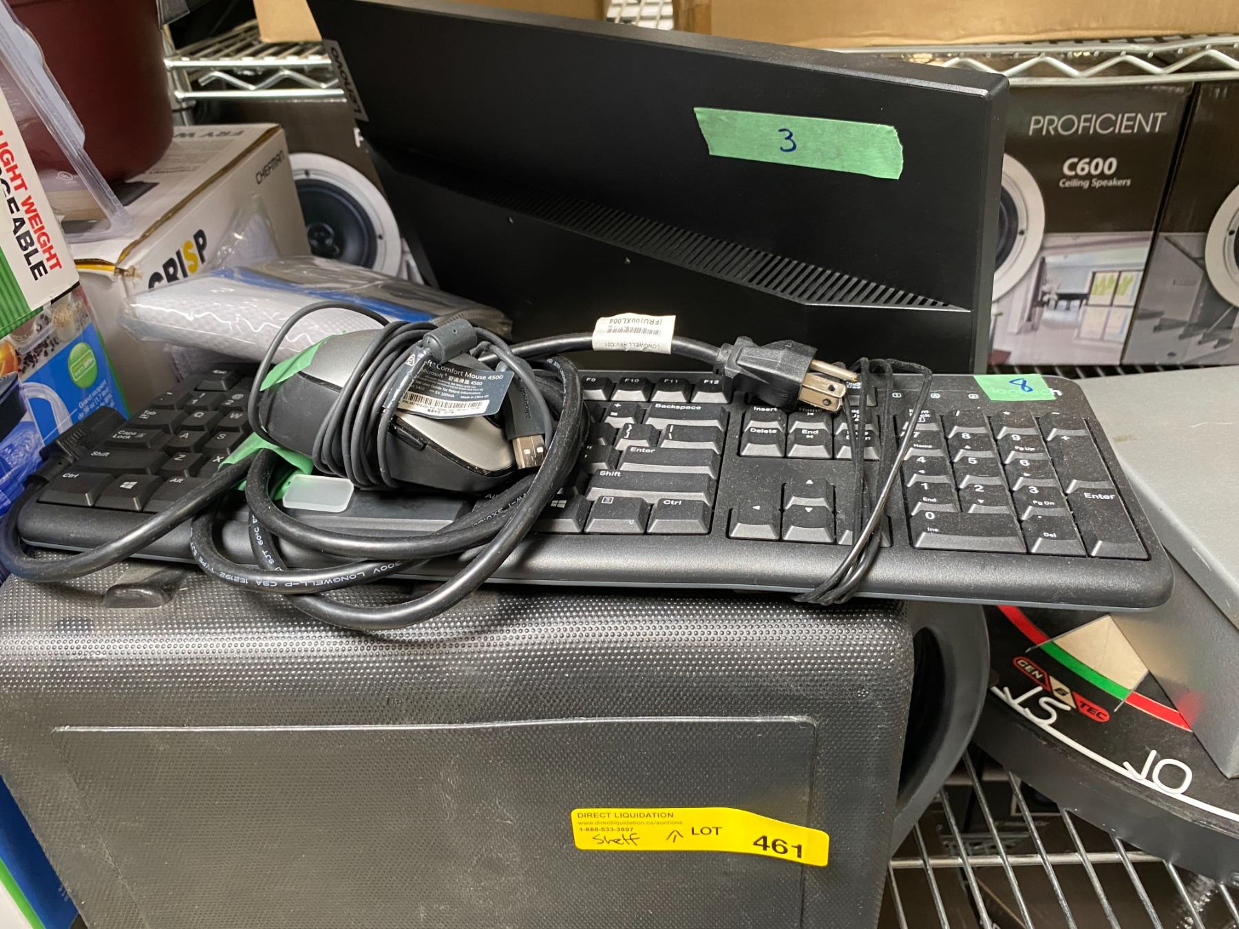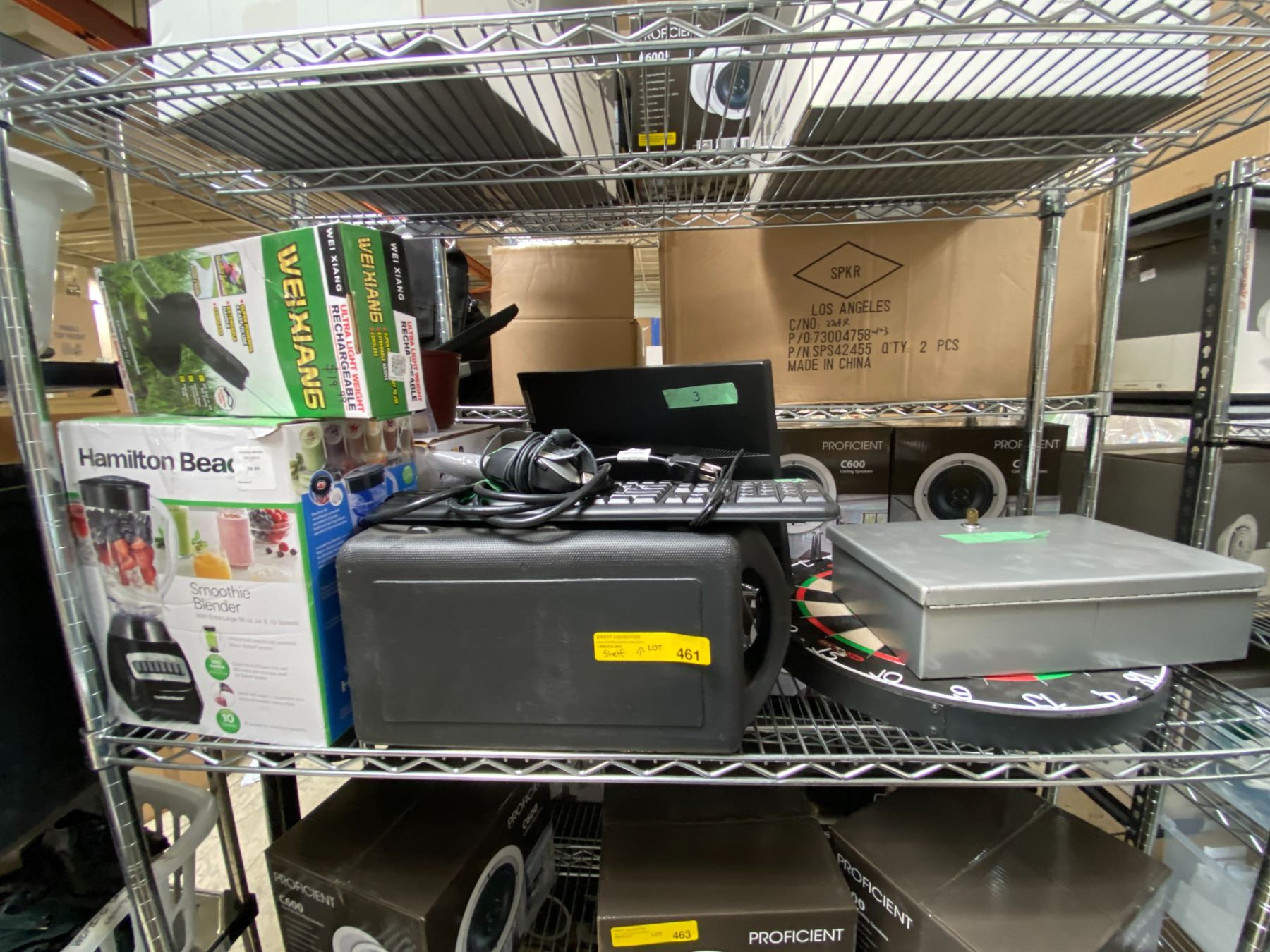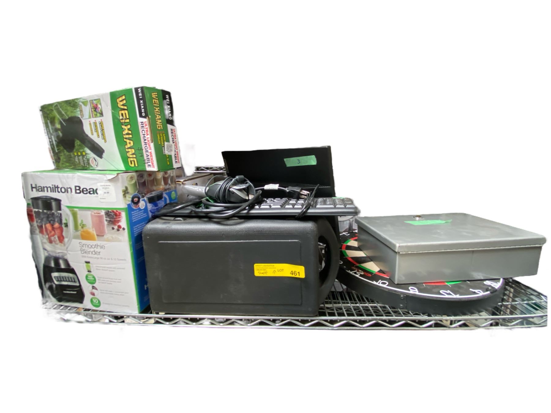 Shelf Lot - Dart Board, Monitor, Lock Box with Key & Kitchen Goods