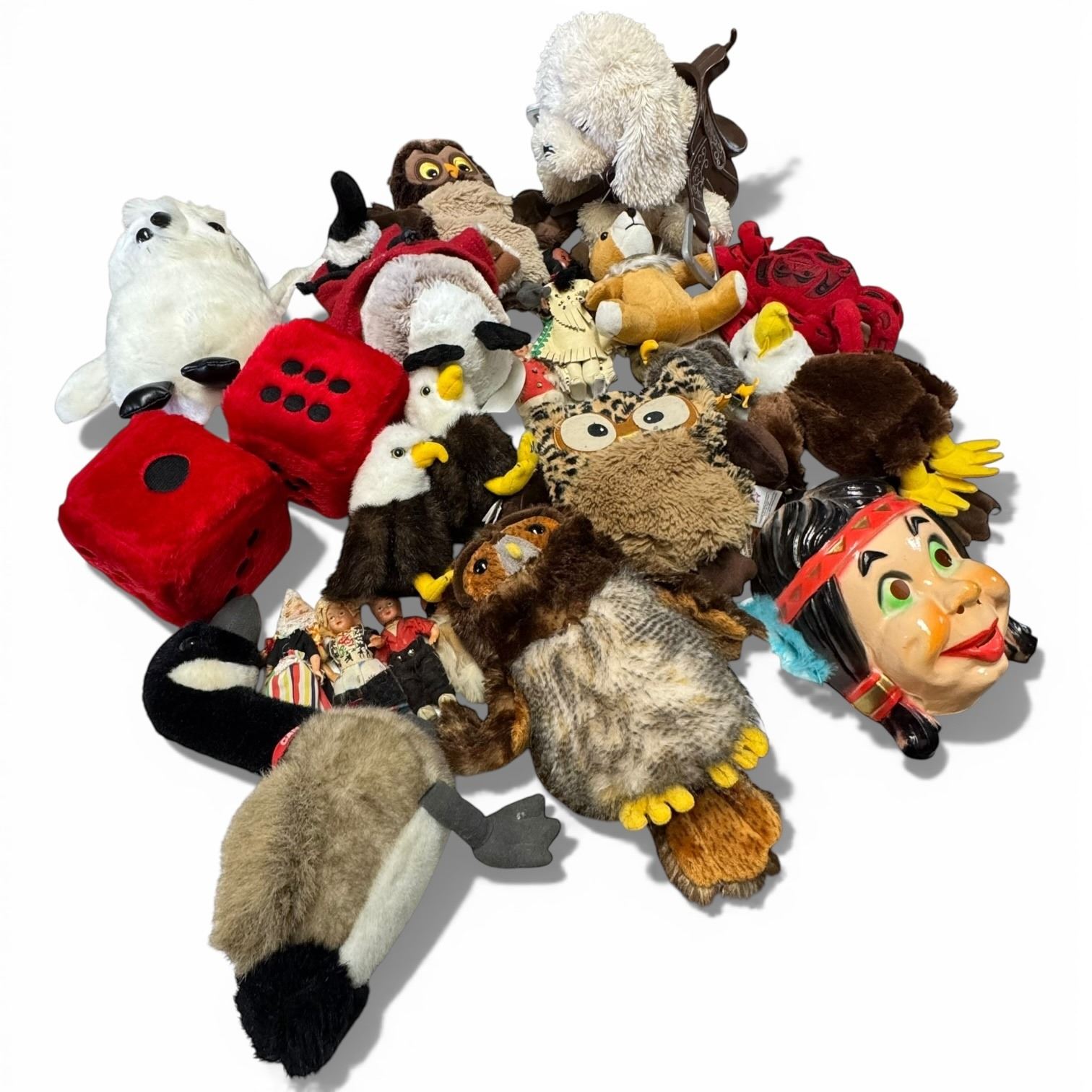 Shelf Lot of Dolls, Stuffed Toys and a Set of Fuzzy Dice (Sizes range from 4" to 10")