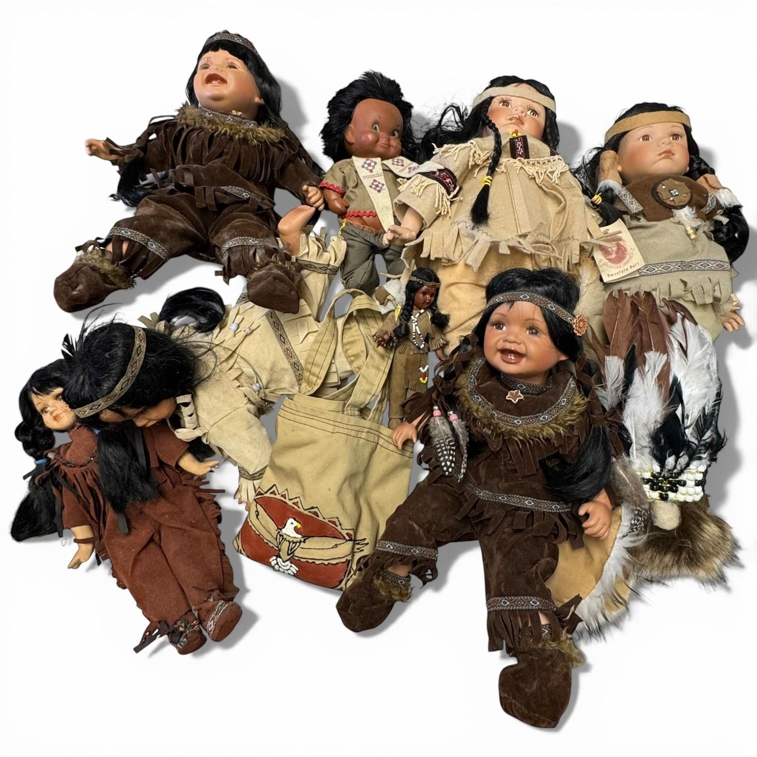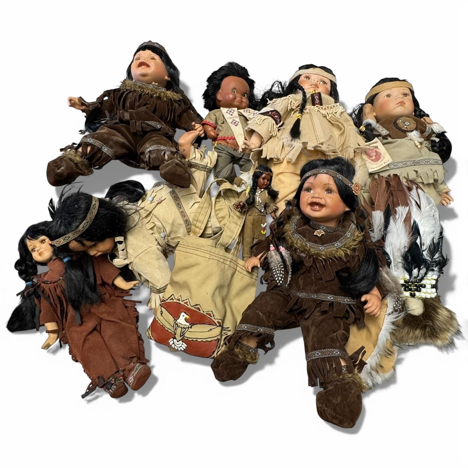 Shelf Lot of First Nations Design Dolls * Tallest seated doll is 11" * Variety of Materials