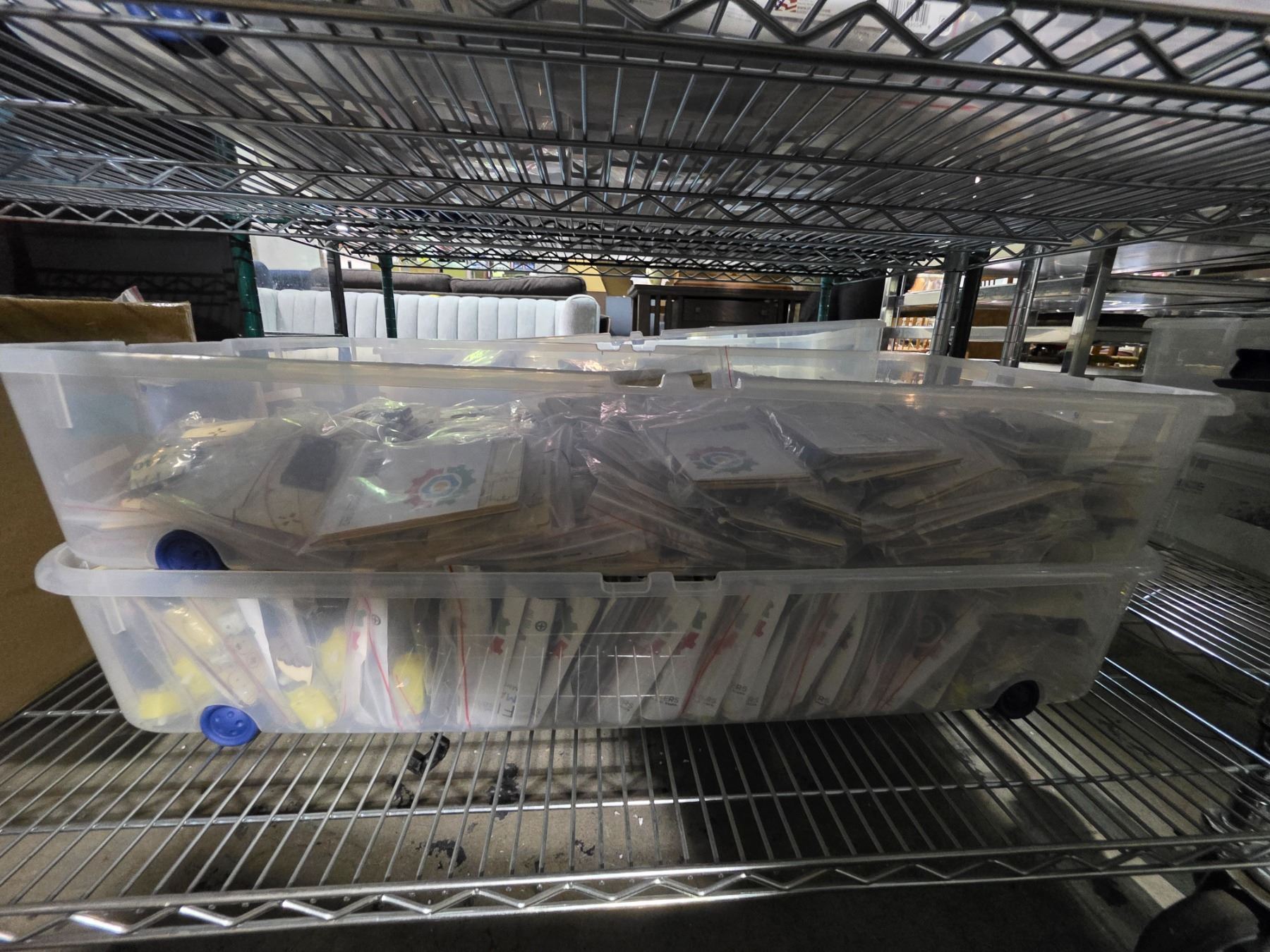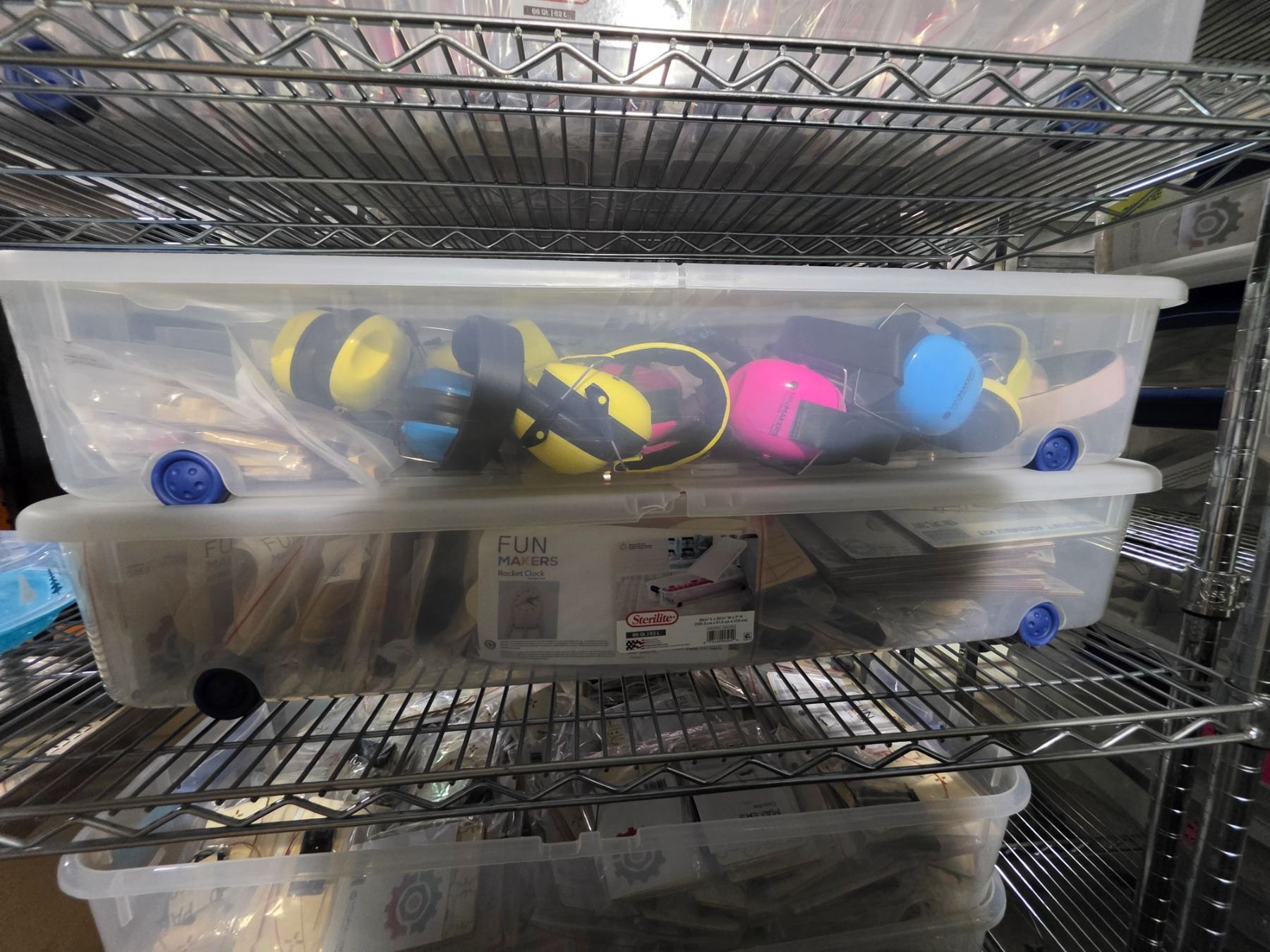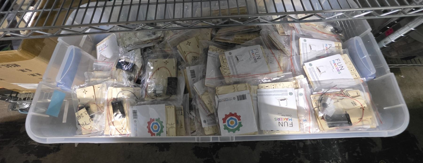 Shelf Lot of Misc. DIY Wood Crafting Kit & Supplies - includes NEW Fun Makers Builders Kits, Pumps & More (Bins are included - Shelf is not included)