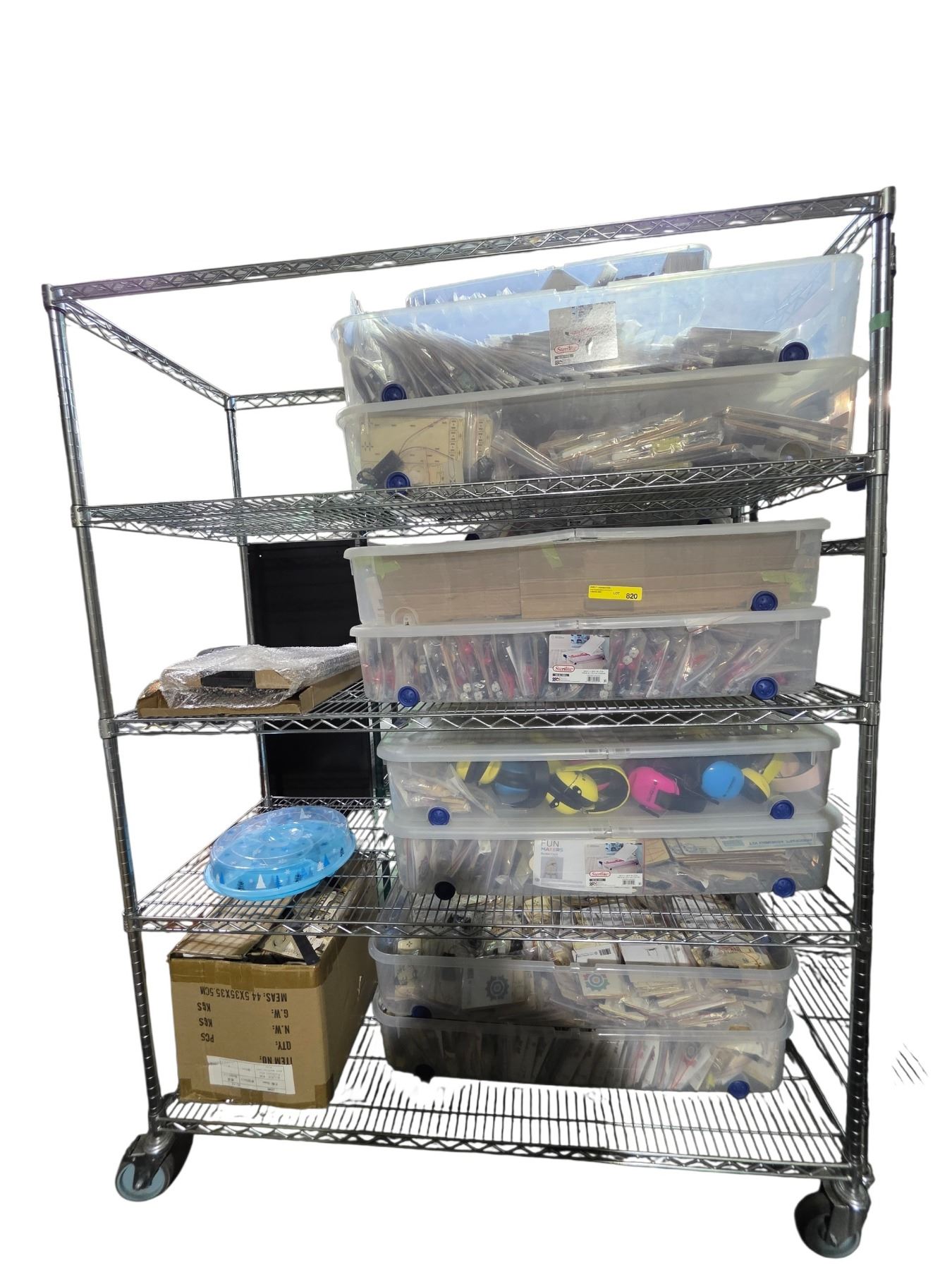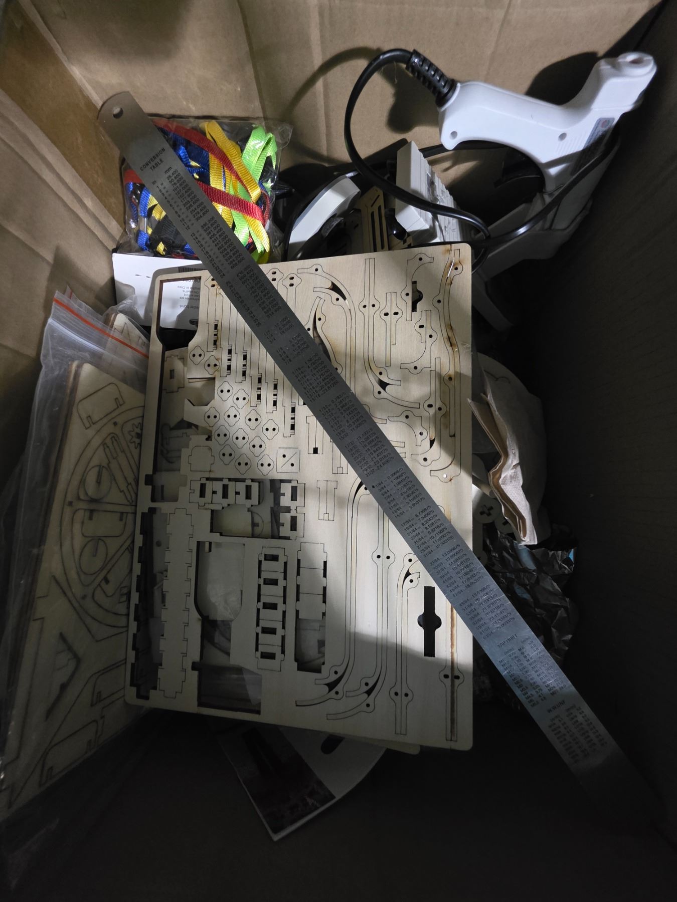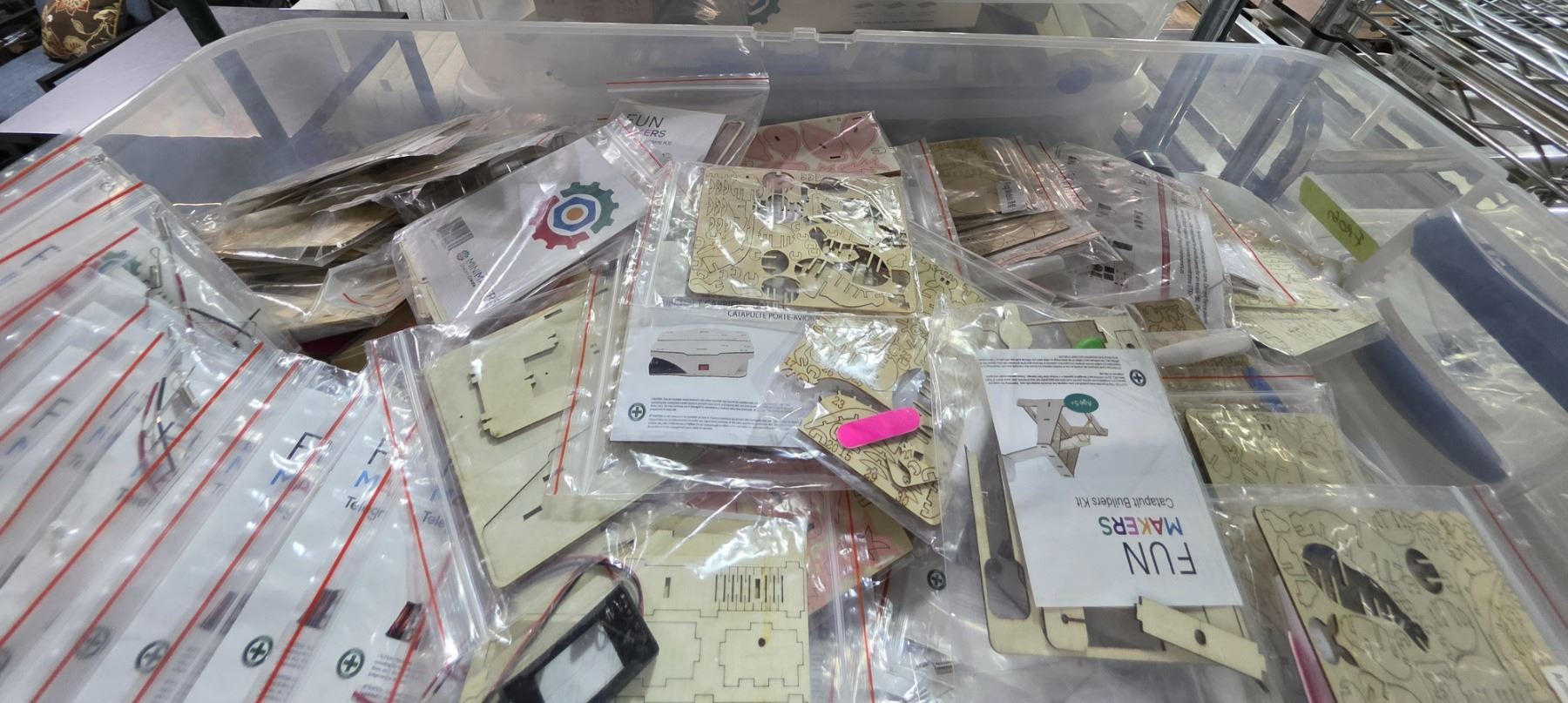 Shelf Lot of Misc. DIY Wood Crafting Kit & Supplies - includes NEW Fun Makers Builders Kits, Pumps & More (Bins are included - Shelf is not included)