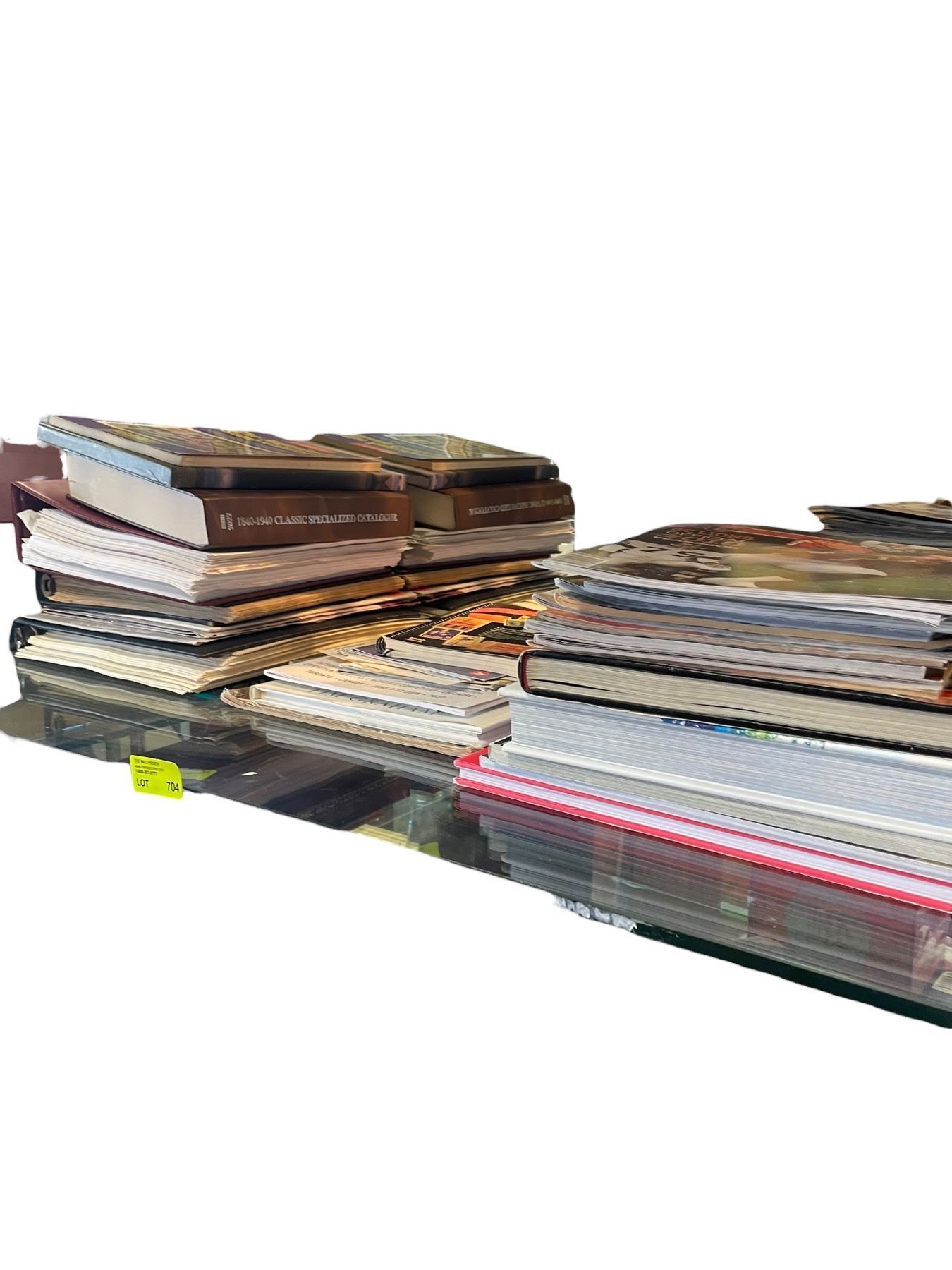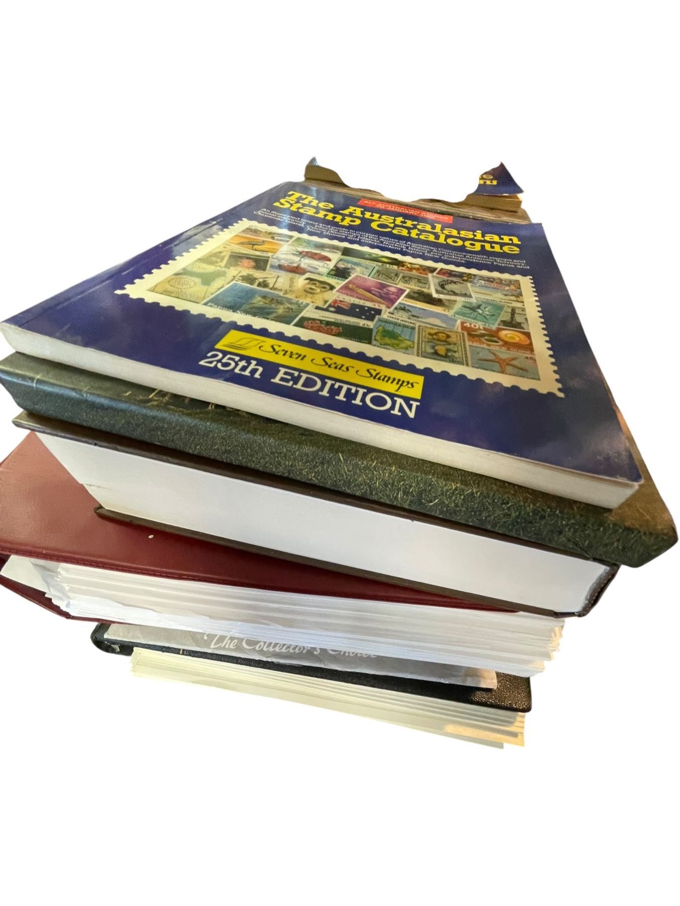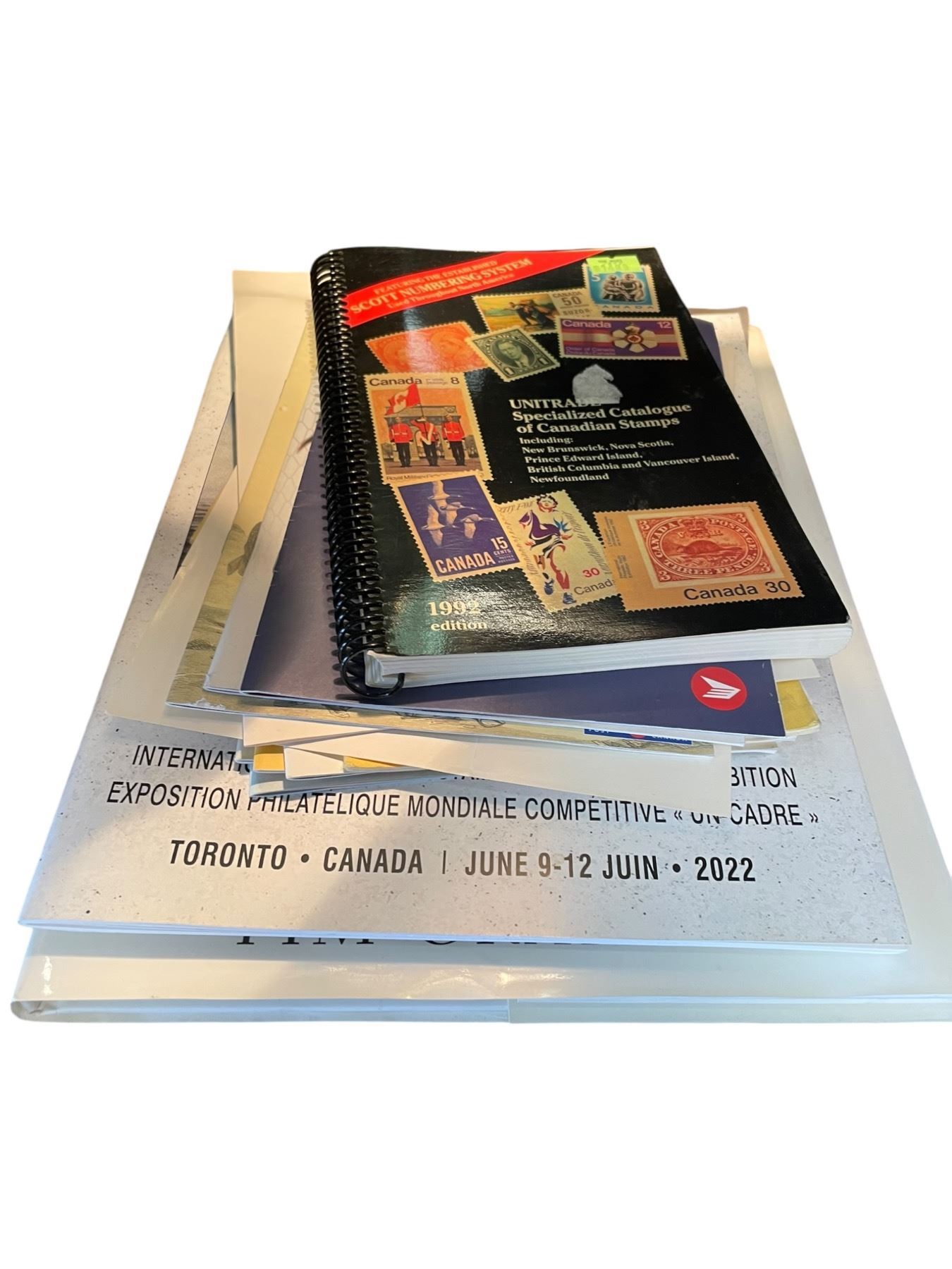 Shelf Lot of Stamps, Stamp Catalogues, Sports Magazines and Hard Cover Books