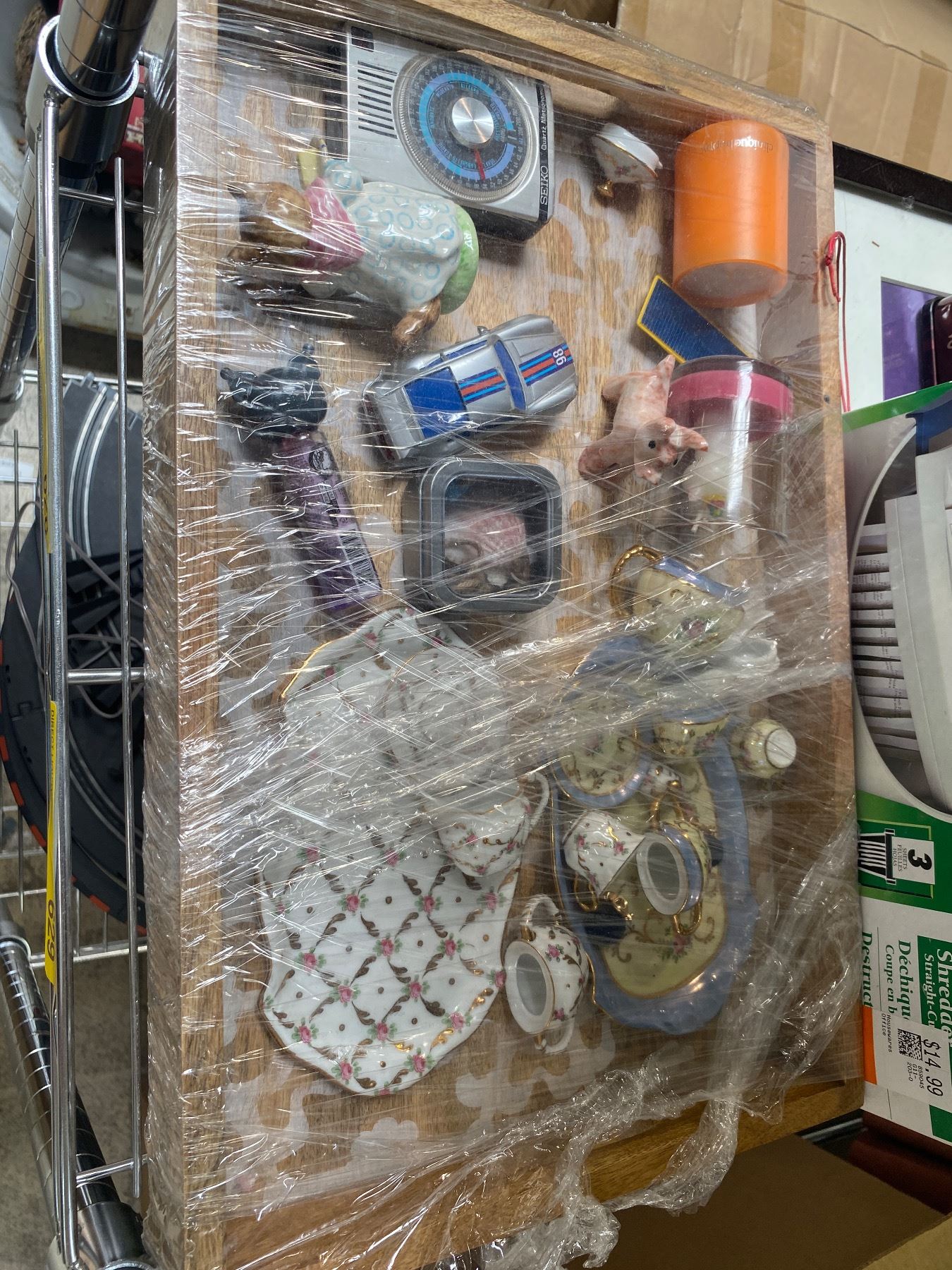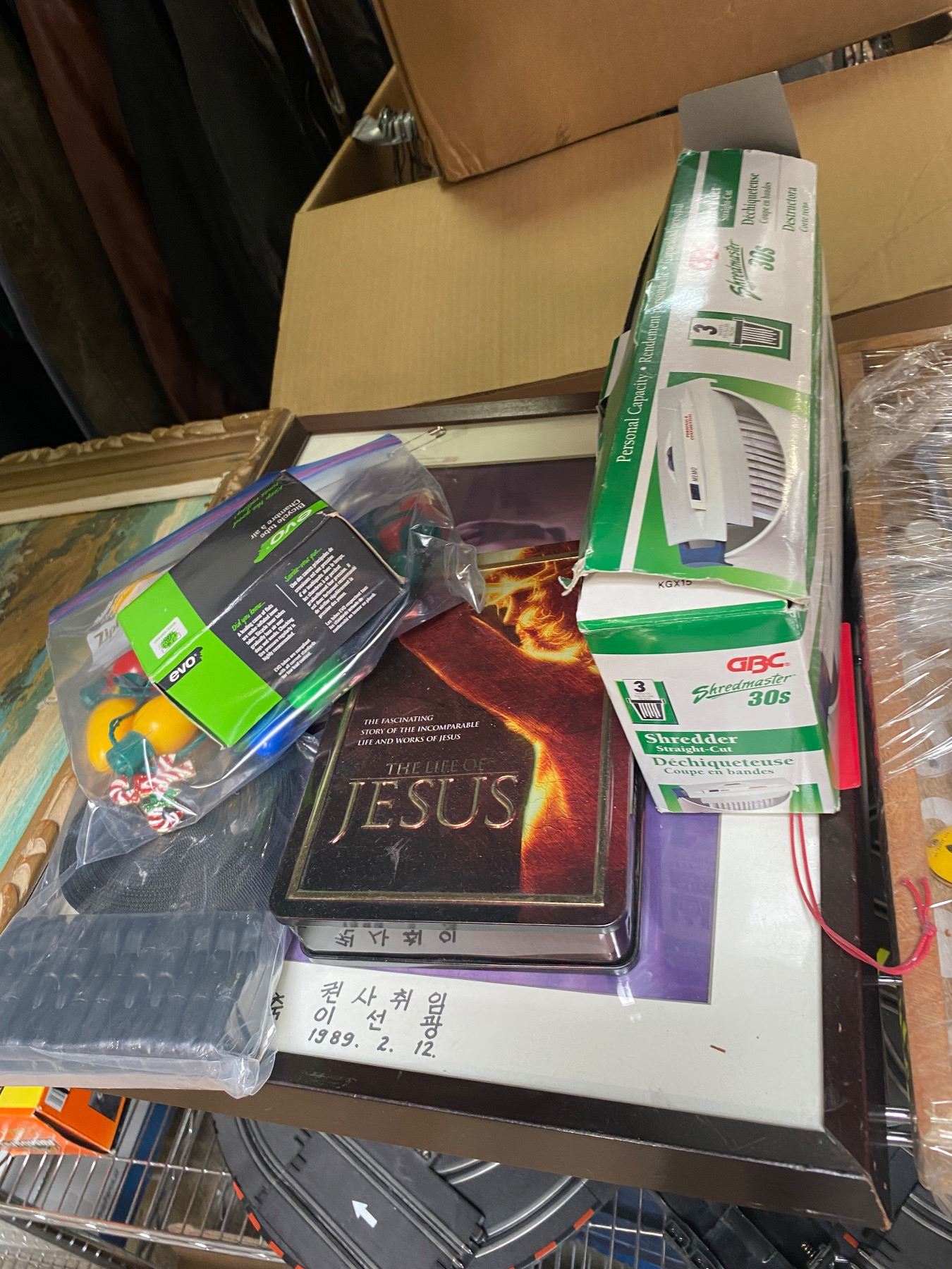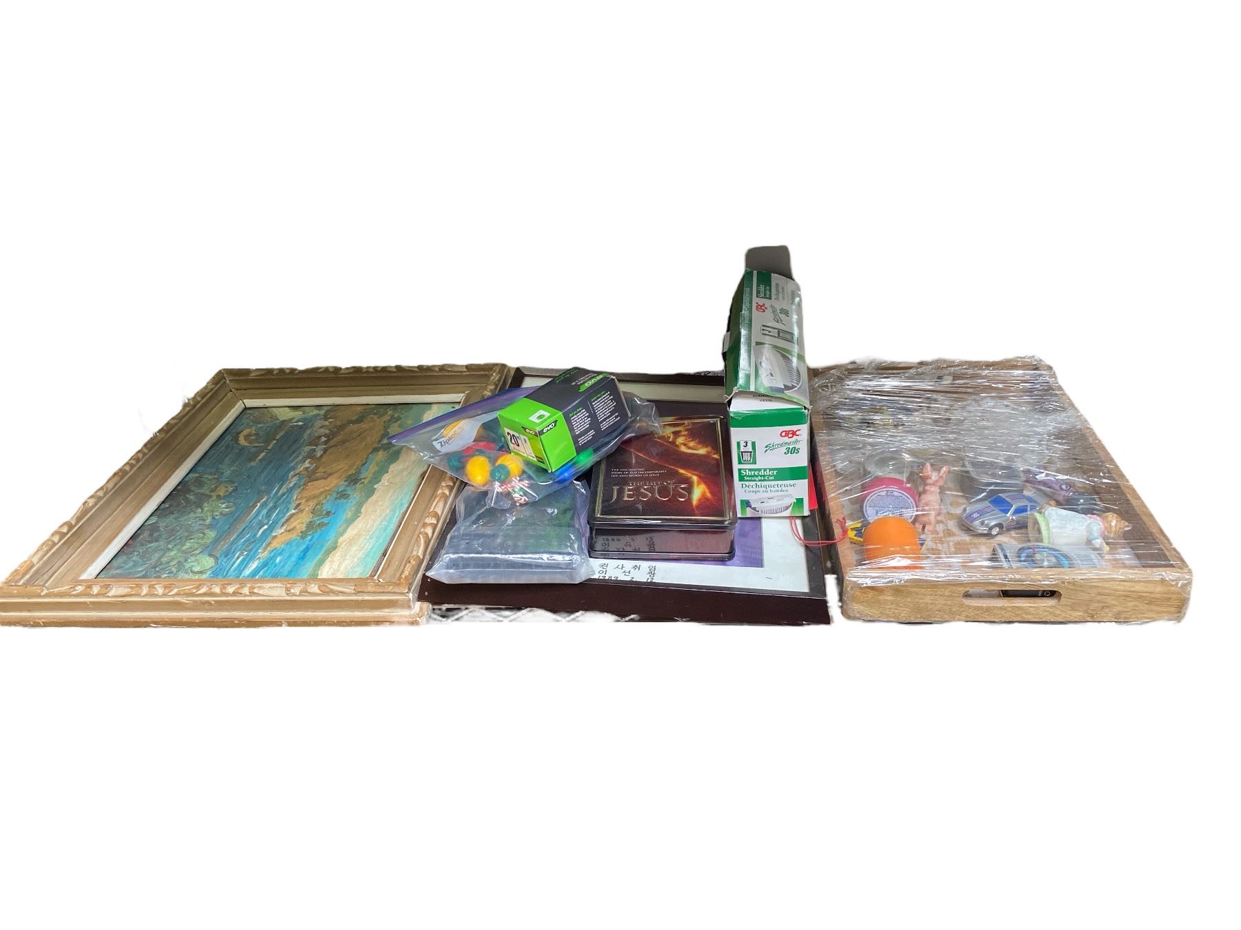 Shelf Lot of Toys, Art, Personal Shredder & Tray Etc.