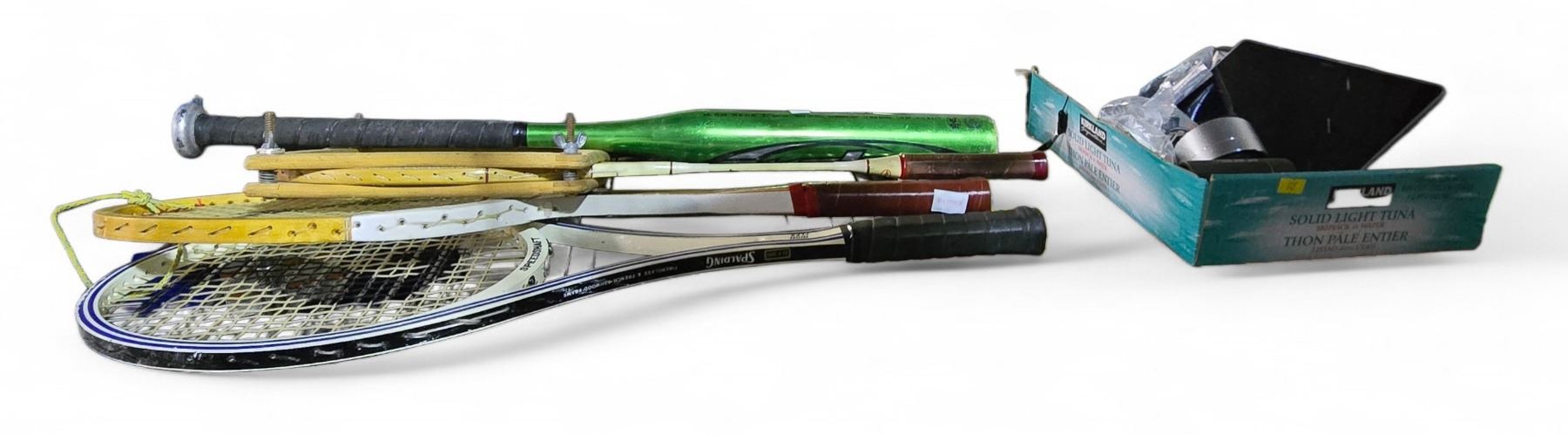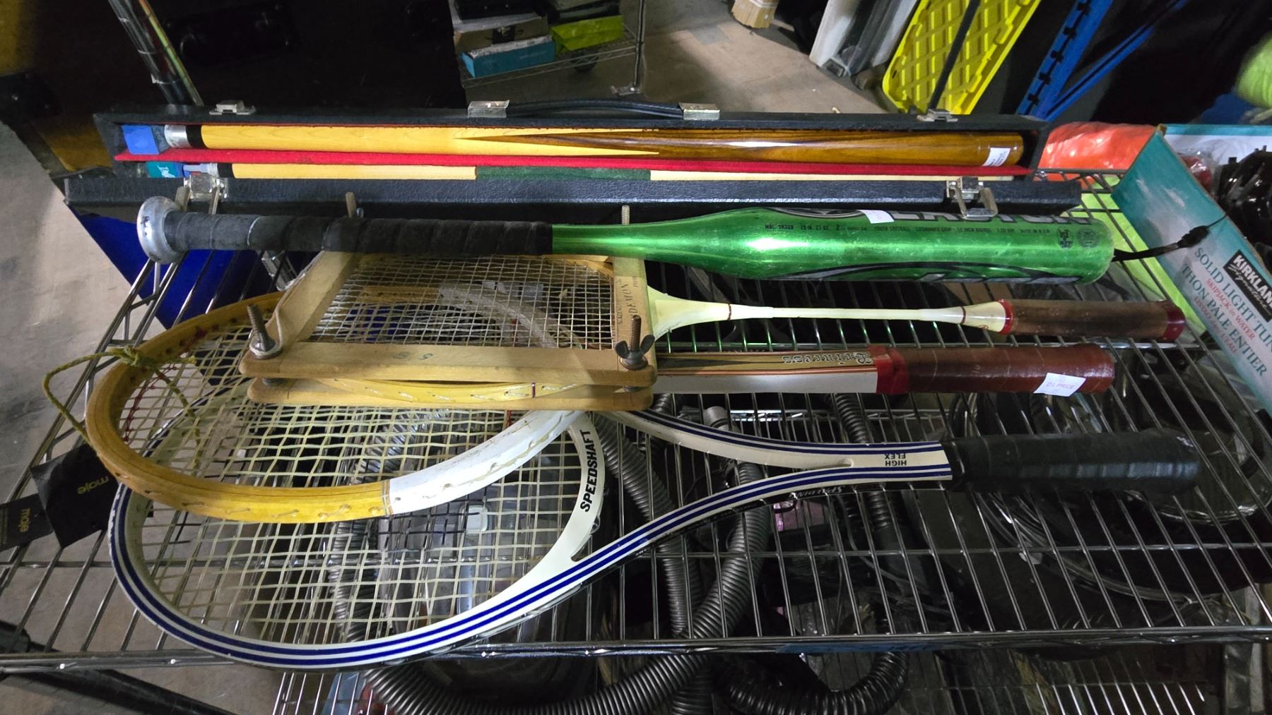 Shelf Lot of Vintage Tennis Rackets, Baseball Bat, Various Tablets, Snooker Stick, Etc.