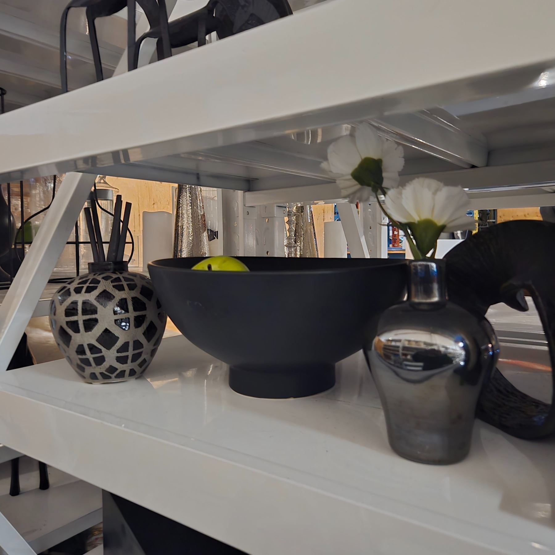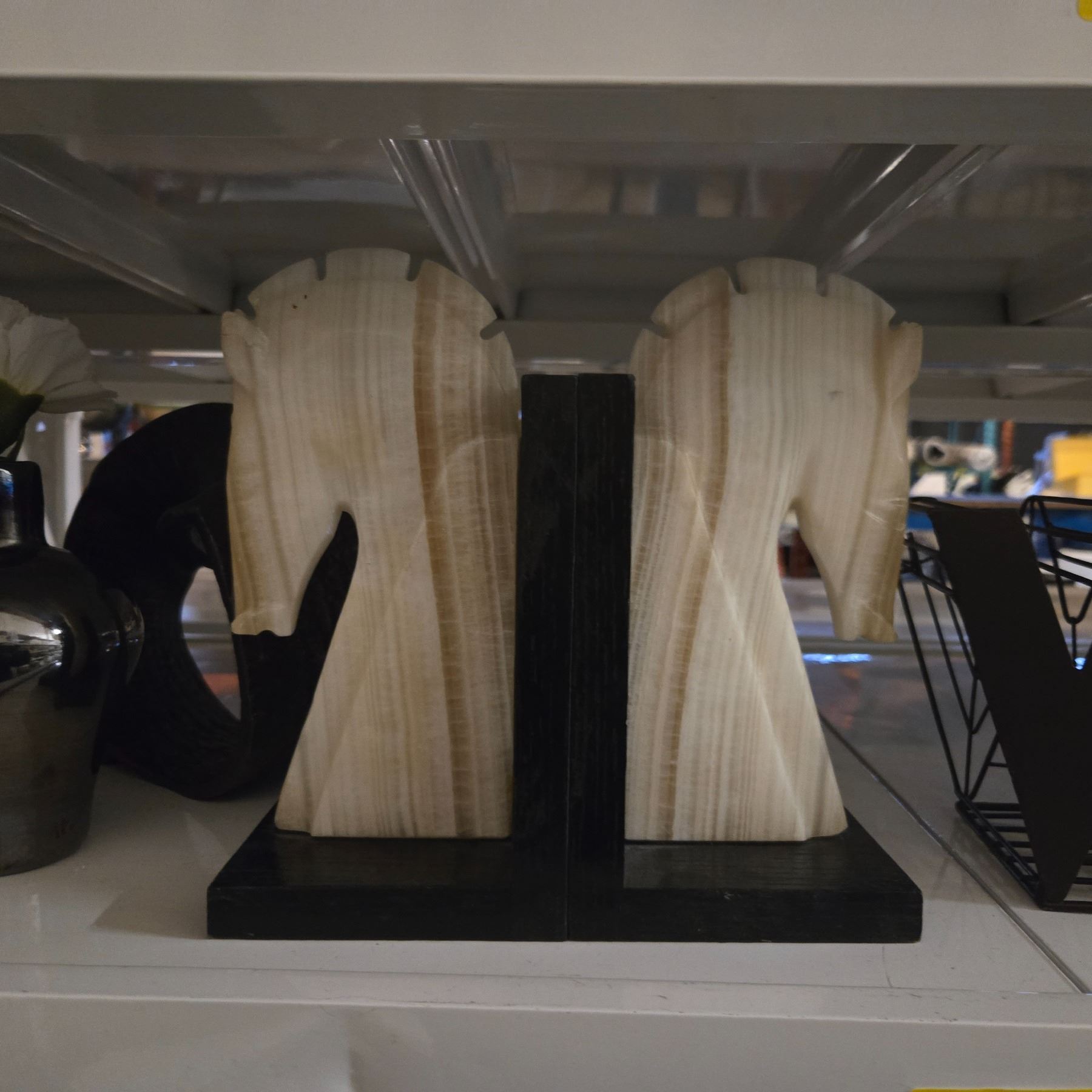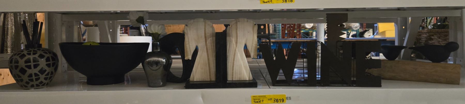 Shelf - Marble Horse Book Ends, Décor including Bowl, Vases, Sculpture, "Wine" Sign, Etc.