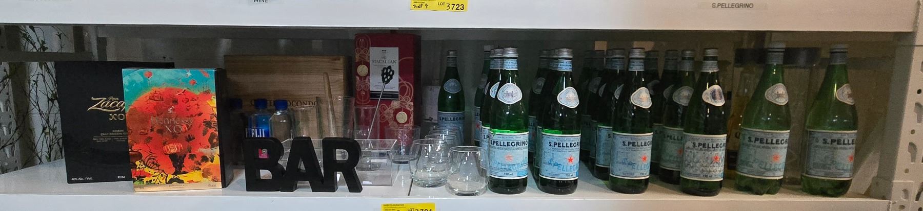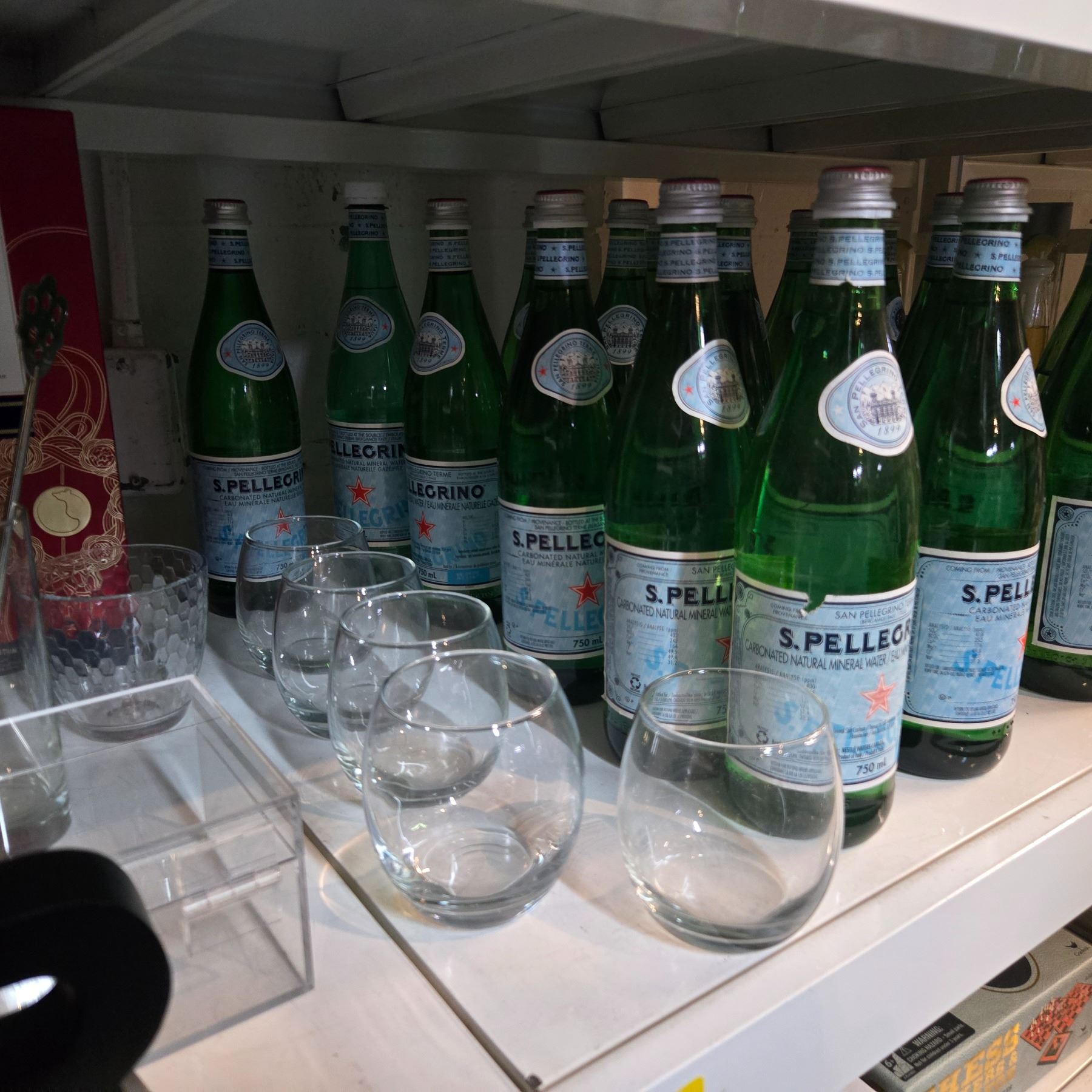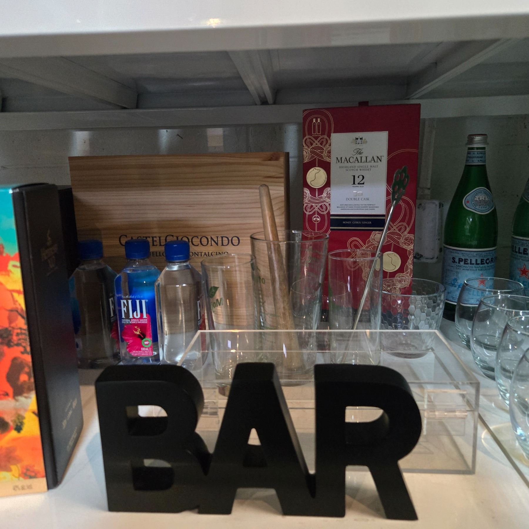 Shelf - San Pellegrino Bottles, "Bar" Sign, Glasses, Muddler, Etc.