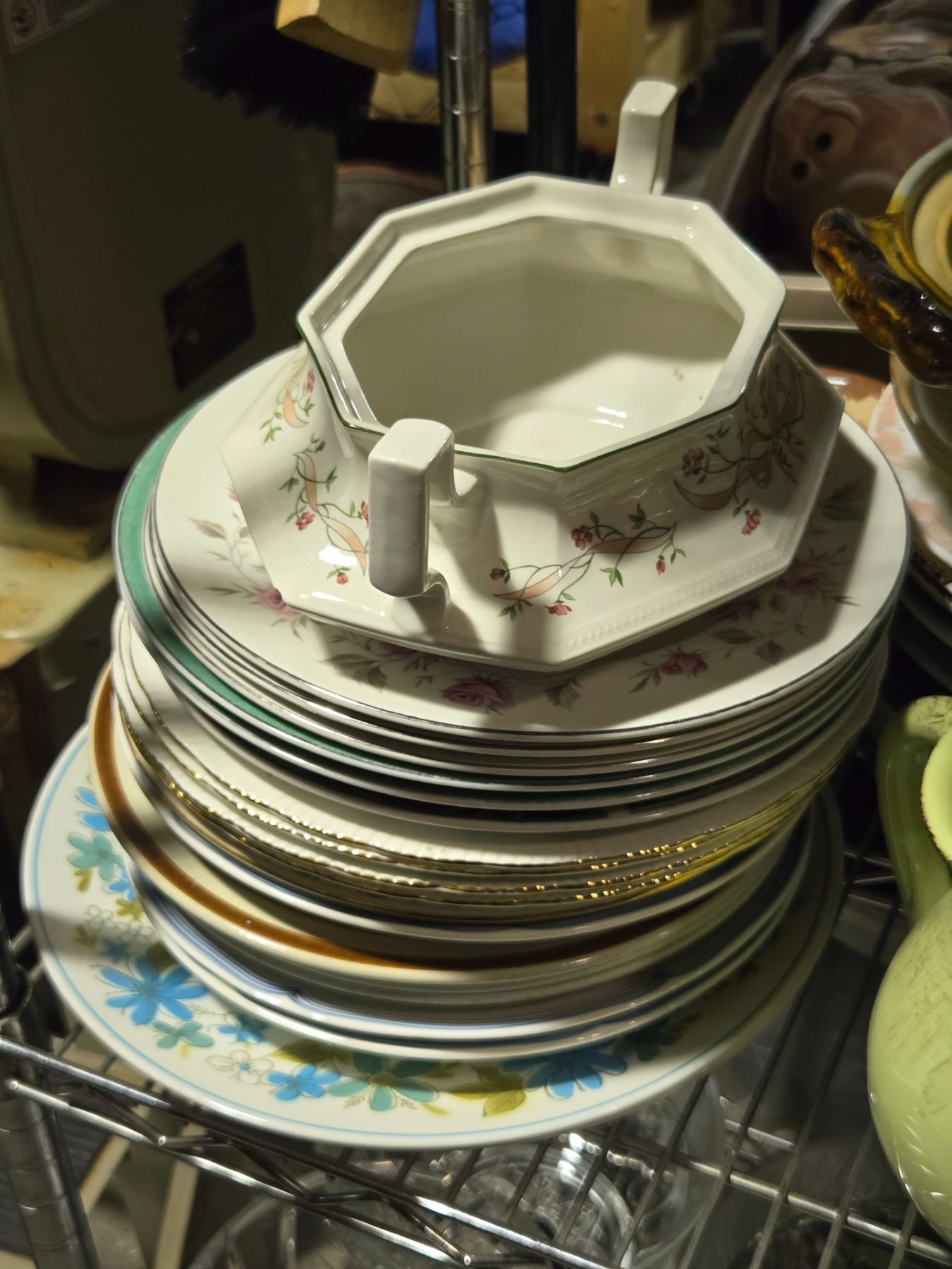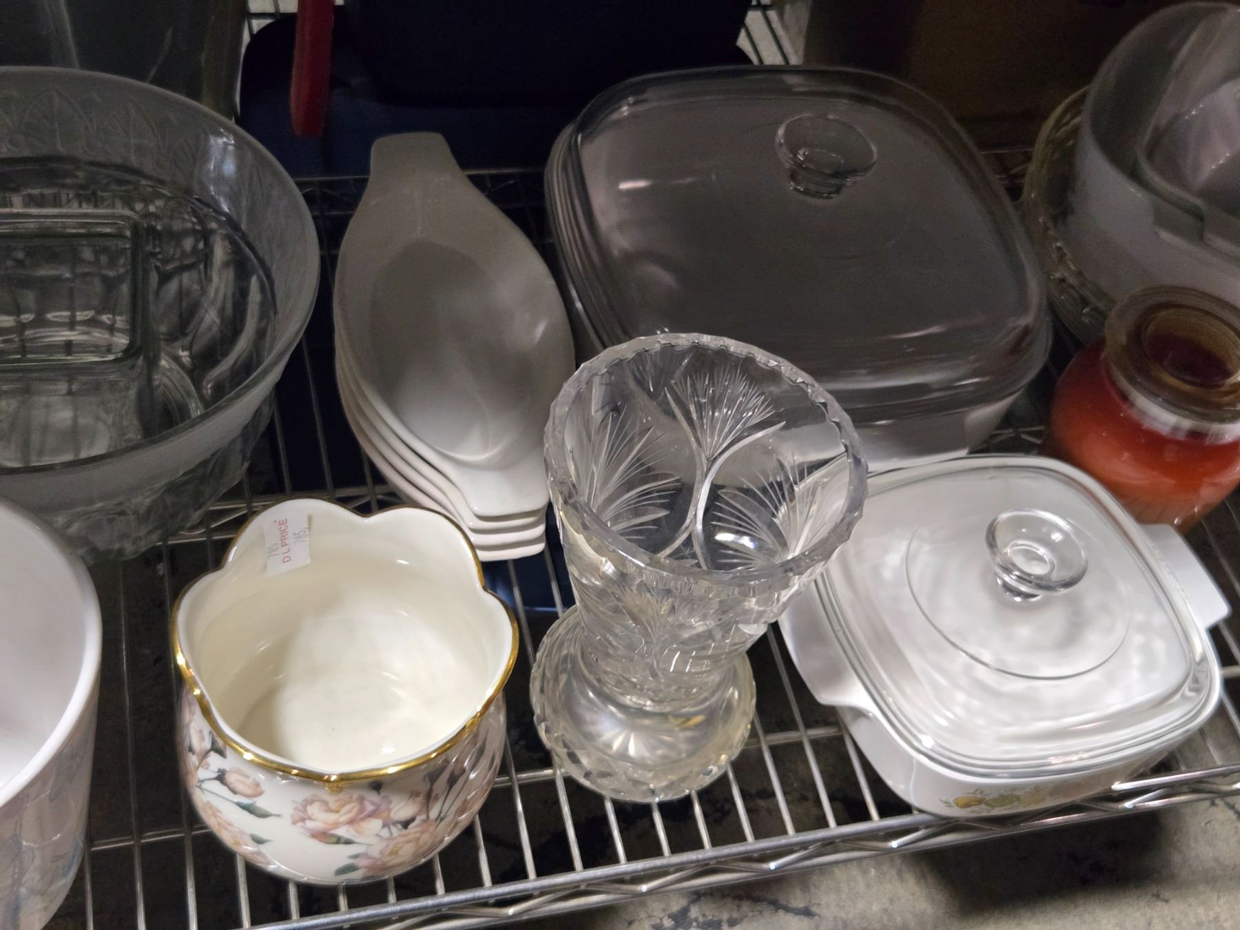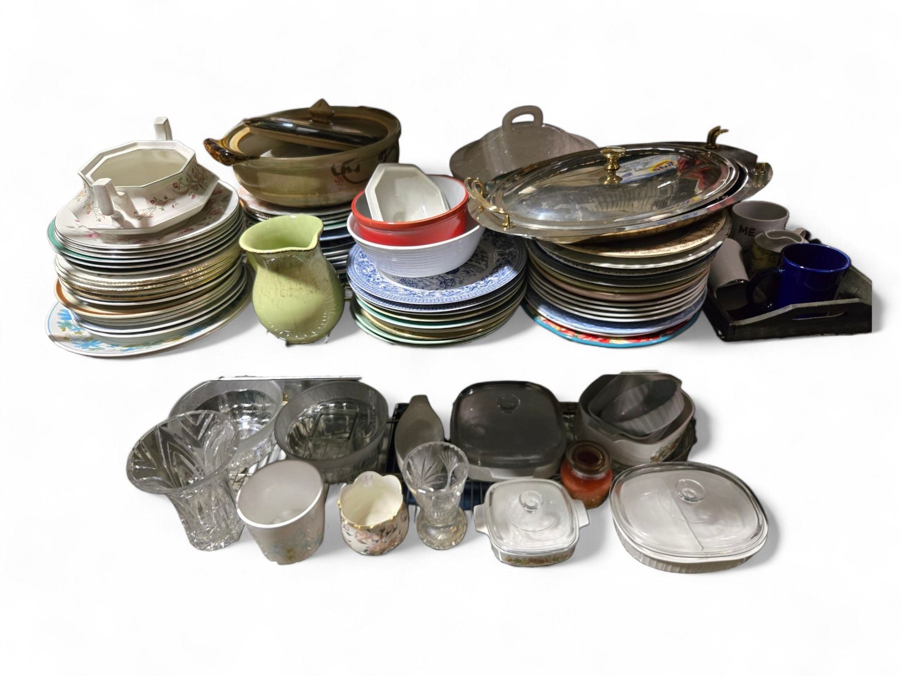 Shelf lot of Assorted Plates, Serving Tray, Cups/Mugs, Casserole Dishes, Etc.