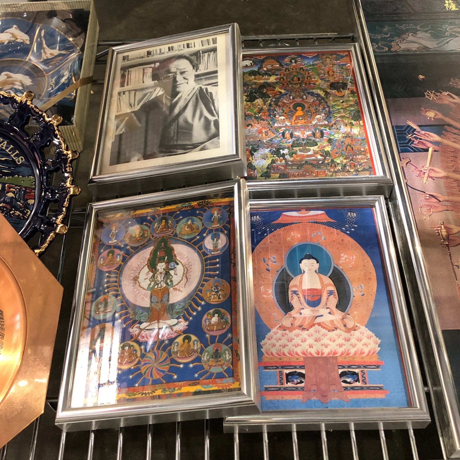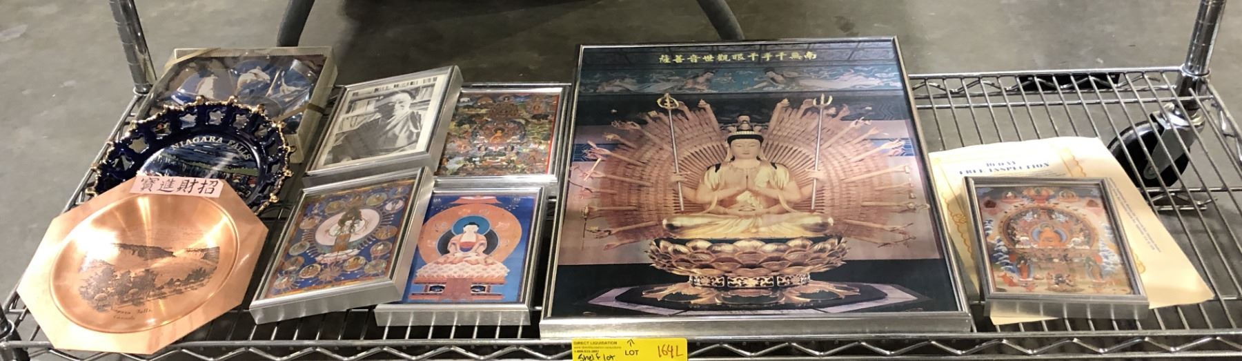 Shelf lot of assorted Chinese items - includes framed portraits of Buddha etc