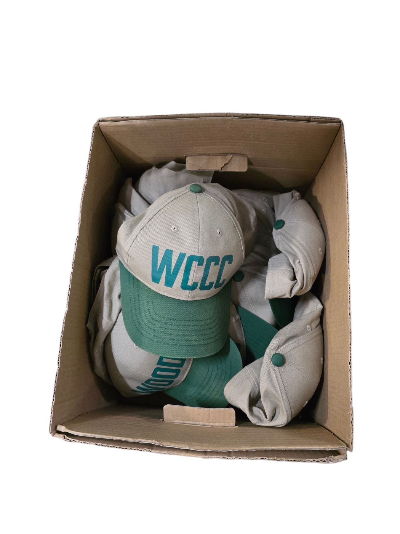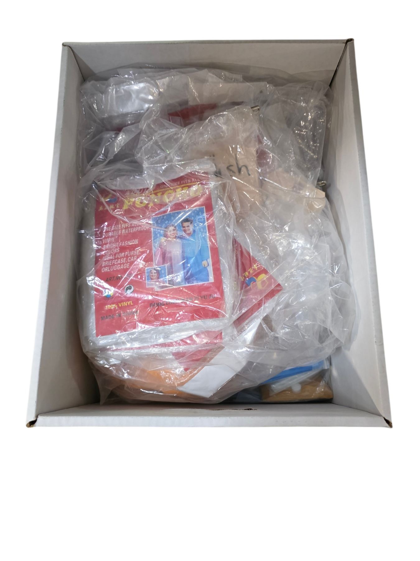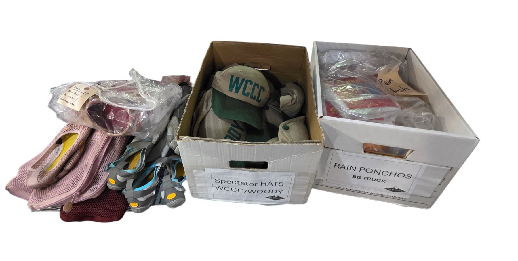 Shelf of Assorted Accessories and Footwear Includes WCCC Hats, Rain Ponchos, and Outdoor Shoes