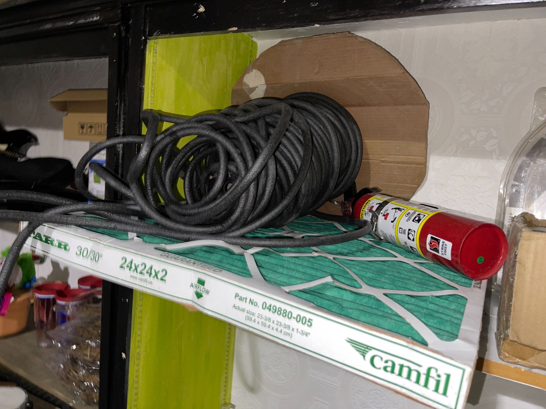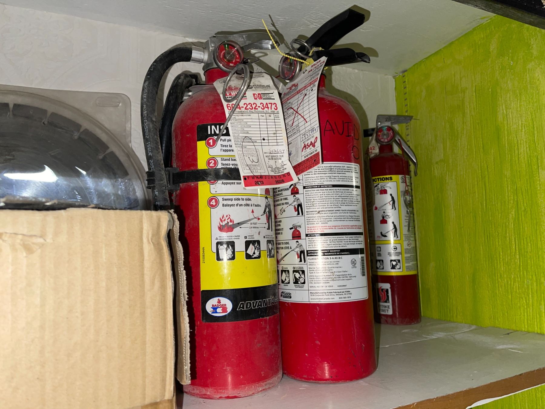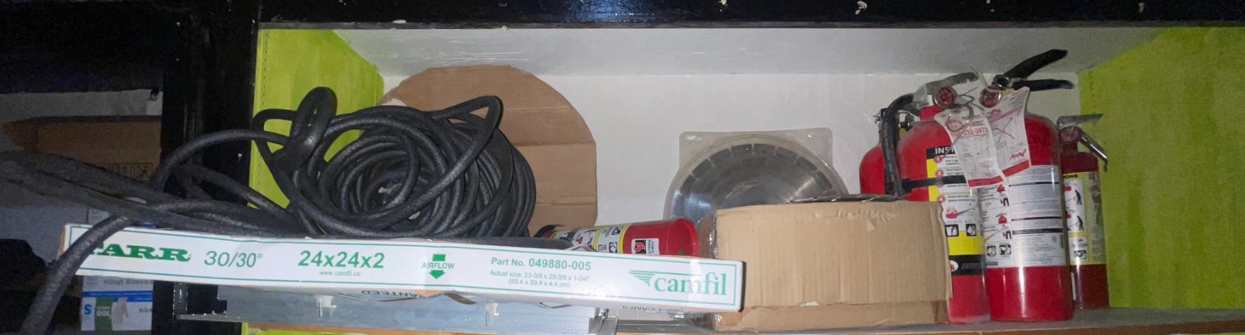 Shelf of Industrial Utility Items - Fire Extinguishers, Saw Blades, Air Filter, and More