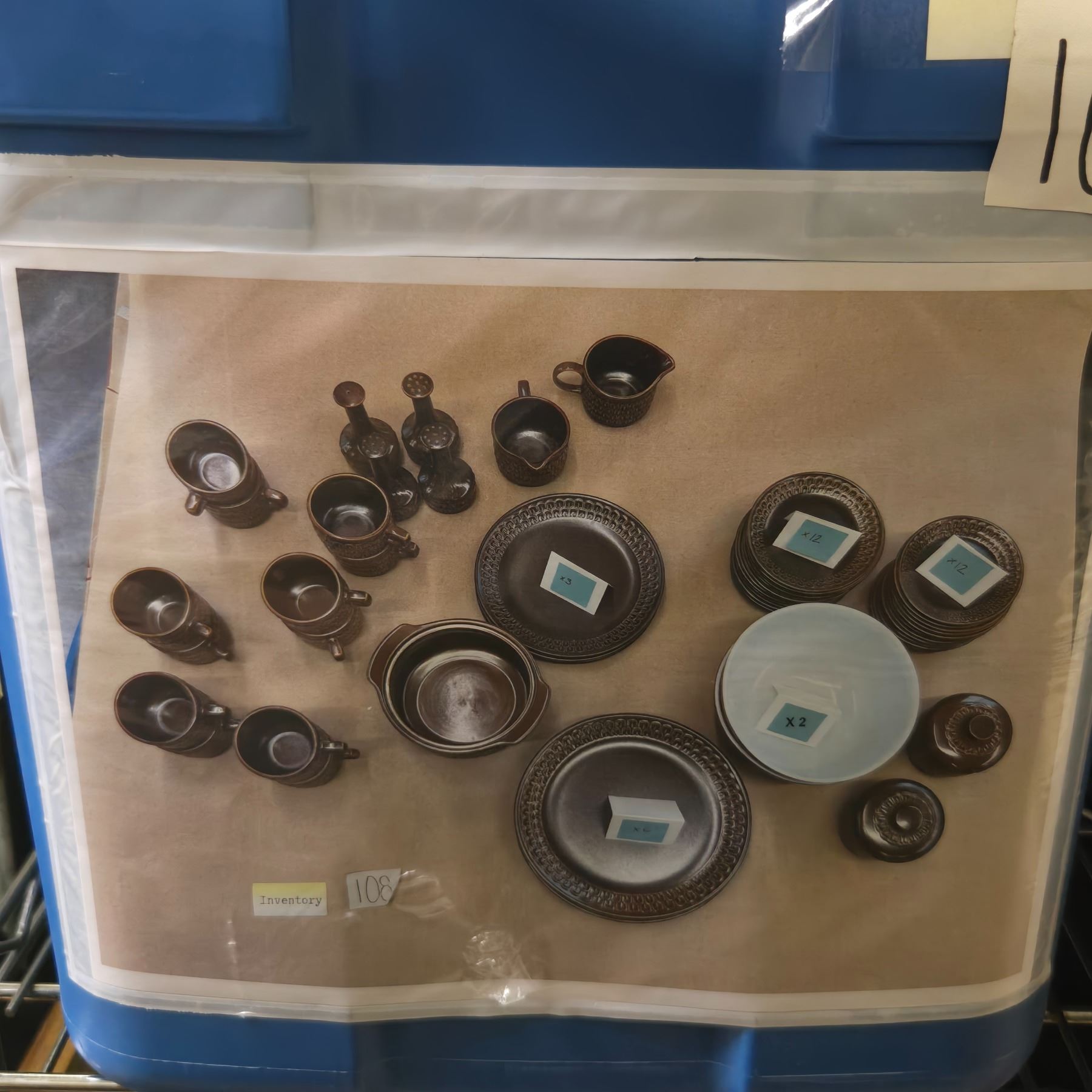 Shelf of Movie Set Items - Dish Set, Glassware, and Various Prop Accessories