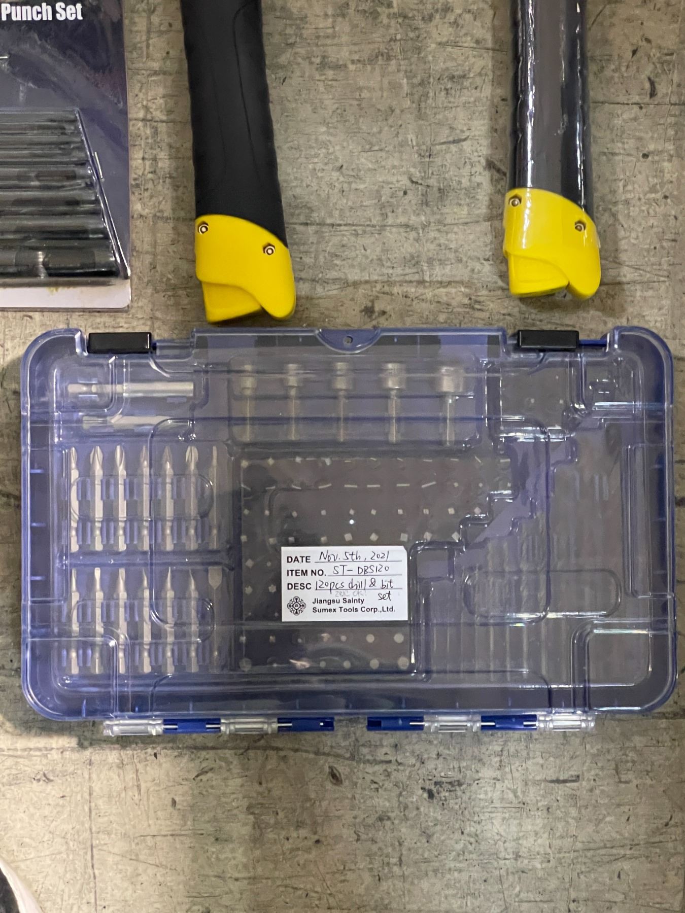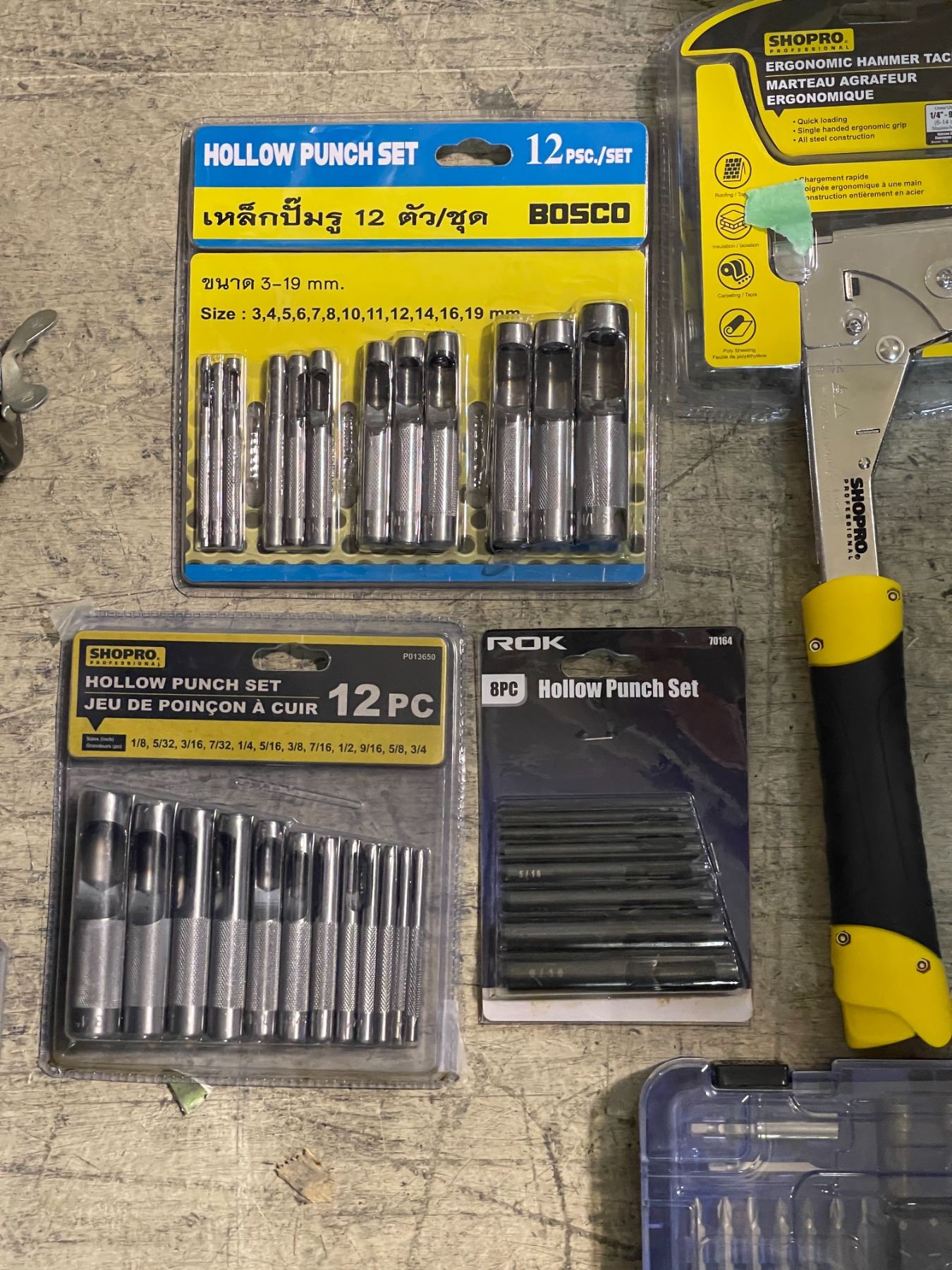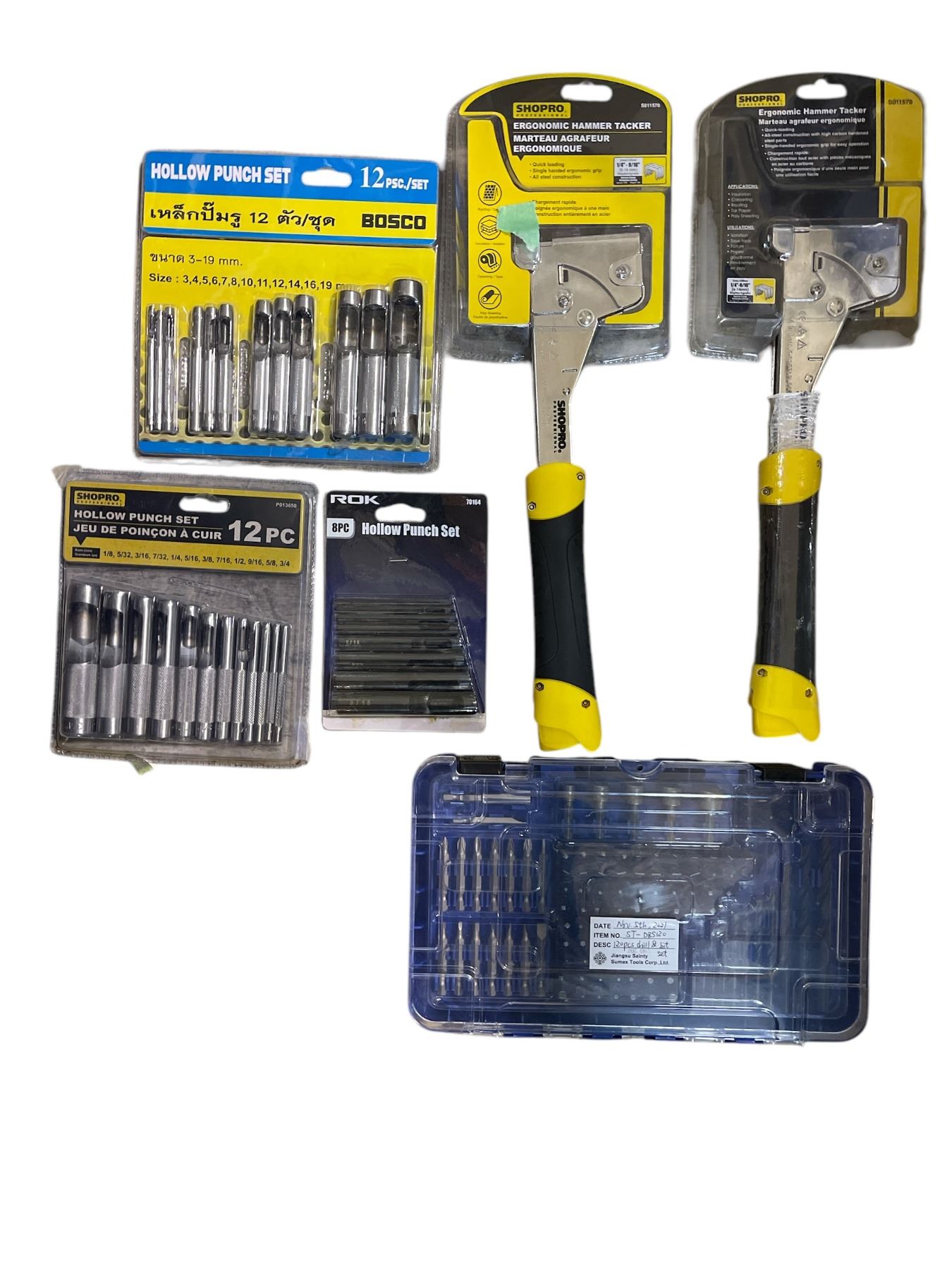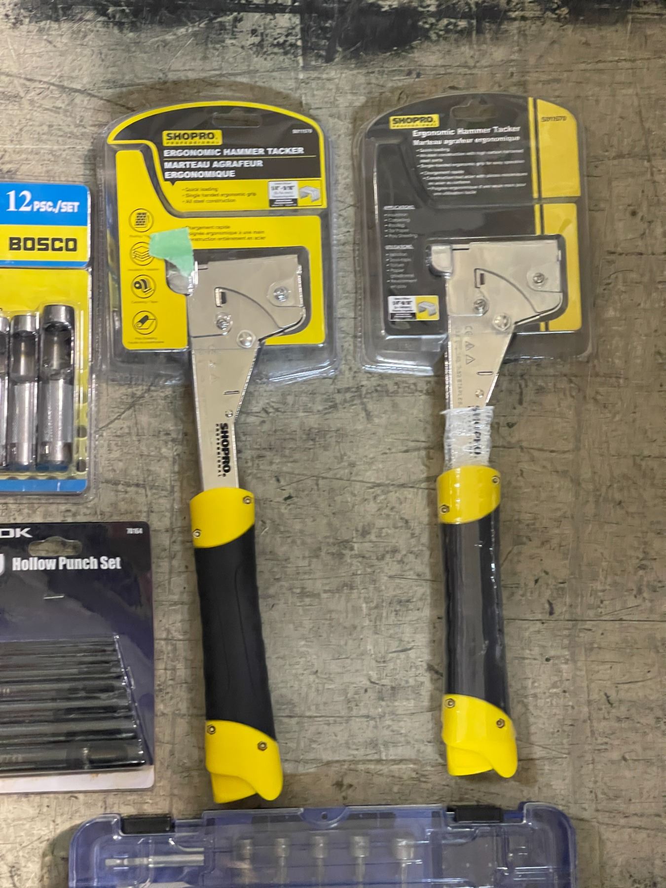 Shelf of assorted NEW tools - includes 2 SHOPRO ergonomic hammer tacker / ROK hollow punch set etc