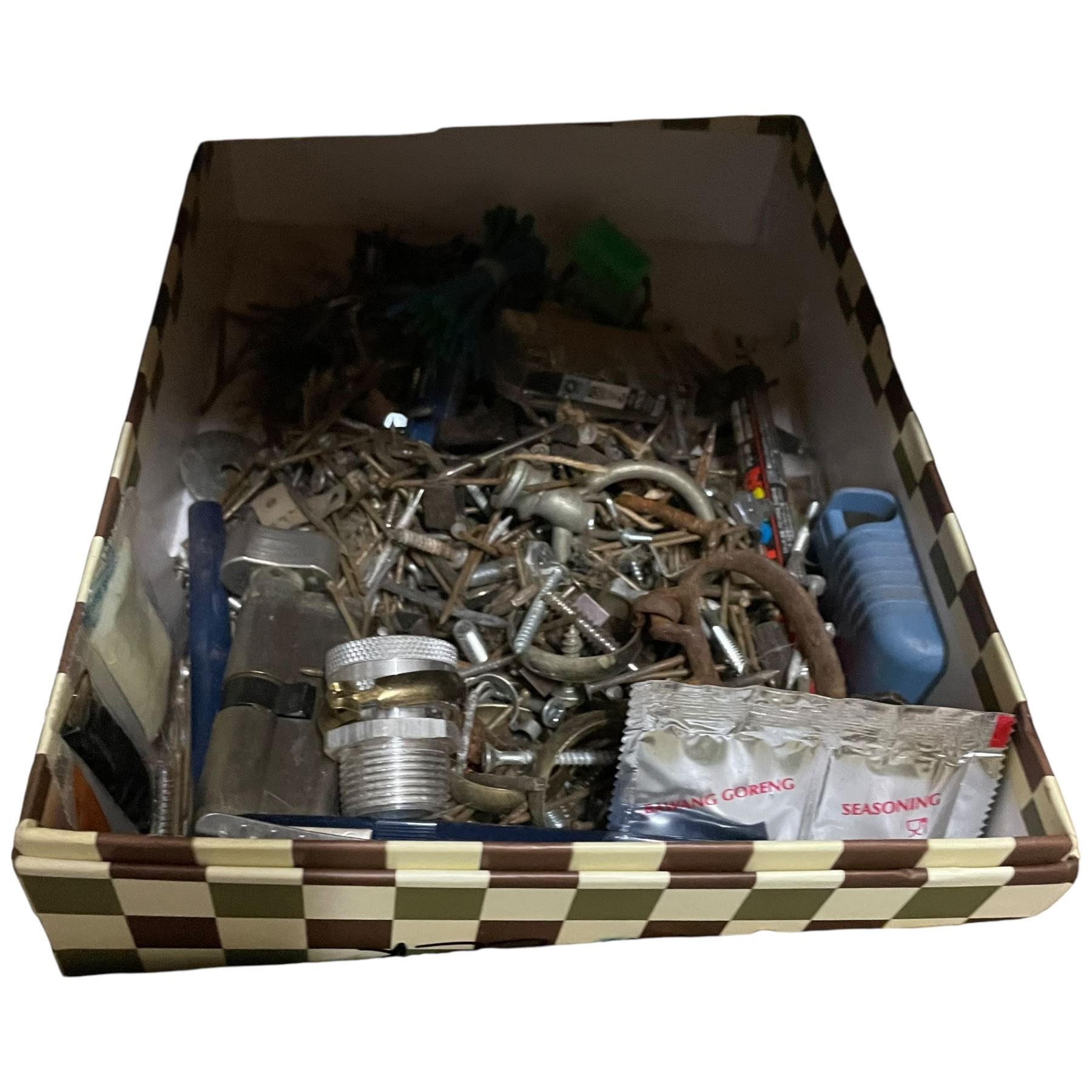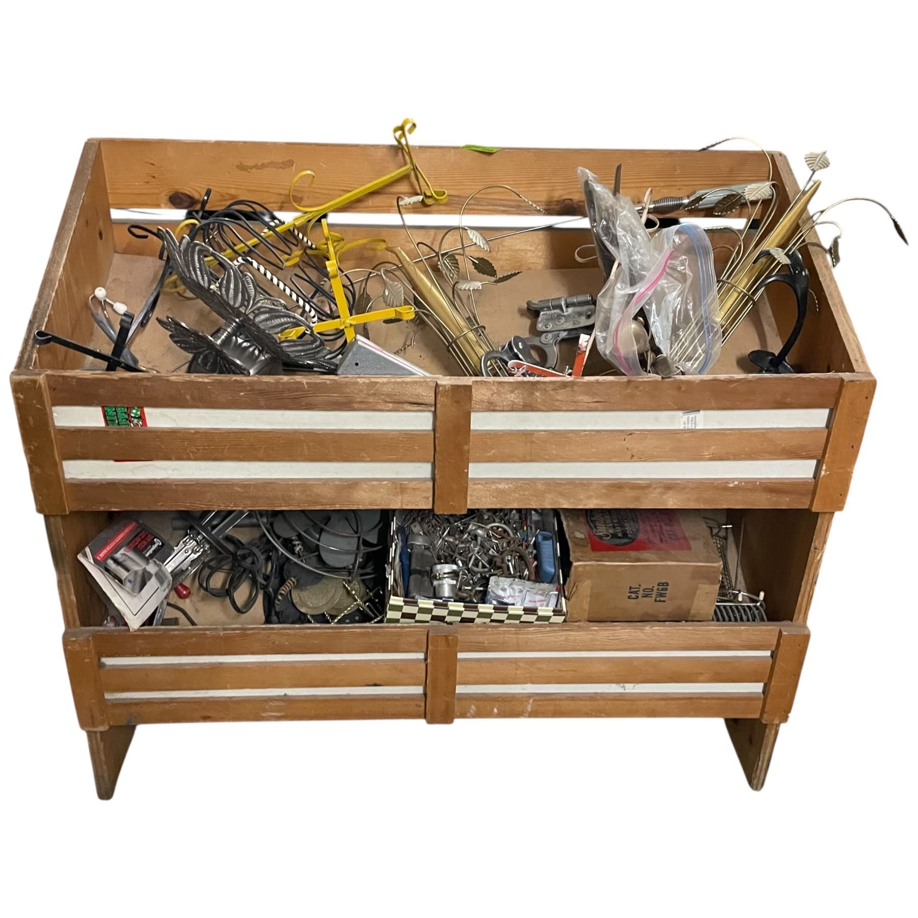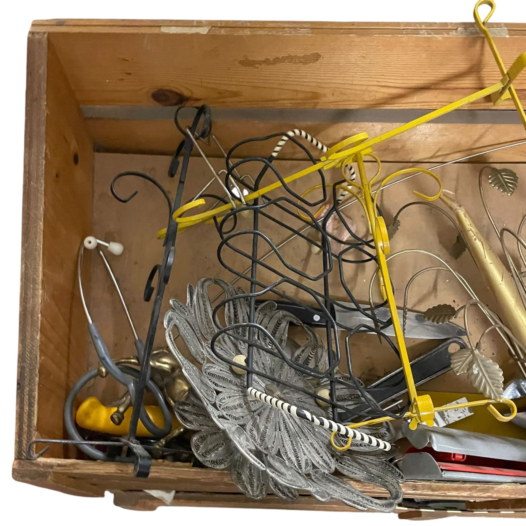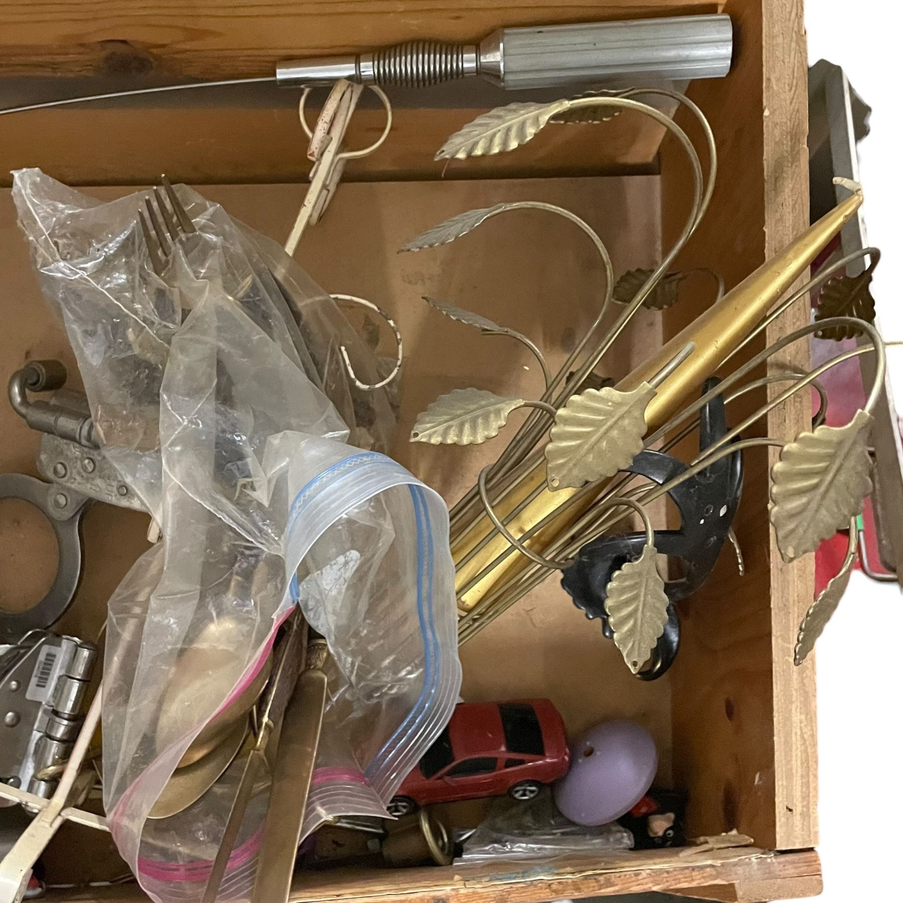Shelves and Contents: Brass, Tools, Brass Flatware, Decorative Items and More