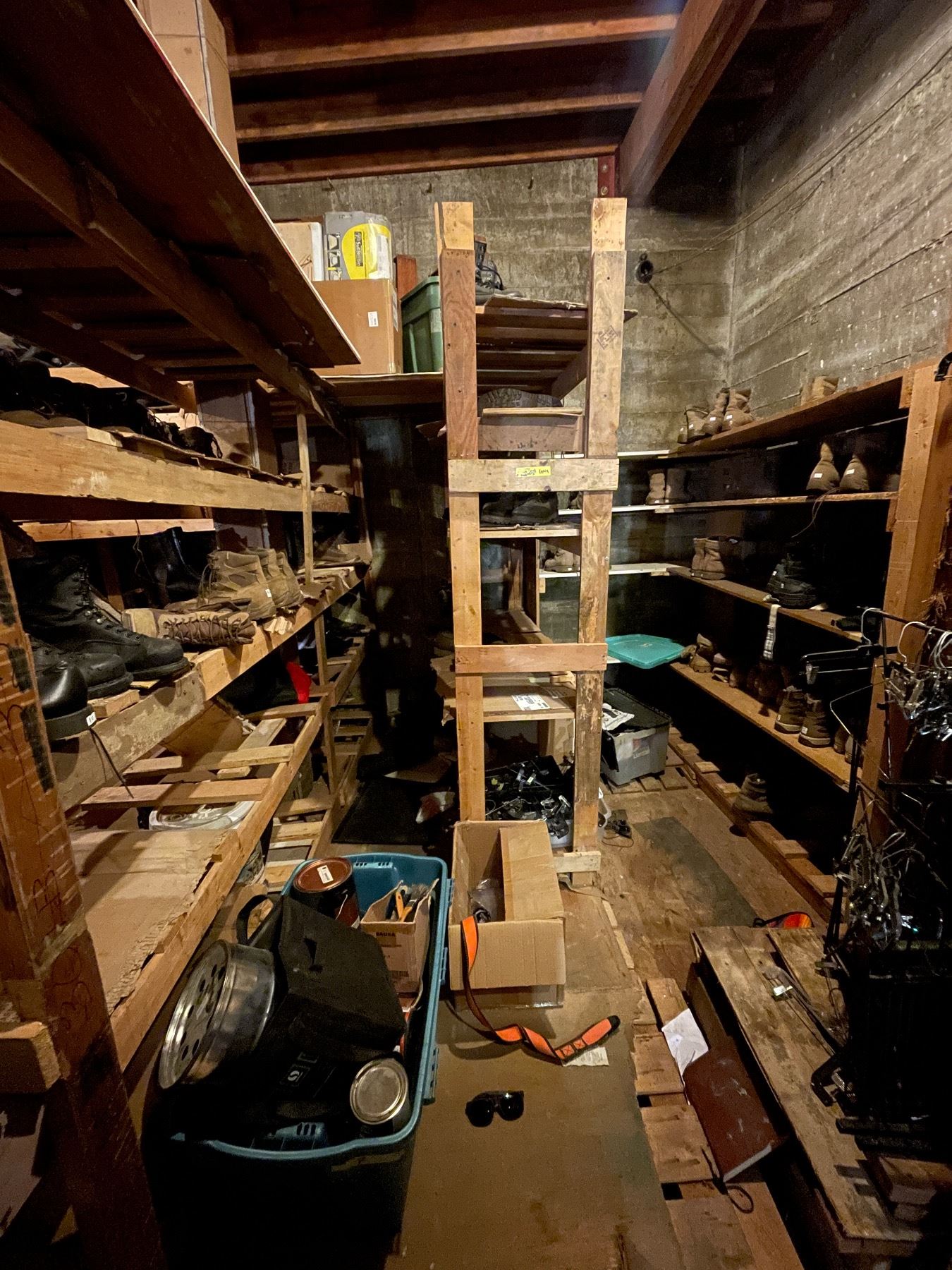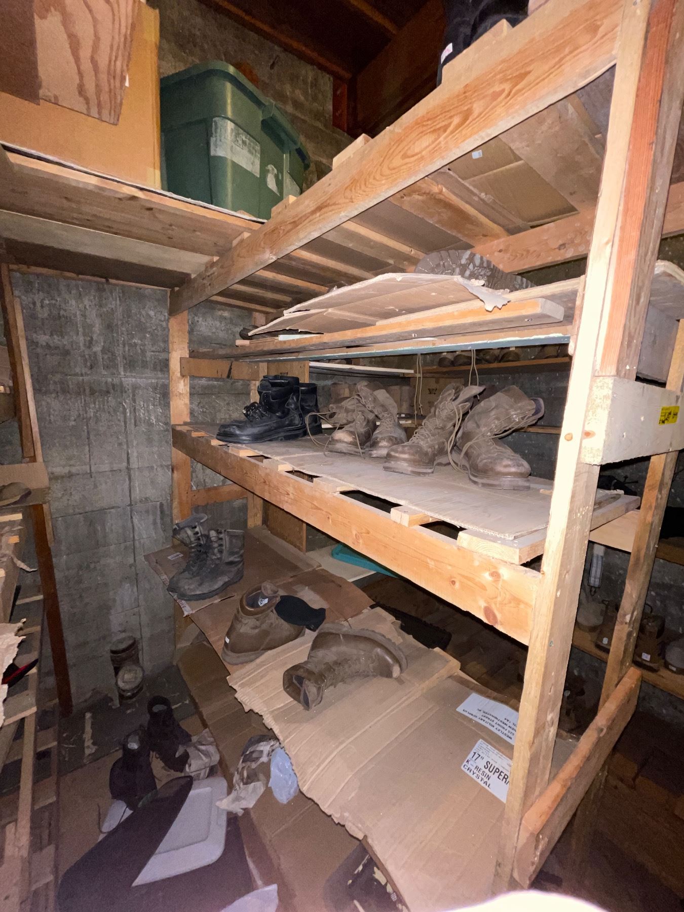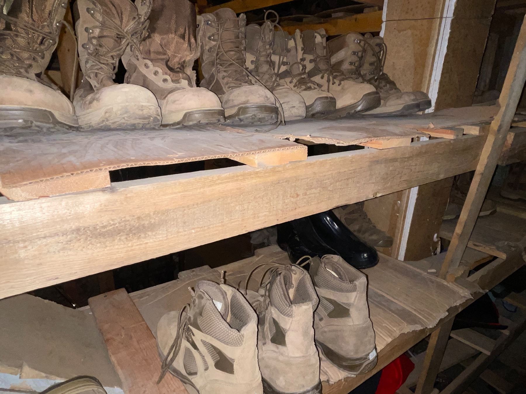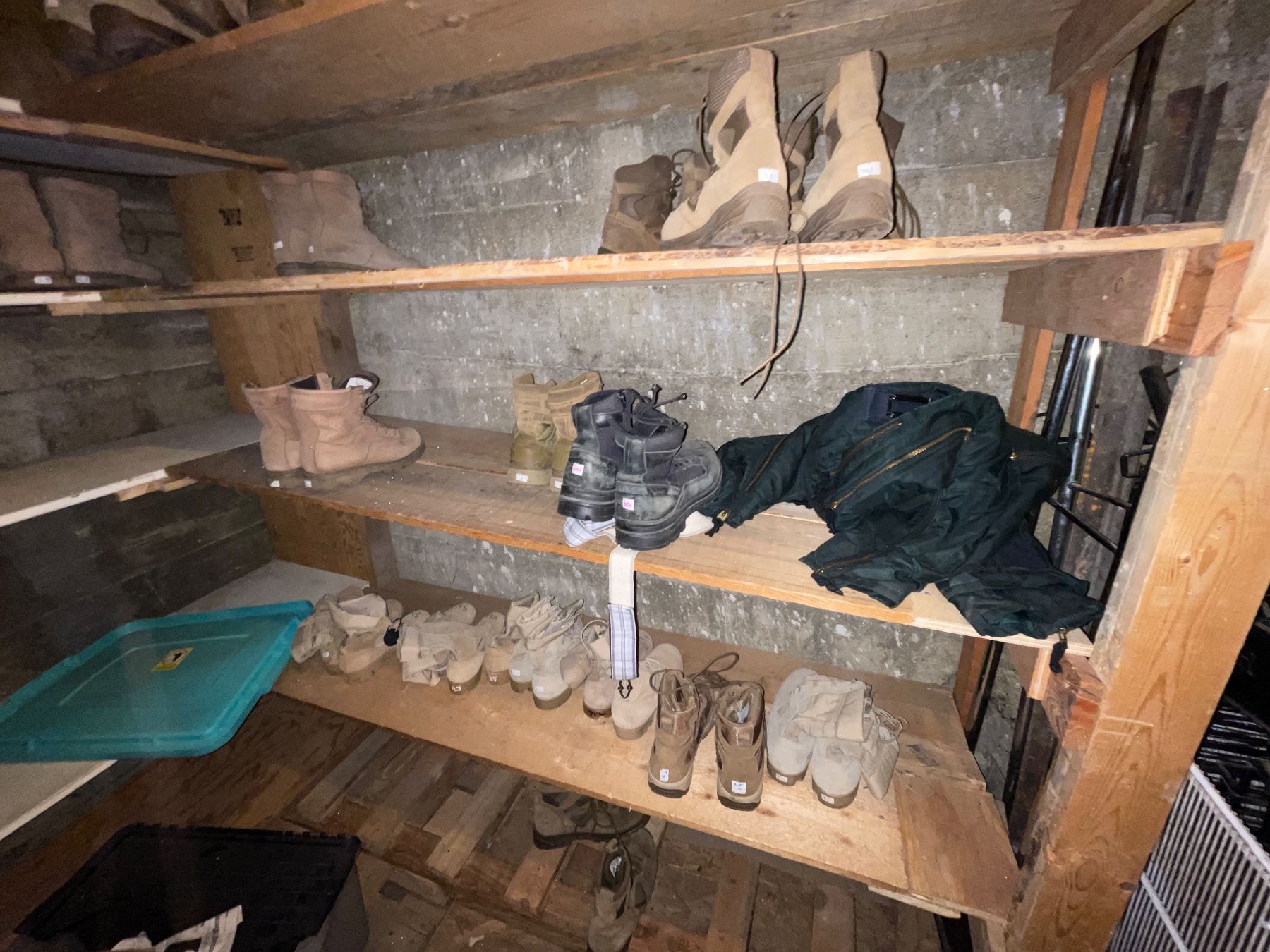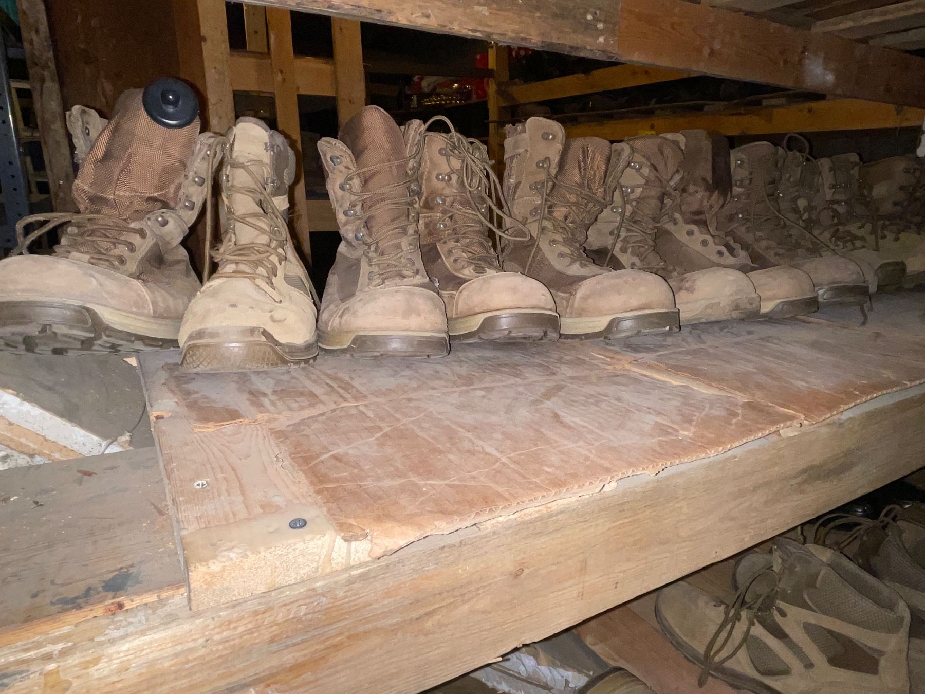 Shelving units full of assorted millitary boots & misc items (shelving units included - approx 7ft long)
