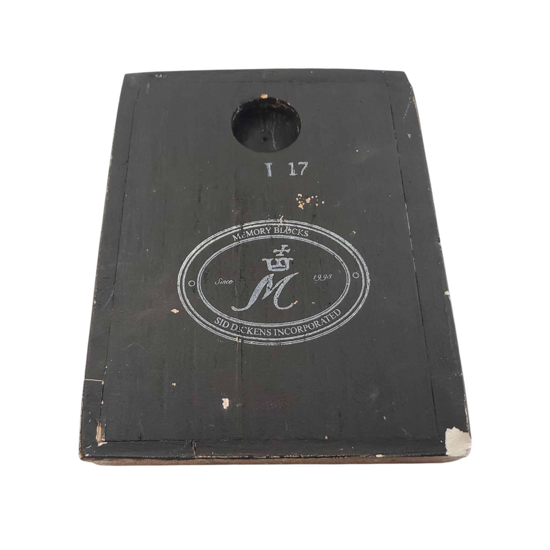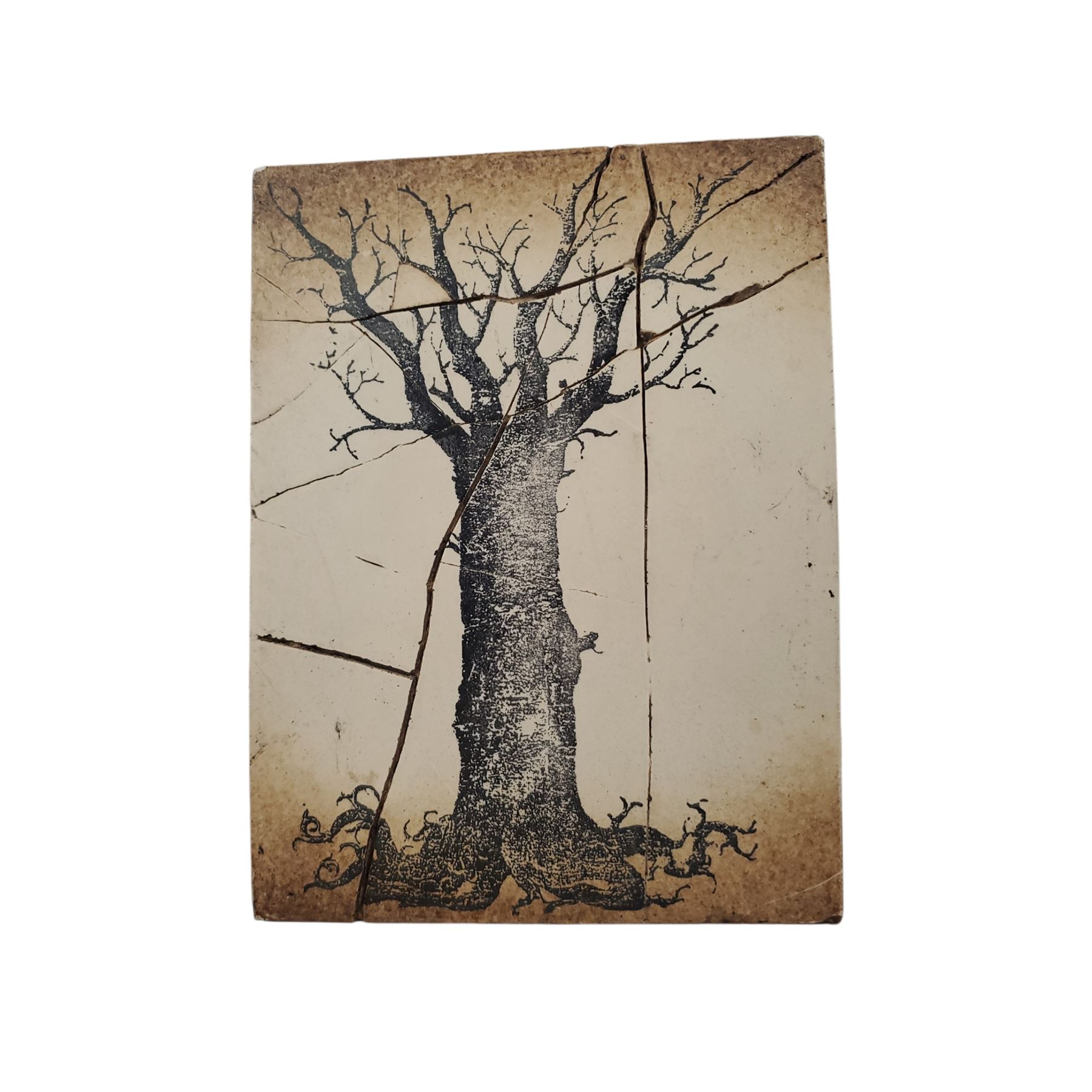 Handcrafted Sid Dickens Memory Block, 6x8 inches, model T-17 (retired). Features a stylized black Tree of Life with deep roots on a parchment-colored, aged-template background with a distressed, cracked finish. Made of plaster with a wooden back and pre-drilled hole for hanging. Symbolizes growth and grounding.