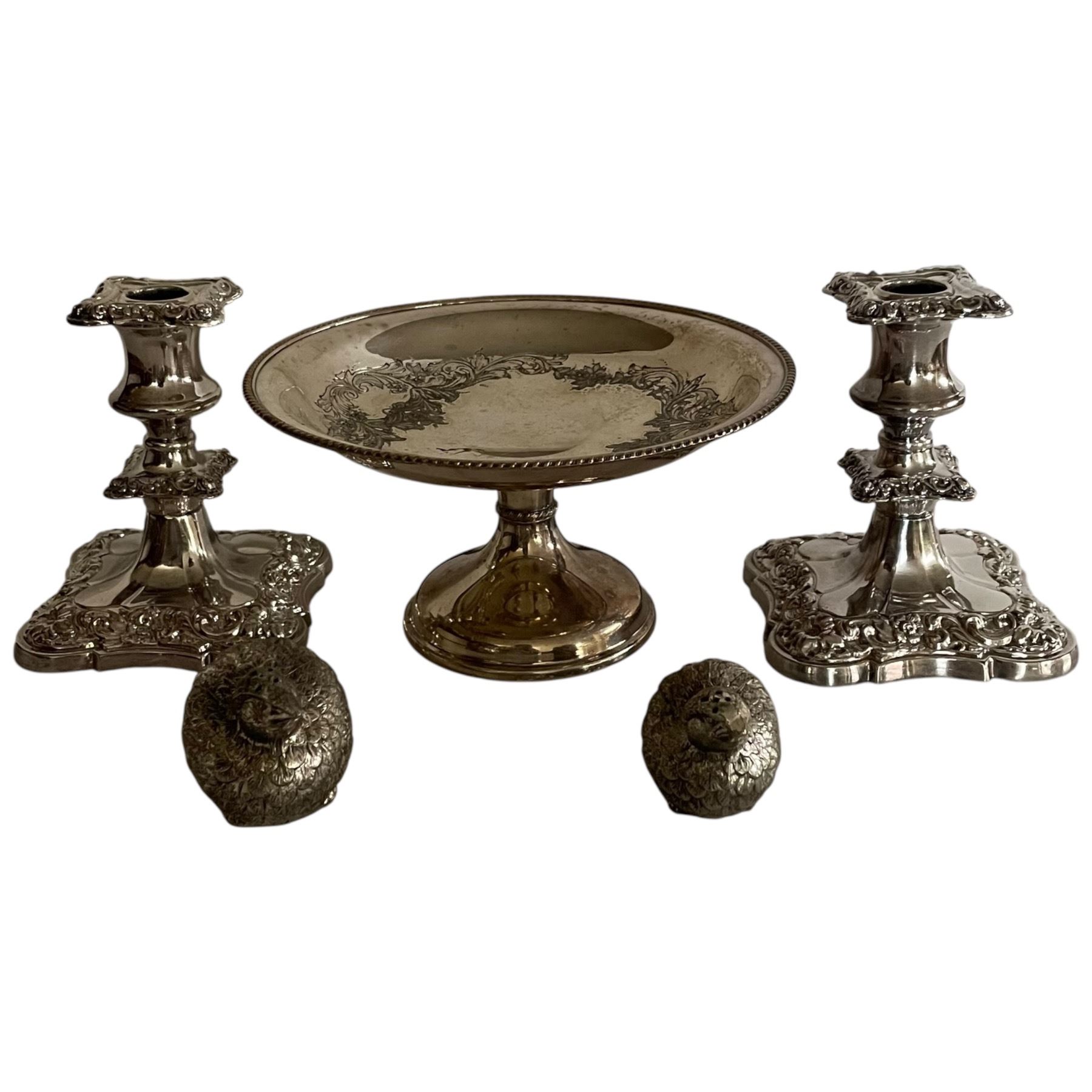 Silverplate and Pewter Items: S&P Shalers, Candlestick Holders and Cake Plate