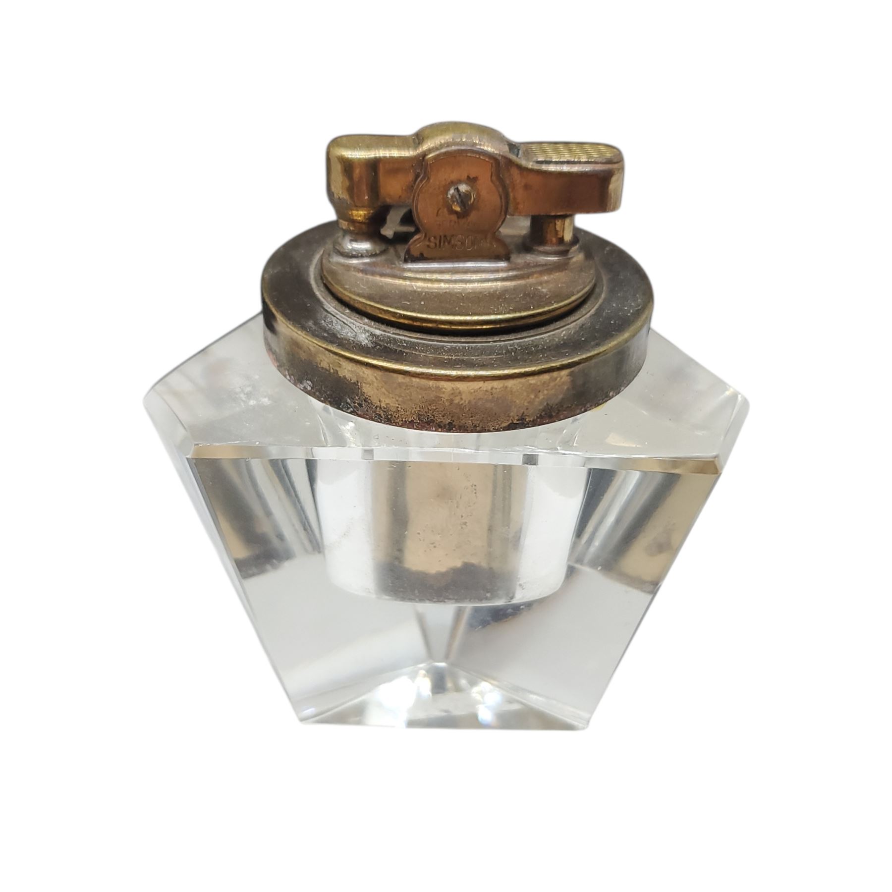 Vintage crystal table lighter by Simson Germany, crafted mid-20th century. Features a hand-cut, faceted clear crystal base designed to refract light, paired with a removable brass lighter insert. Associated with Mid-Century Modern and Hollywood Regency styles, this decorative tobacciana piece likely dates to the 1960s-1970s.