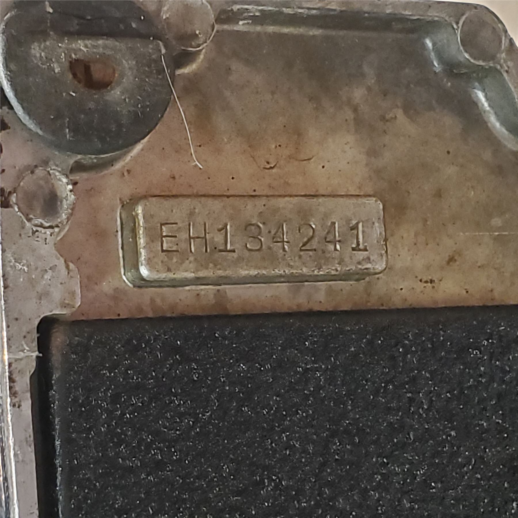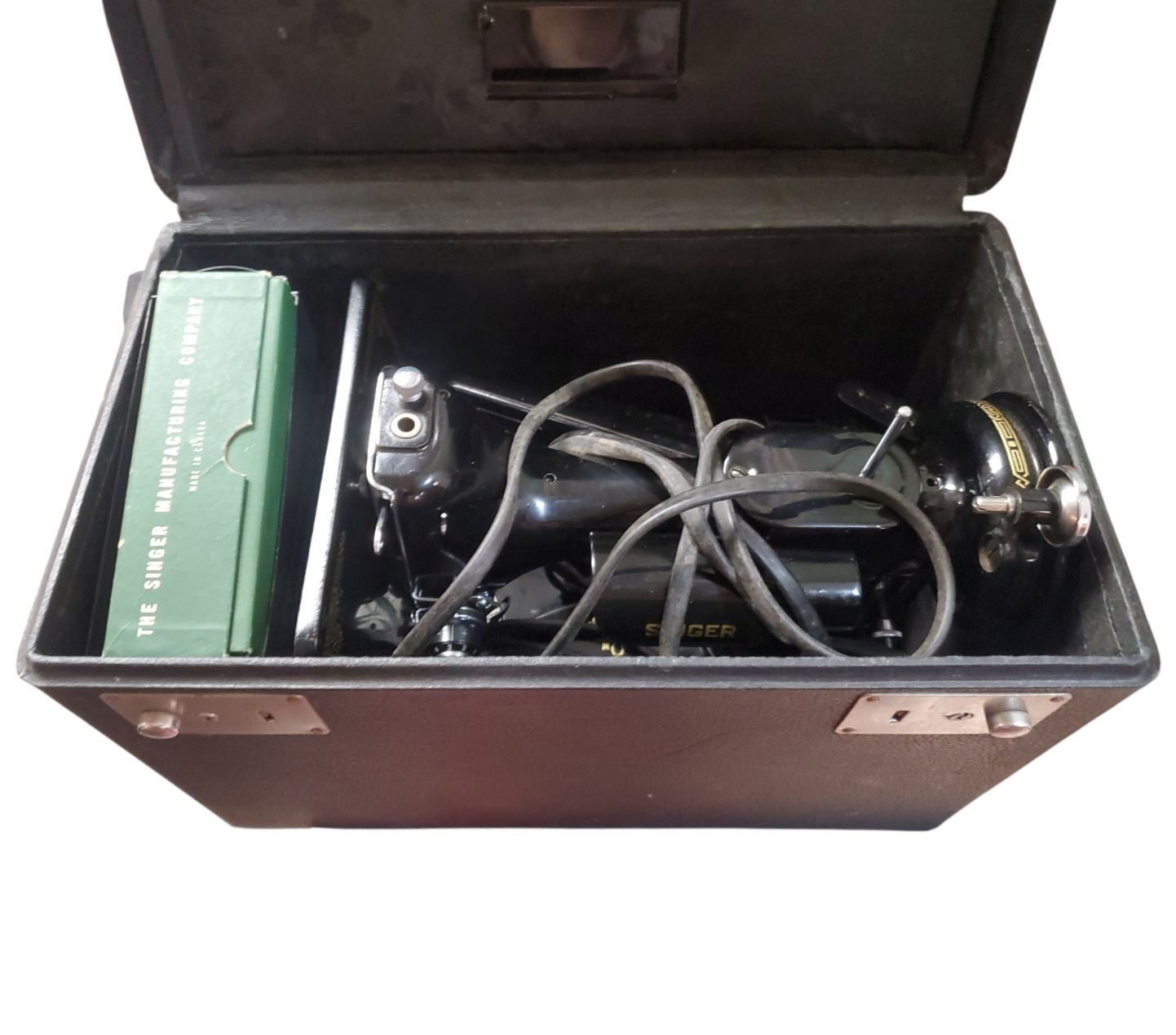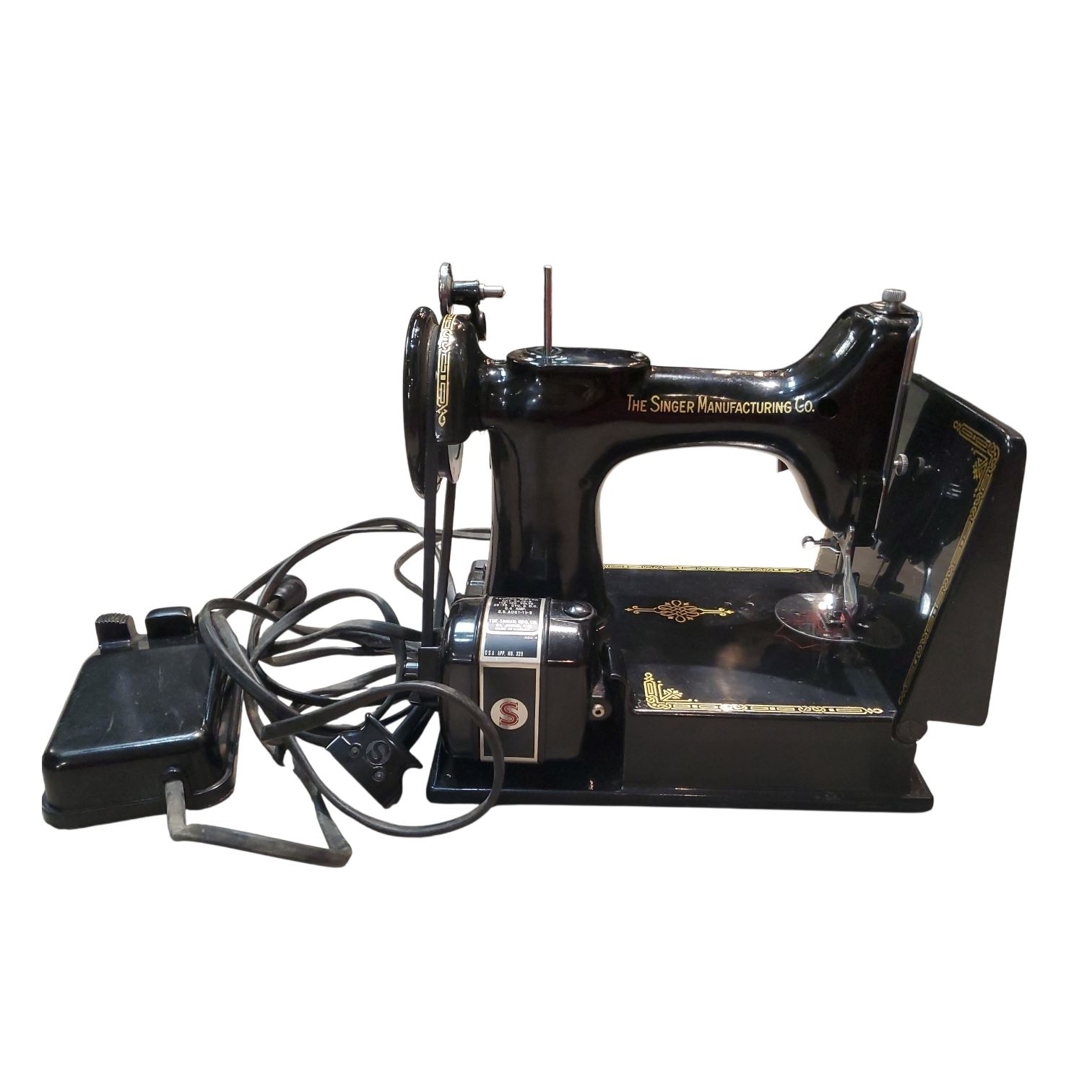 Singer 221K Featherweight sewing machine, serial number EH134241, manufactured in Kilbowie, Scotland. Part of a batch of 10,000 commissioned on October 8, 1952. Features 'Paperclip' decal design, characteristic of the EH series. Known for its lightweight, portable design and precision stitching.
