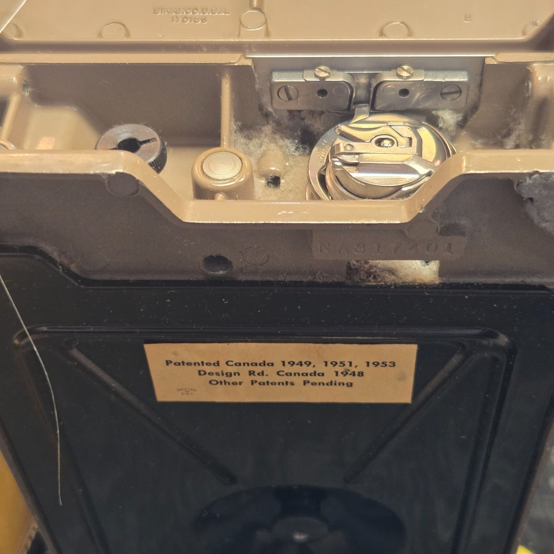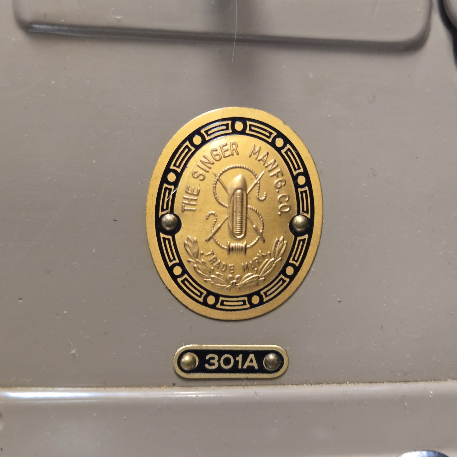 Singer Model 301A sewing machine, serial number NA317401, manufactured in the mid-20th century. Features an aluminum body with a slant-needle design. Includes original box and accessories such as foot pedal, bobbins, and presser feet. Known for its straight-stitch capability and portability.